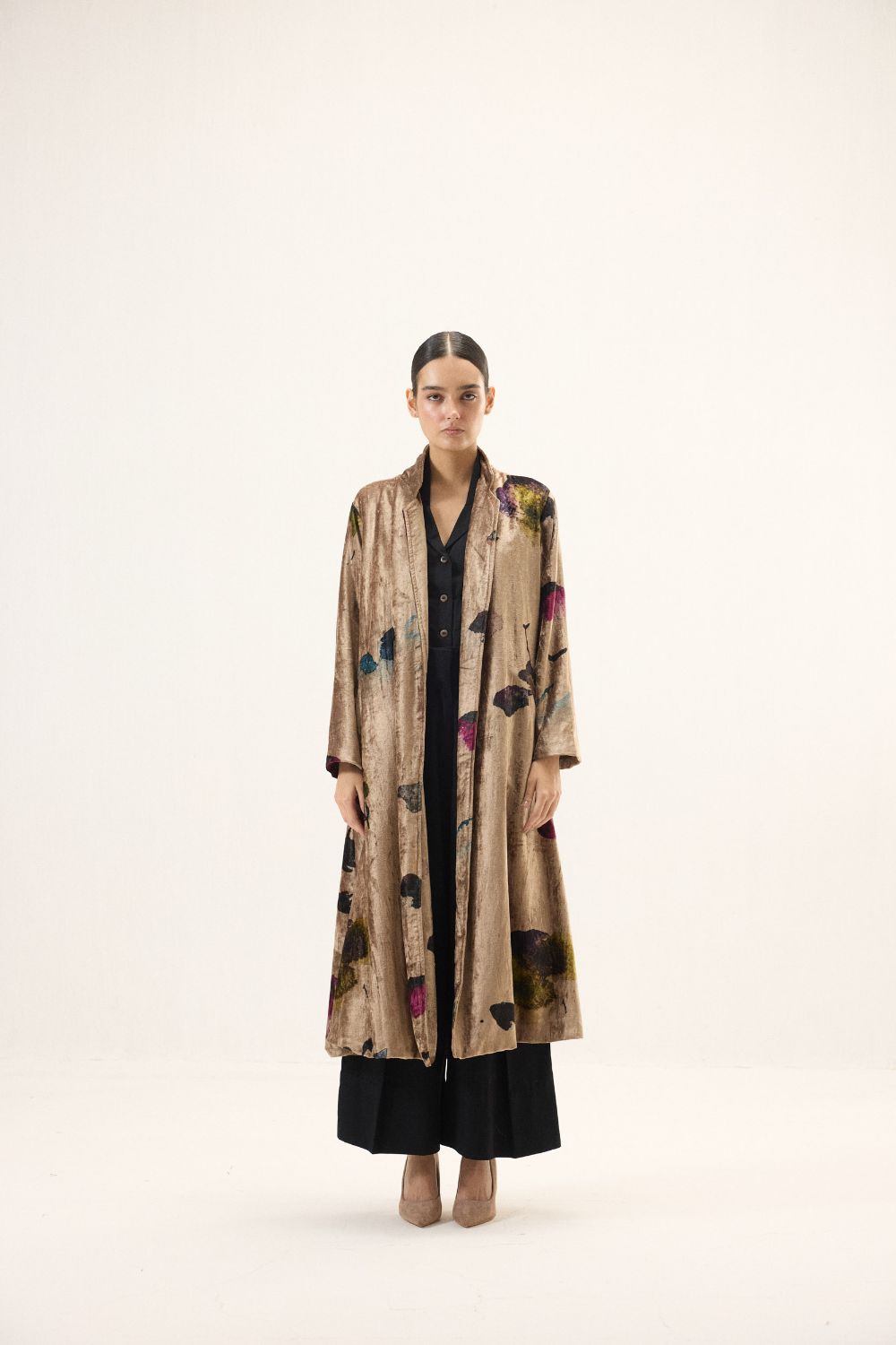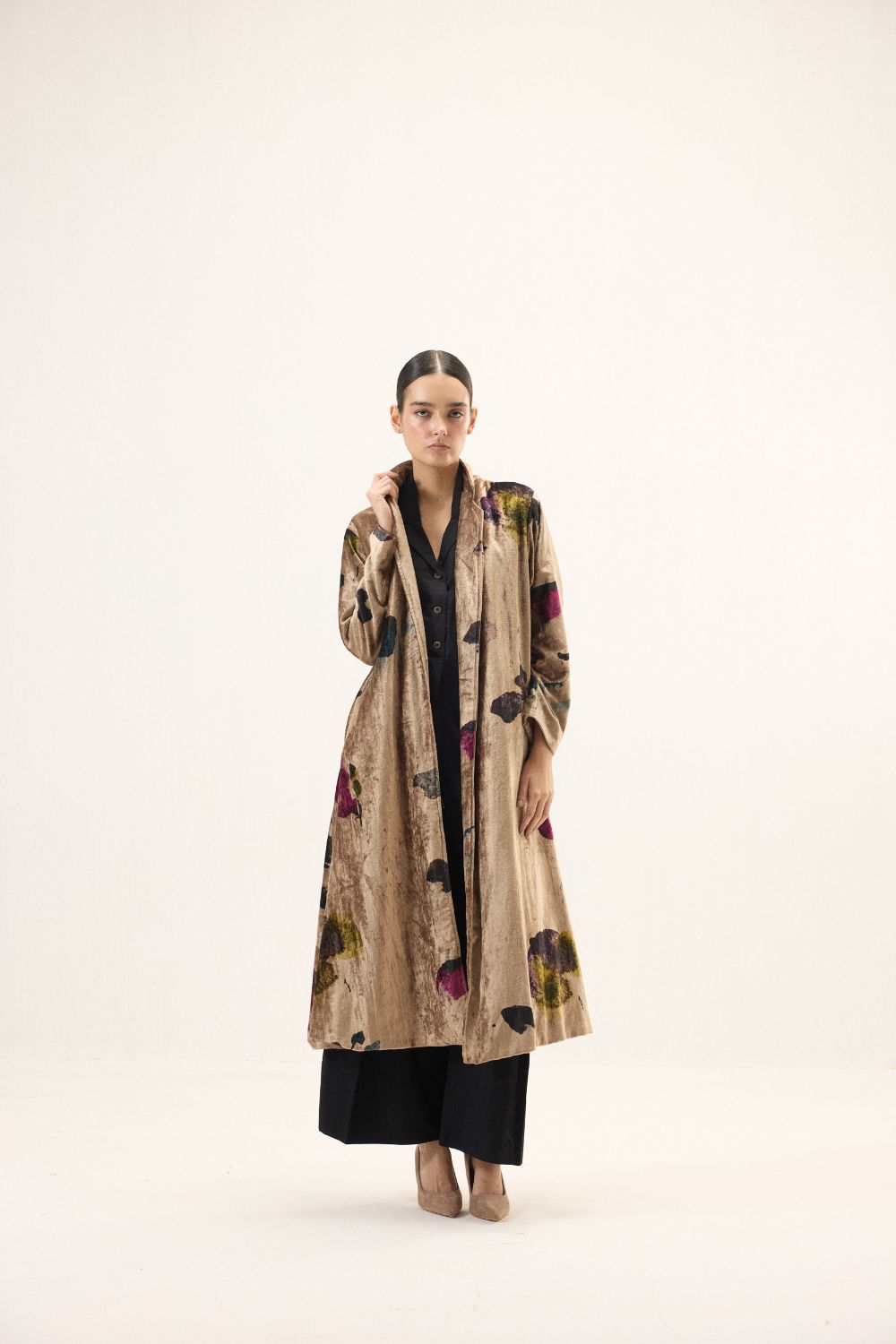 This copper gold trench coat is designed to stand out with effortless grace. Crafted in velvet, it catches the light beautifully while offering a refined, fluid drape. Bold, vibrant floral prints unfold across the surface, creating a dramatic yet balanced contrast against the rich golden base. Finished with full-length sleeves and a versatile silhouette, it is perfect for layering, adding statement elegance to any ensemble. Lining: Brown Base and Beige Polka Dots Lining