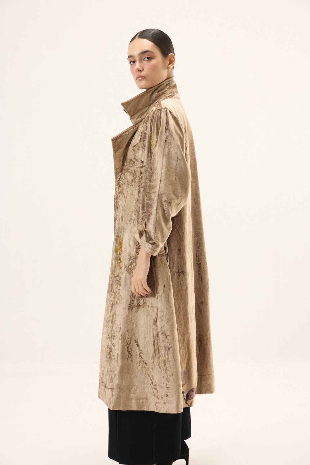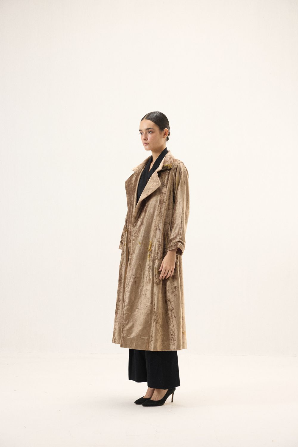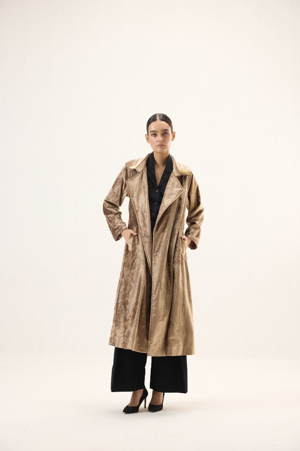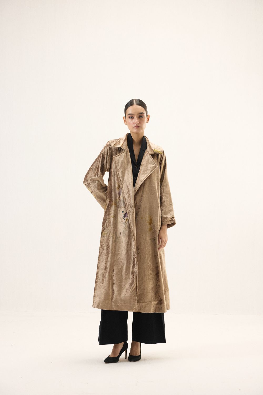 Exuding warmth and sophistication, this copper gold hued velvet trench coat is a timeless statement piece. Full-length sleeves and a flowing silhouette bring effortless elegance, while the subtle sheen of the velvet adds a luxurious glow. Dispersed floral prints lend a poetic touch, creating a harmonious balance between classic tailoring and soft, contemporary charm, perfect for moments that call for understated grandeur. Lining: Red Checkered Mul Lining