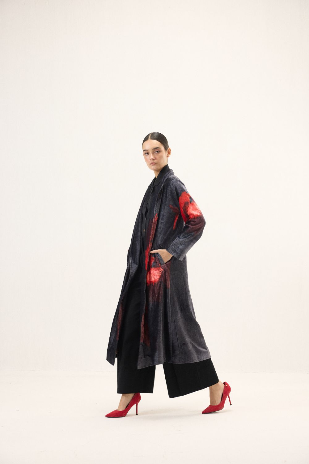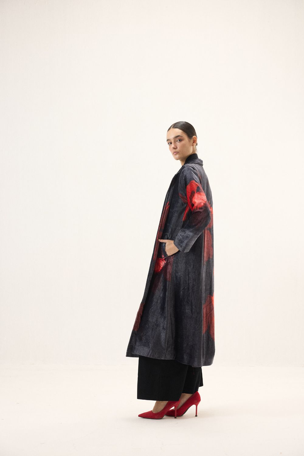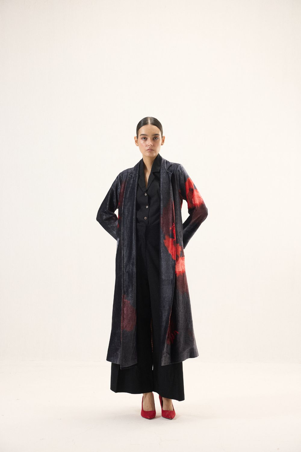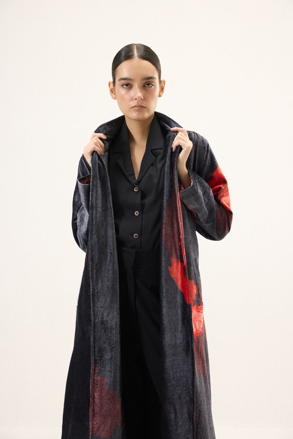 A dramatic interpretation of timeless outerwear, this black velvet trench coat is crafted to make a statement. The plush texture of velvet lends a rich depth, while bold red floral motifs bloom vividly across the dark base, creating a striking contrast. Designed with long sleeves and a fluid silhouette, it layers effortlessly bringing together elegance and refined allure in one distinguished piece. Lining: Red Checkered Mul Lining