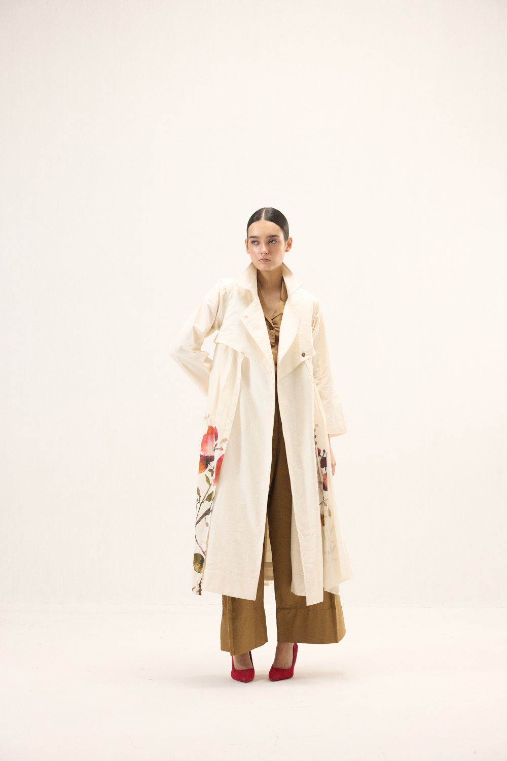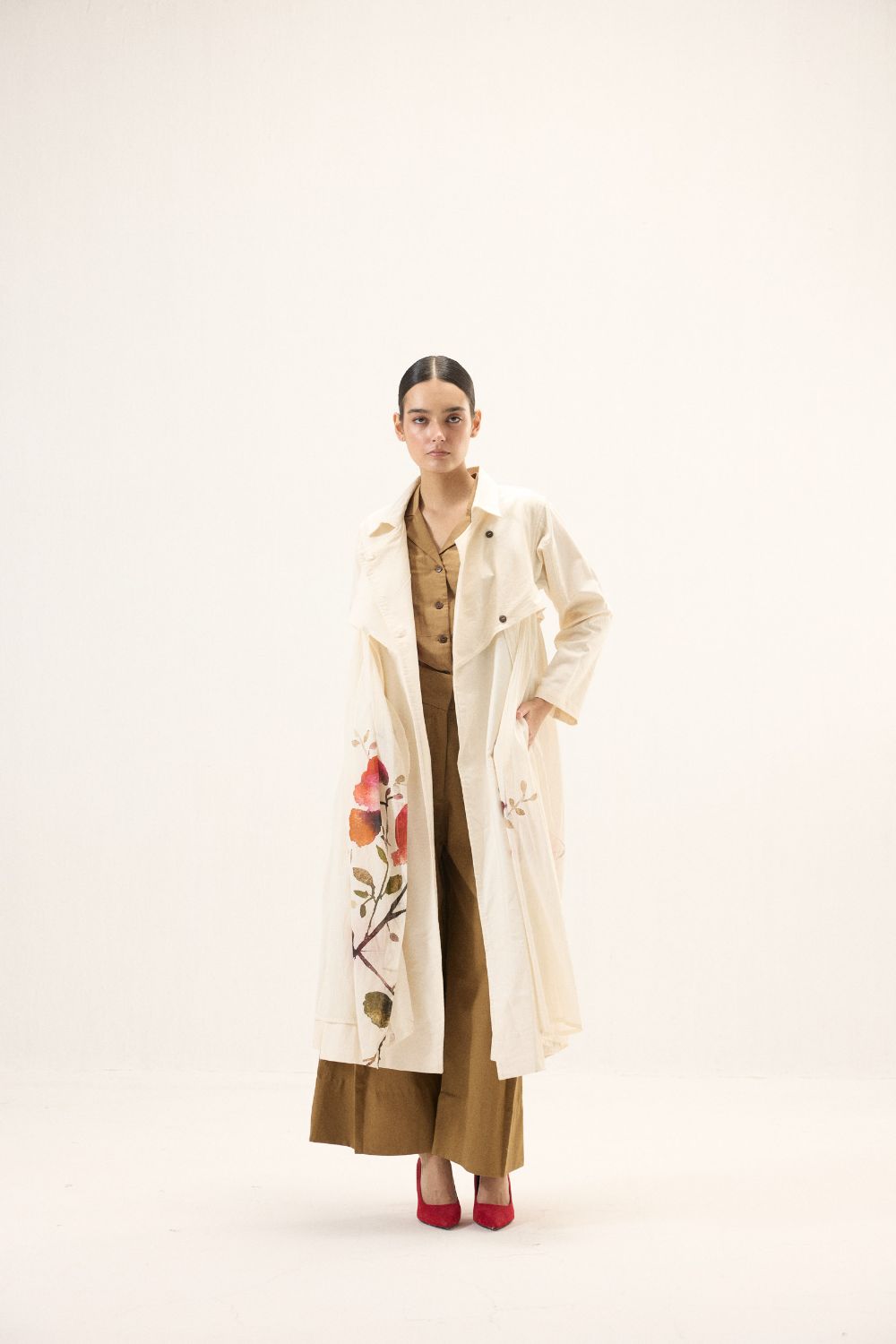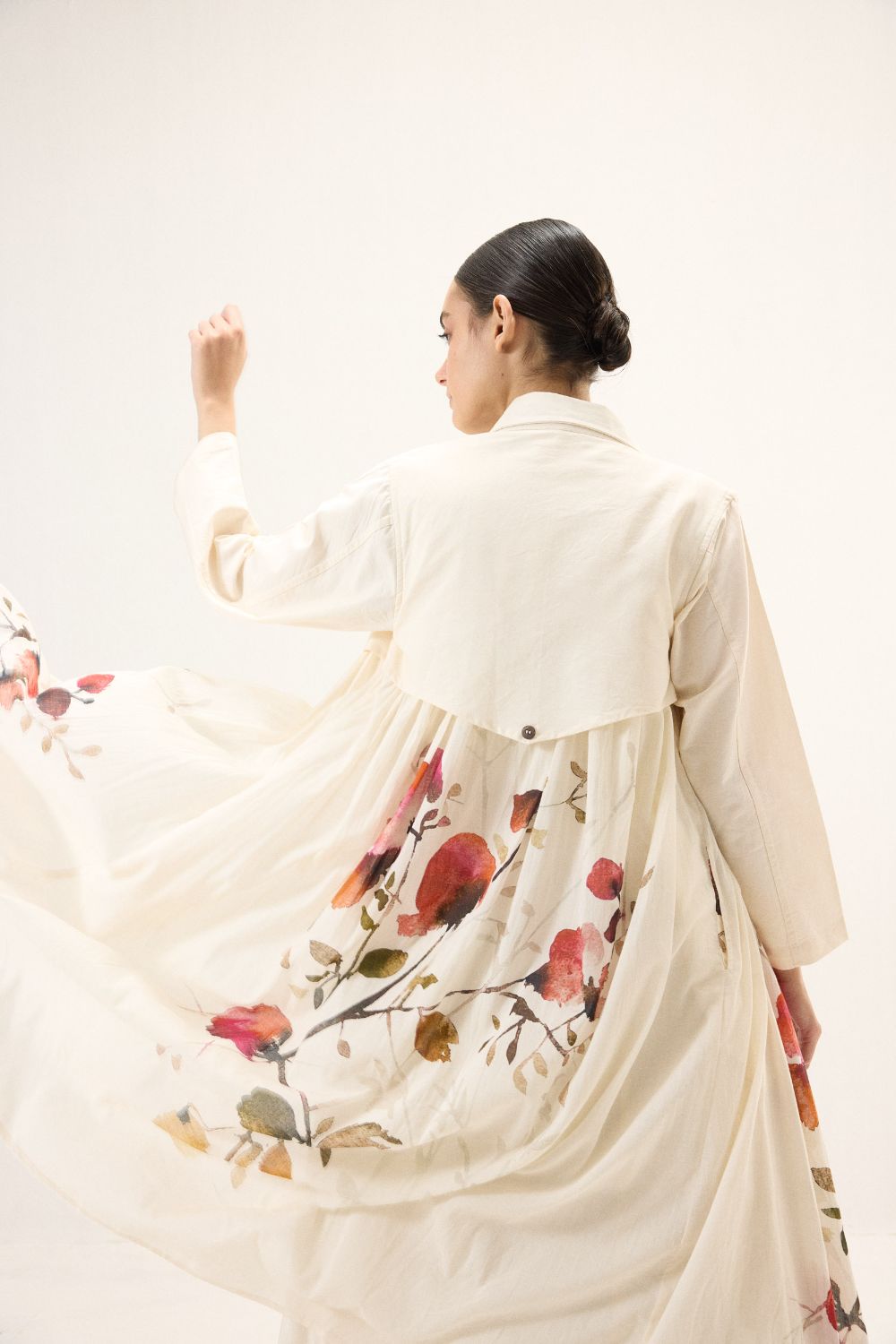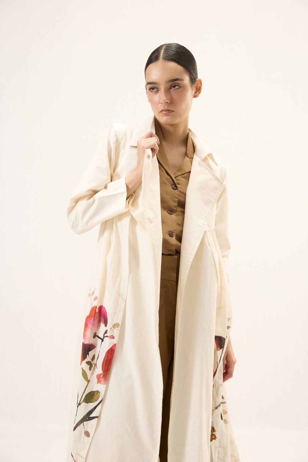 A stunning trench coat adorned with florals and button details, set against a soft white base for a sophisticated and artistic touch. The perfect blend of classic style and modern design. This style is our take on a trench dress crafted in cotton Oxford and fine mul fabric.