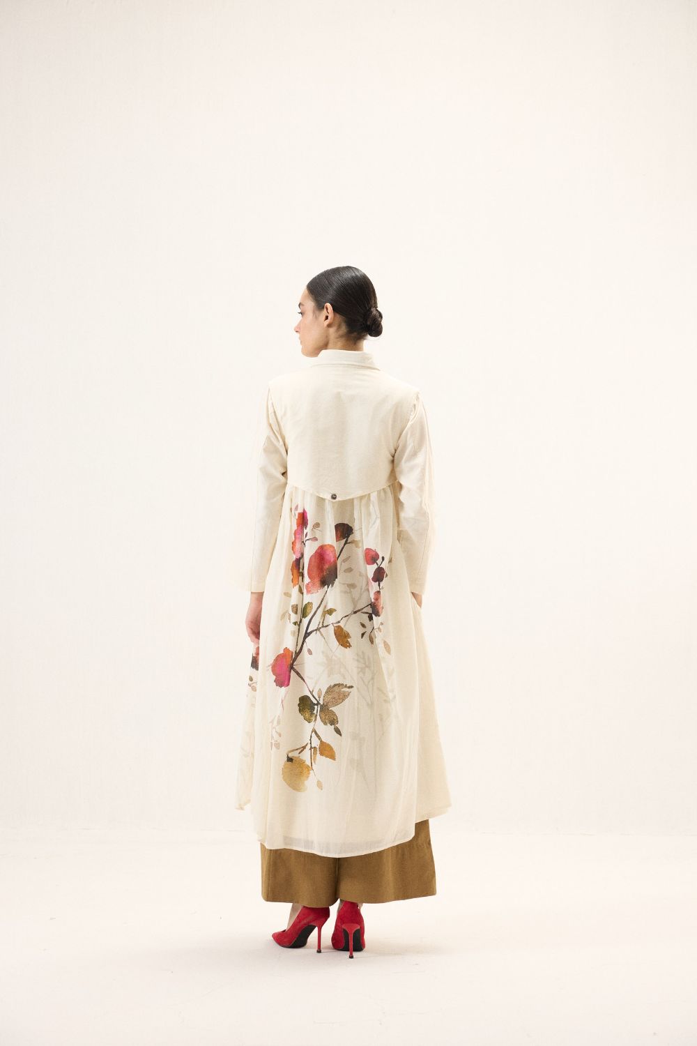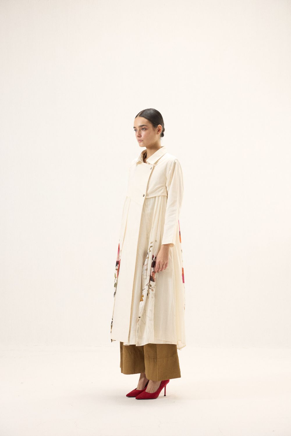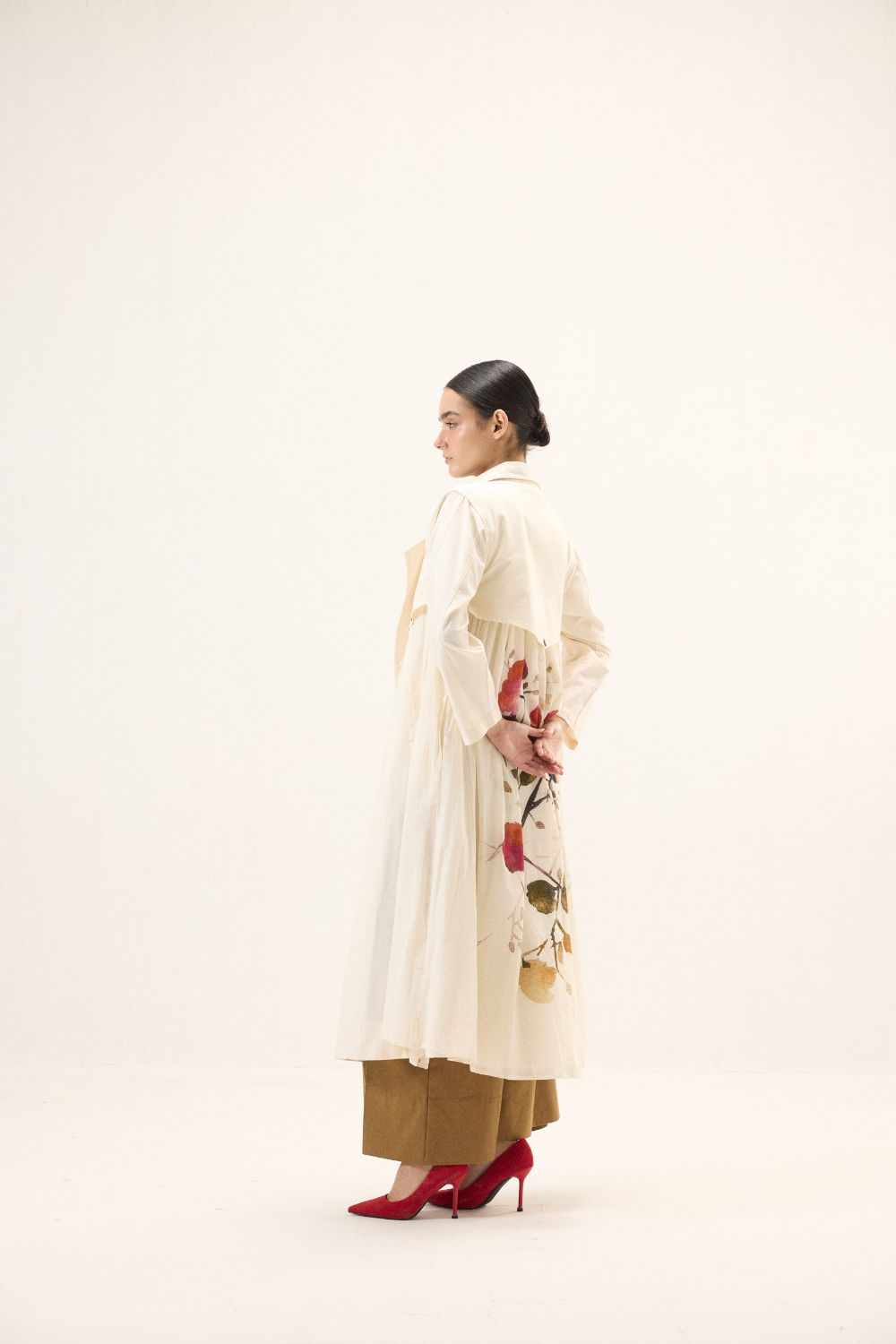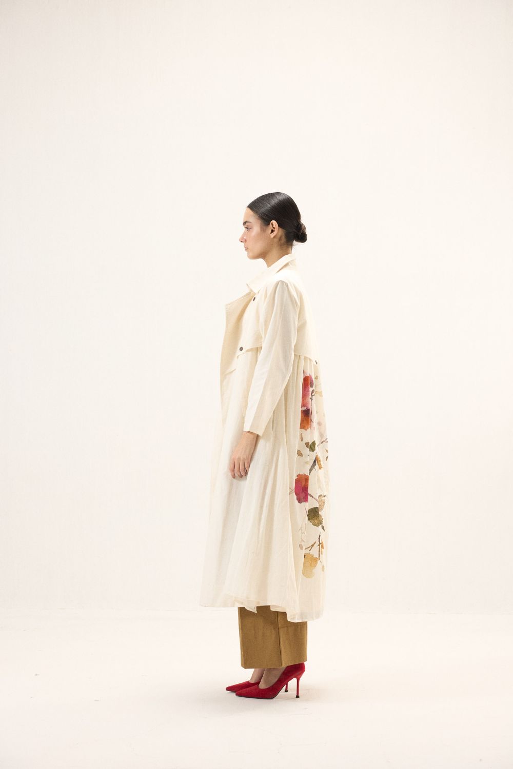 A stunning trench coat adorned with florals and button details, set against a soft white base for a sophisticated and artistic touch. The perfect blend of classic style and modern design. This style is our take on a trench dress crafted in cotton Oxford and fine mul fabric.