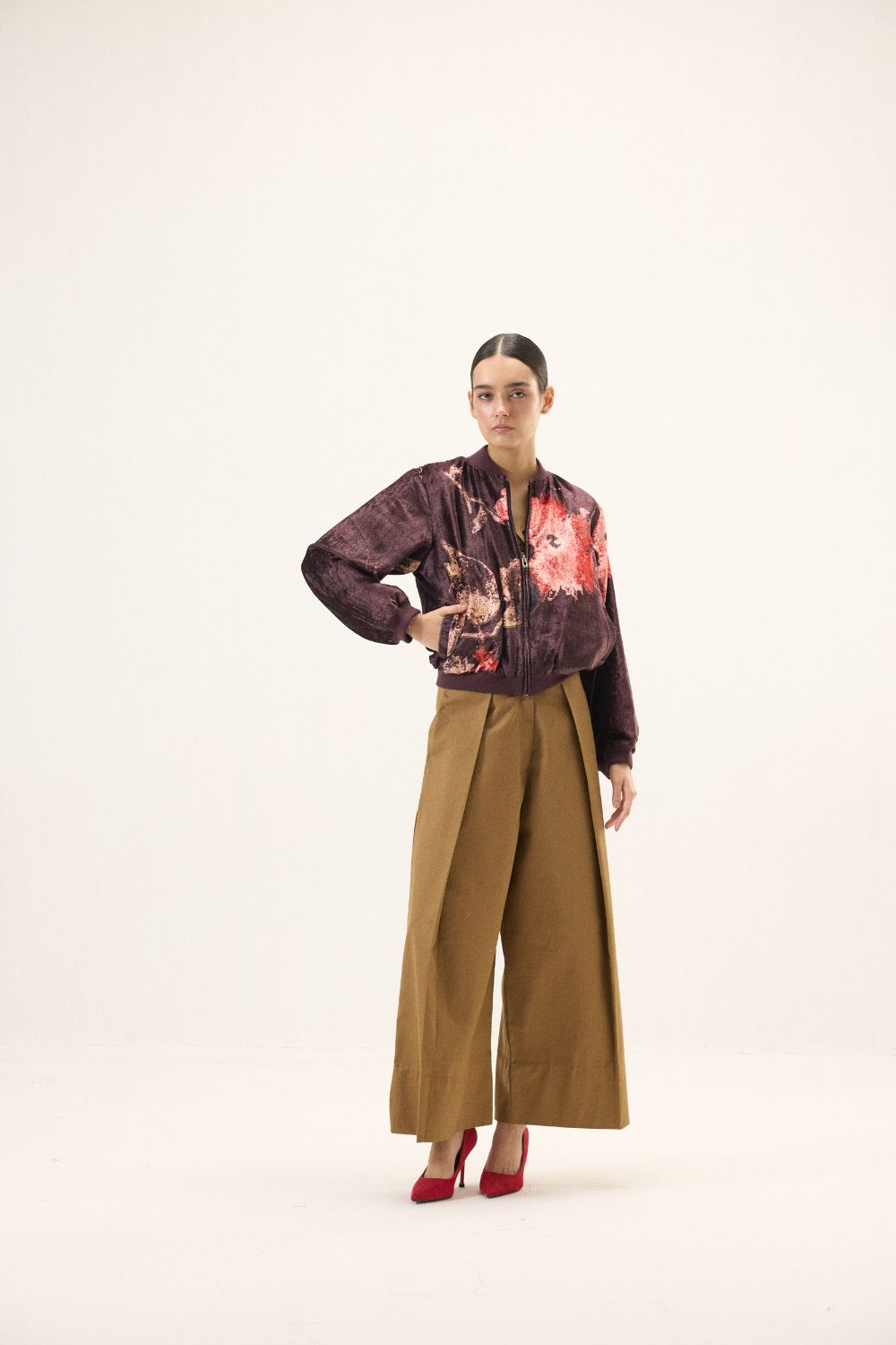 A refined take on contemporary outerwear, this purple velvet bomber jacket is crafted to make a statement. The plush velvet texture adds depth, while bold floral prints across the silhouette lend an artistic and expressive charm. Designed with a front zipper and two functional pockets, it offers ease and versatility.