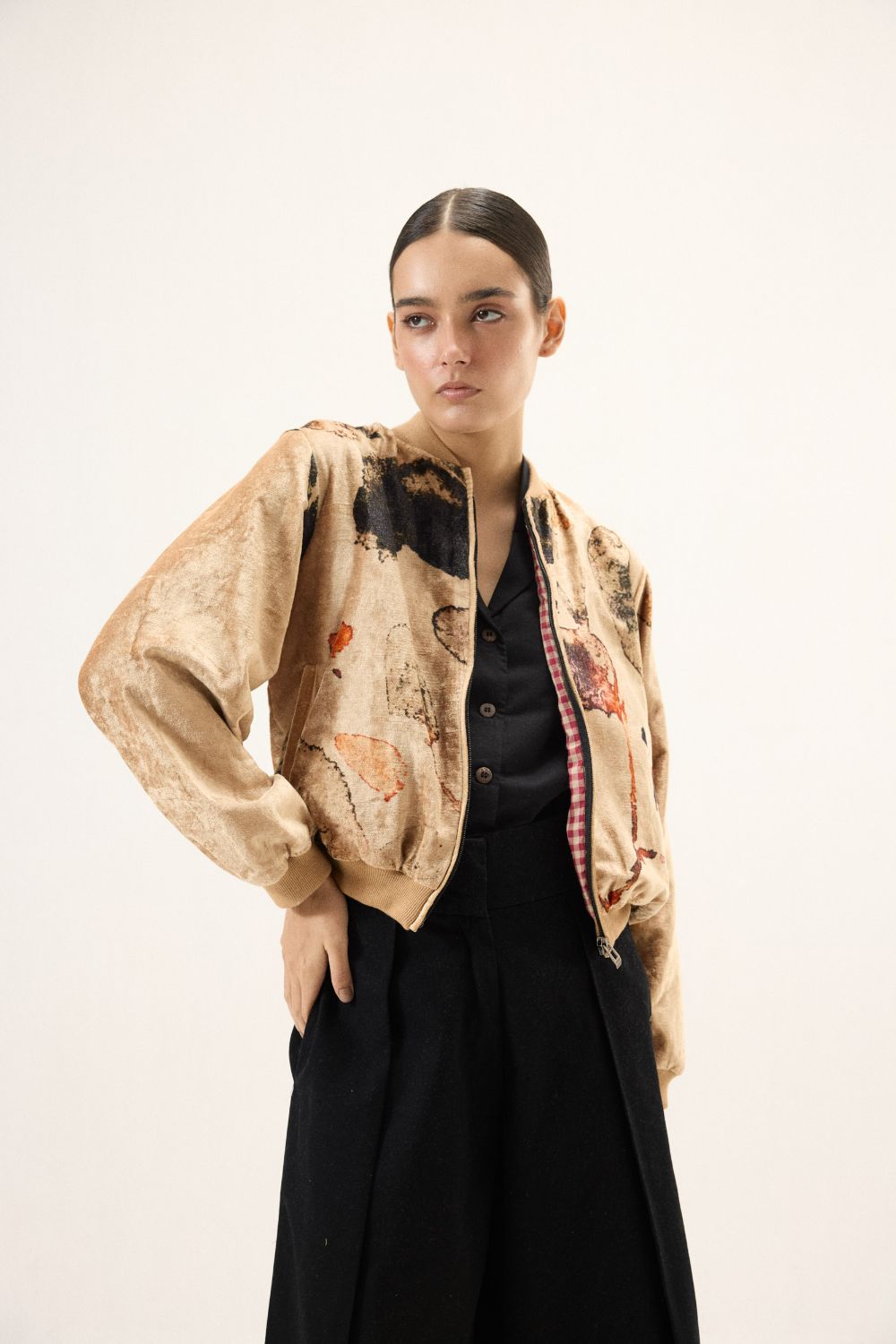 A bold expression of contemporary luxury, this golden-hued velvet bomber jacket is crafted to make a statement. The plush texture and subtle sheen of the velvet bring richness, while large abstract prints create a striking visual narrative across the surface. Designed with a clean front zipper and two functional pockets, it balances artistic flair with everyday ease. Lining: Red Checkered Mul Lining