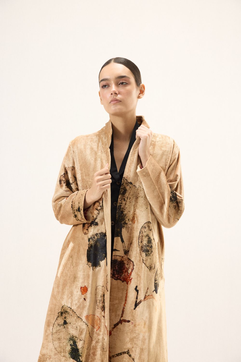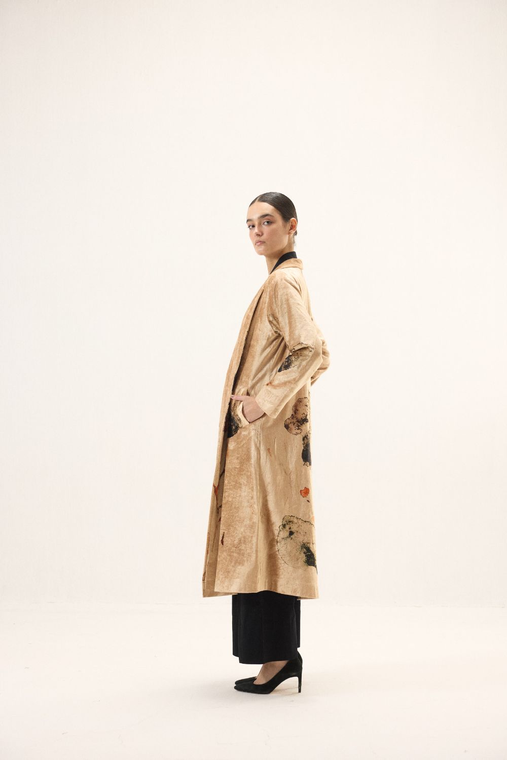 Crafted in rich golden velvet, this trench coat is a statement of quiet opulence. The fabric’s natural sheen lends a luminous depth, while bold abstract florals across the surface, create a striking visual contrast. Designed with long sleeves and a fluid silhouette, it layers effortlessly, balancing artistic expression with timeless elegance for a truly elevated outerwear piece. Lining: Red Checkered Mul Lining