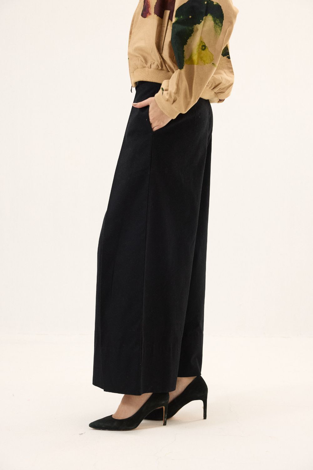 Expertly tailored in dyed twill, these black pleated trousers offer a refined balance of structure and ease. The front pleats add movement to the silhouette, while two functional pockets enhance everyday practicality. Finished with a clean drape, this versatile piece is designed to anchor a modern wardrobe with elegance and timeless appeal.