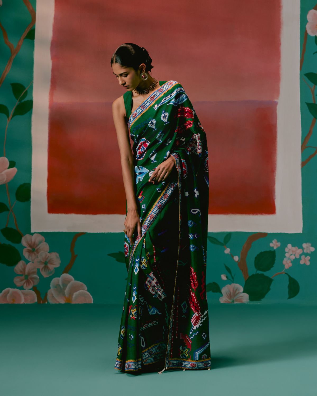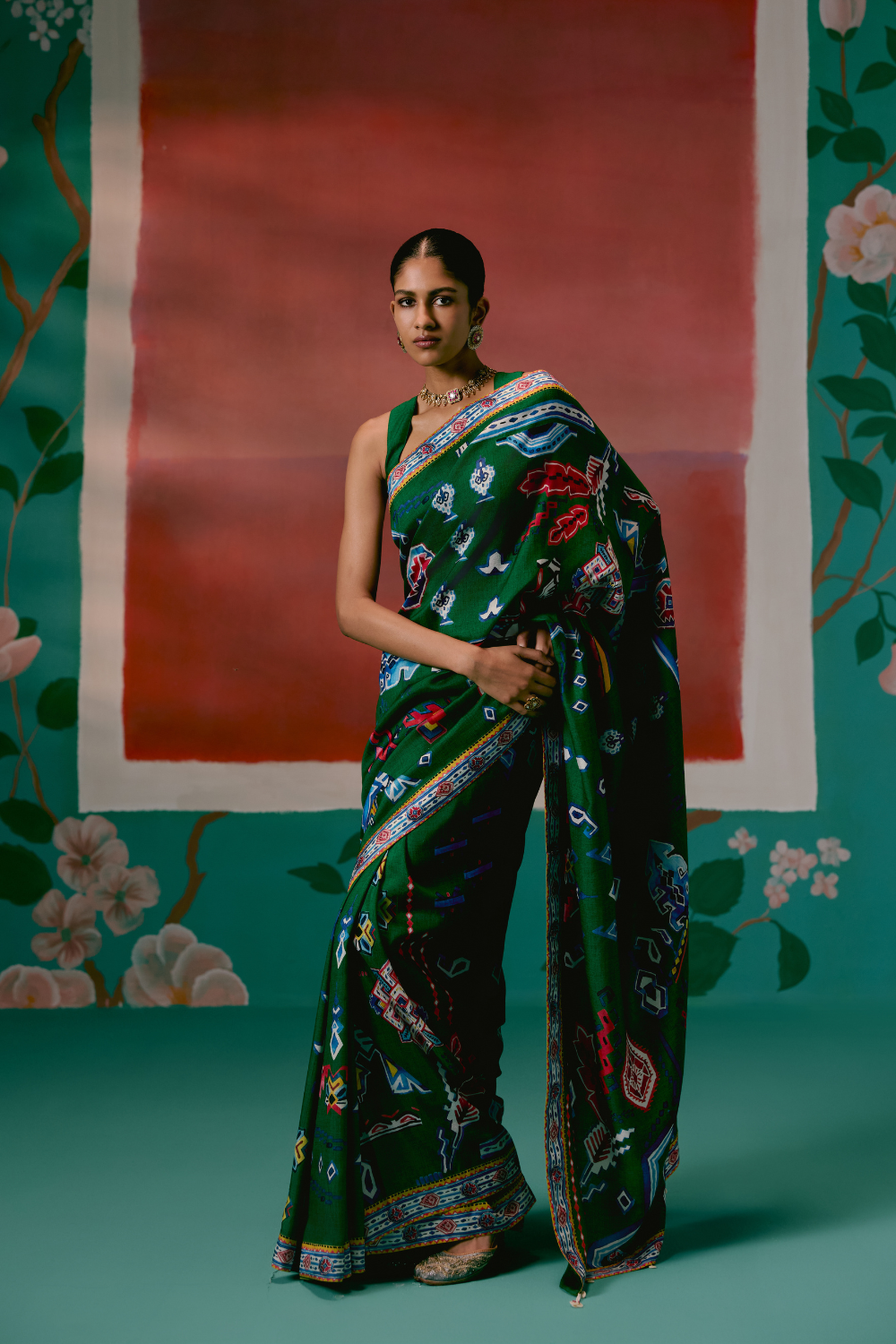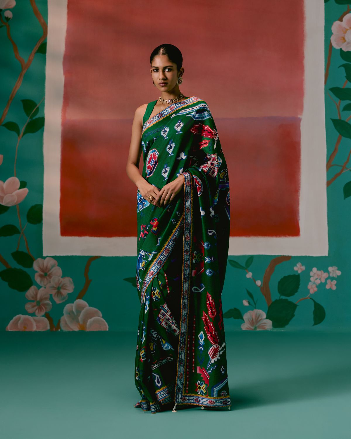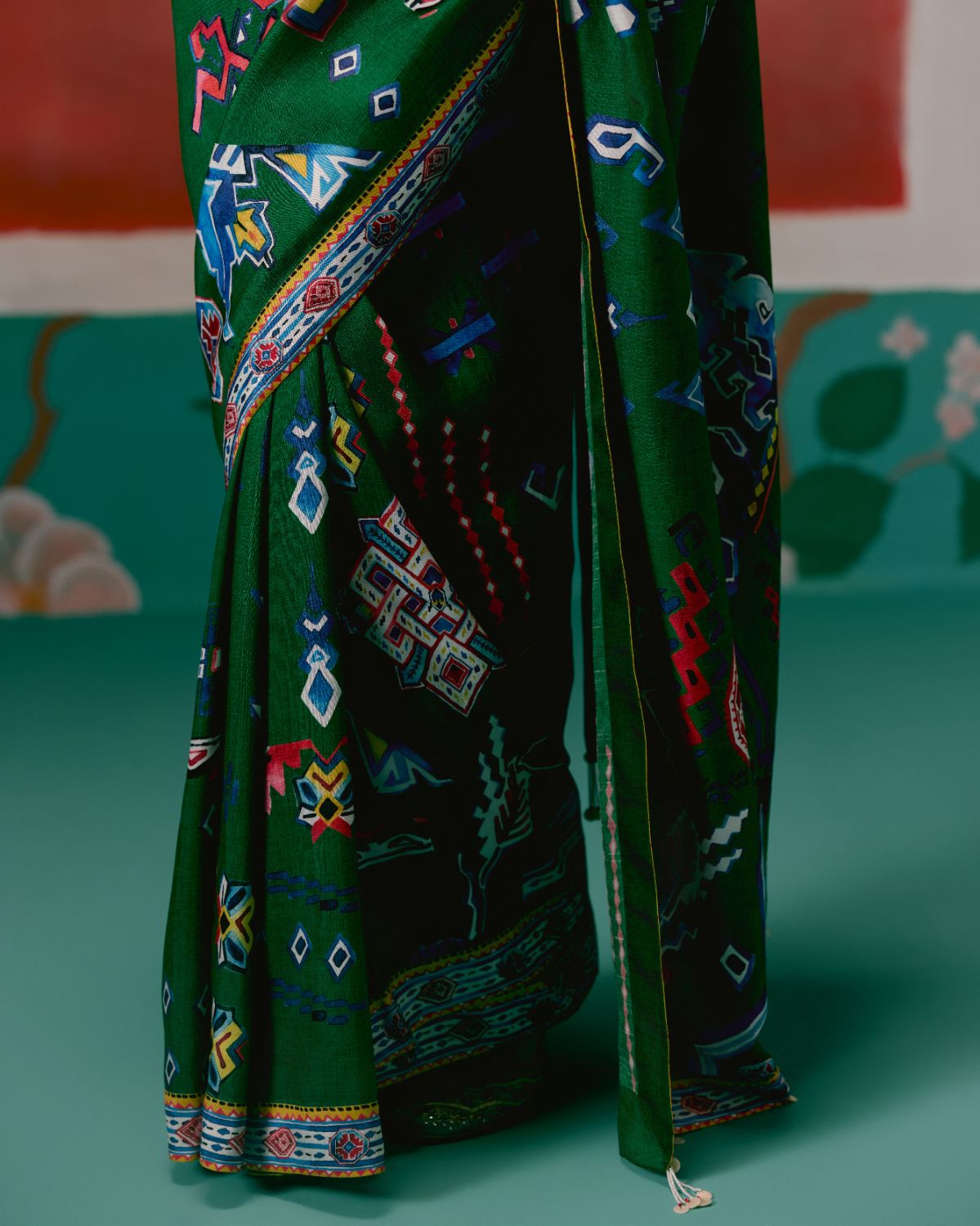 Infused with a contemporary edge, this saree is crafted in a green base enhanced by striking Aztec-inspired prints. The fluid silhouette is balanced with artisanal finishing, as the pallu is adorned with delicate hangings that add texture and movement, giving the drape a festive flair.