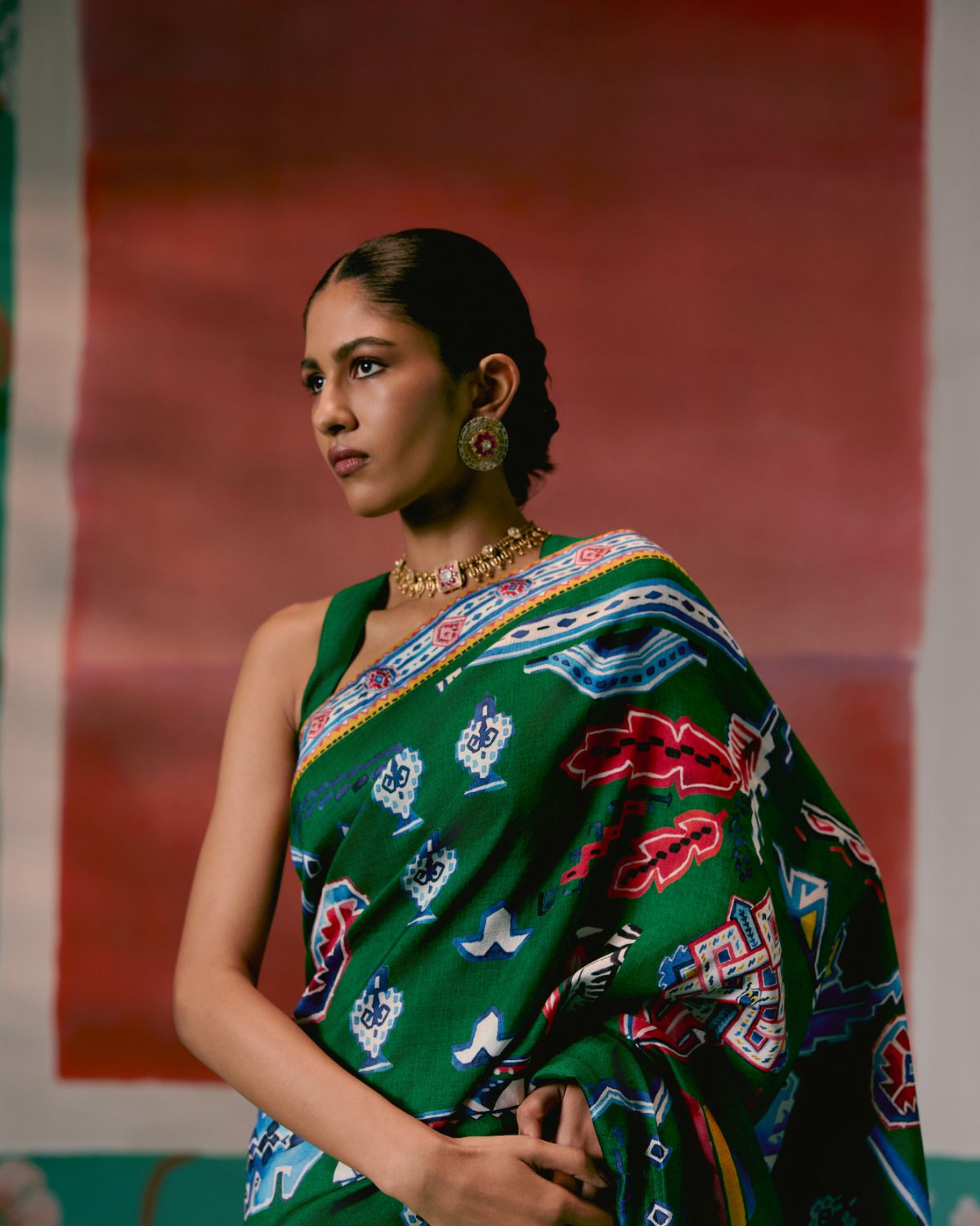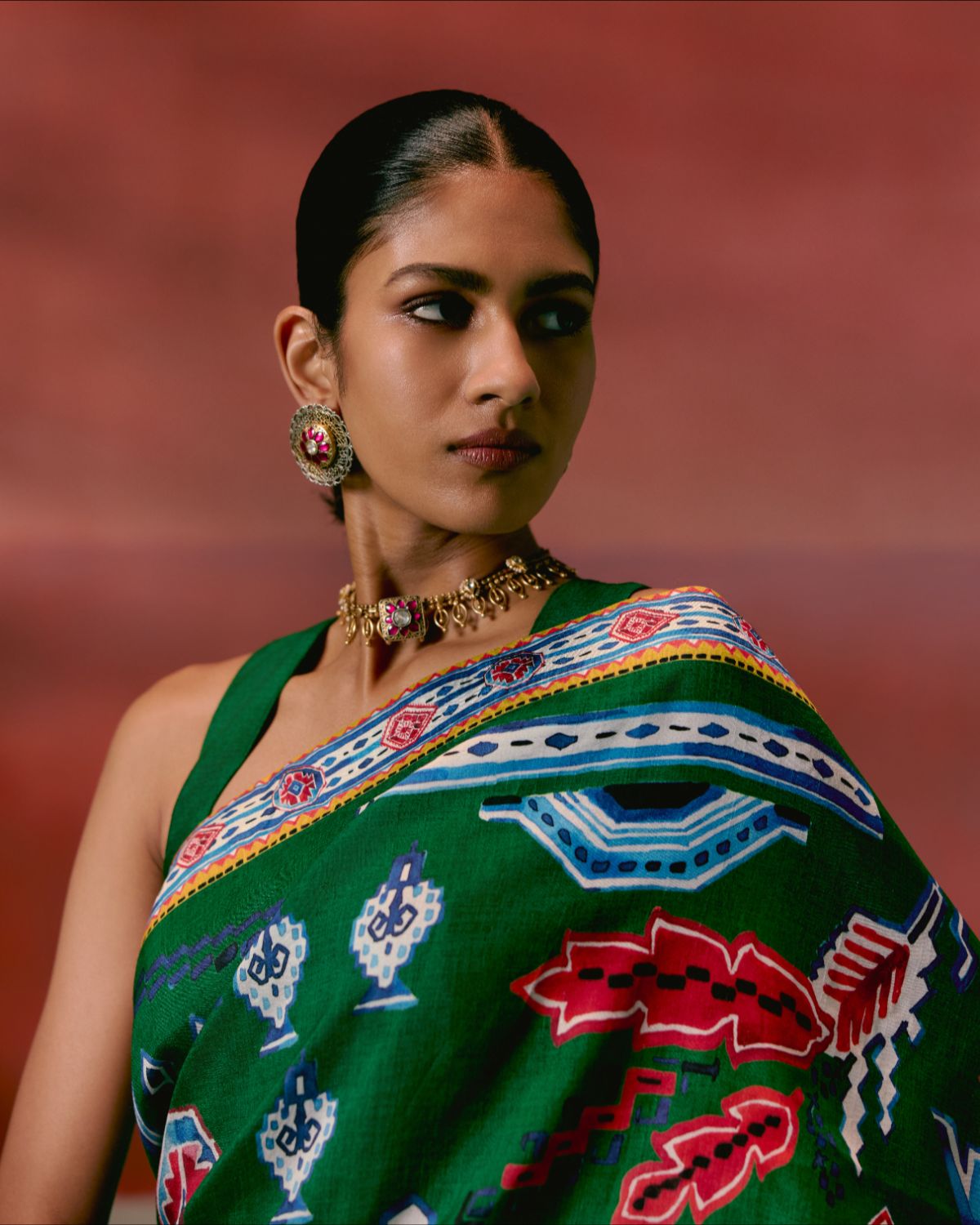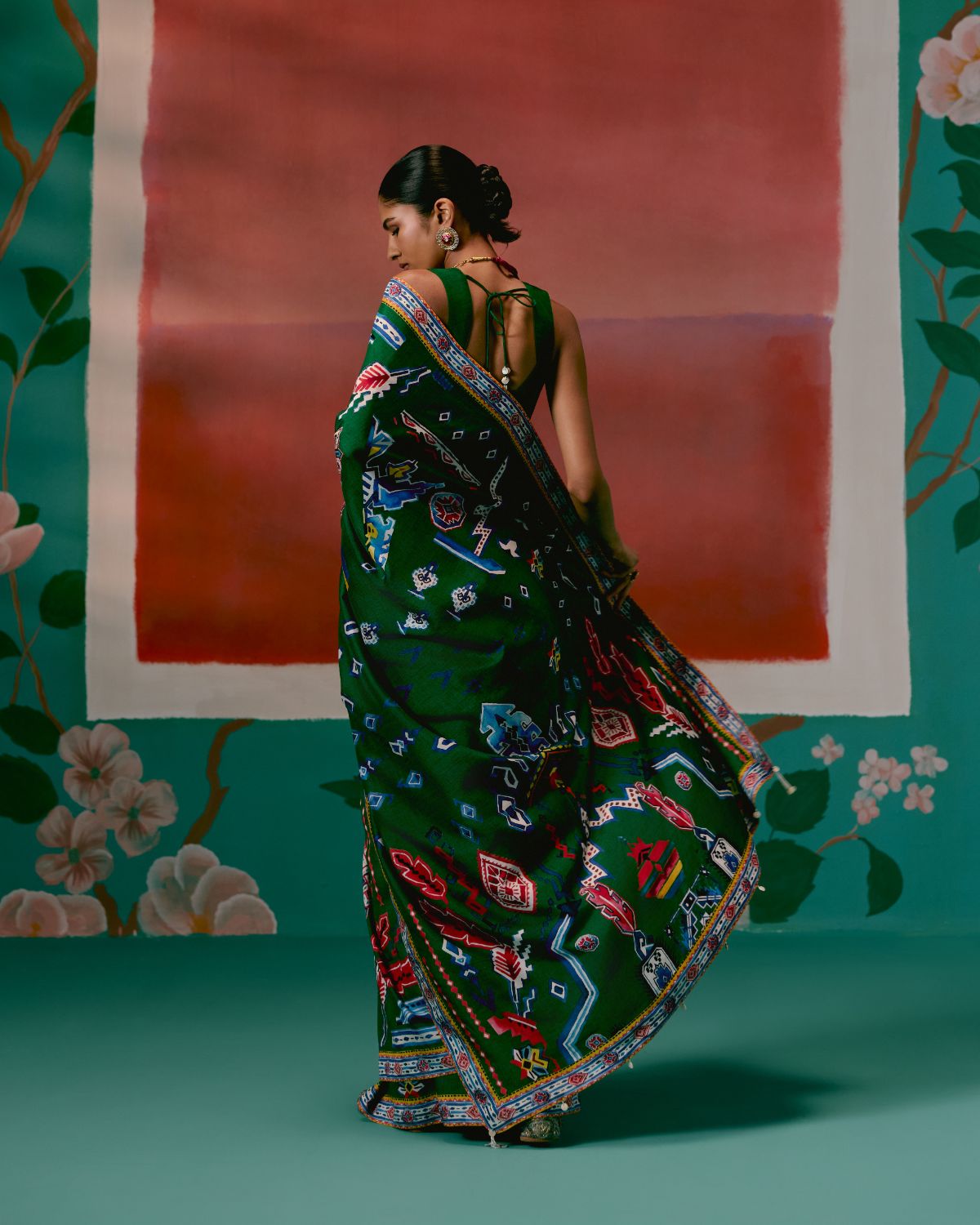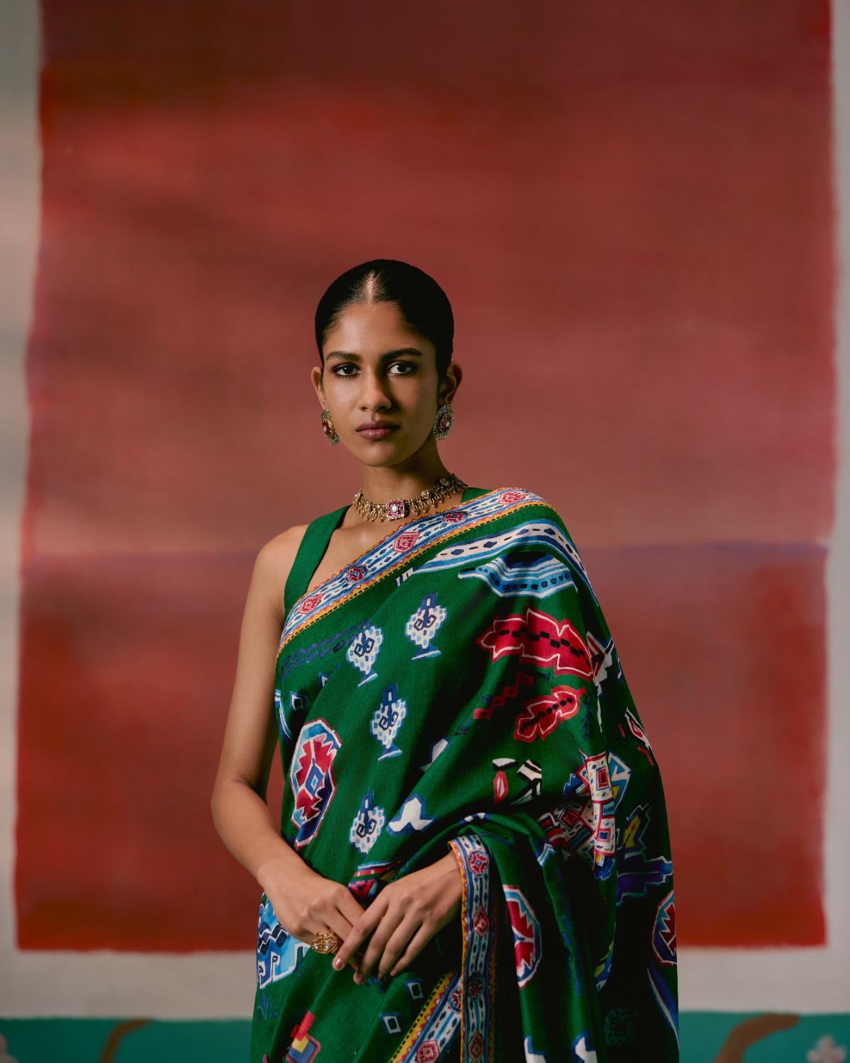 Infused with a contemporary edge, this saree is crafted in a green base enhanced by striking Aztec-inspired prints. The fluid silhouette is balanced with artisanal finishing, as the pallu is adorned with delicate hangings that add texture and movement, giving the drape a festive flair.
