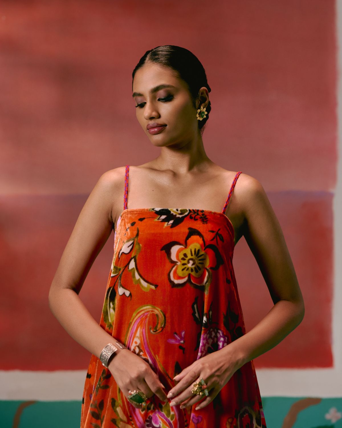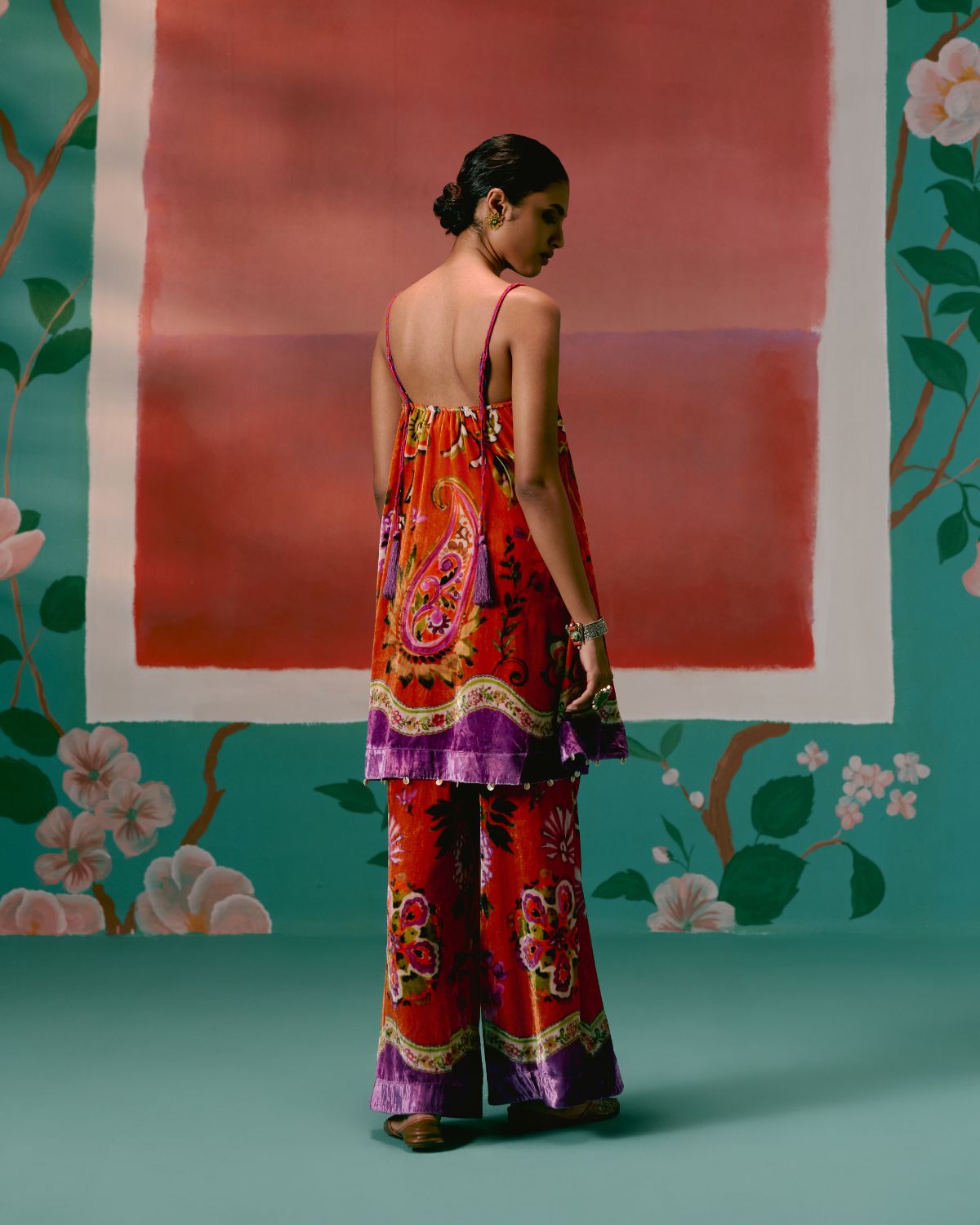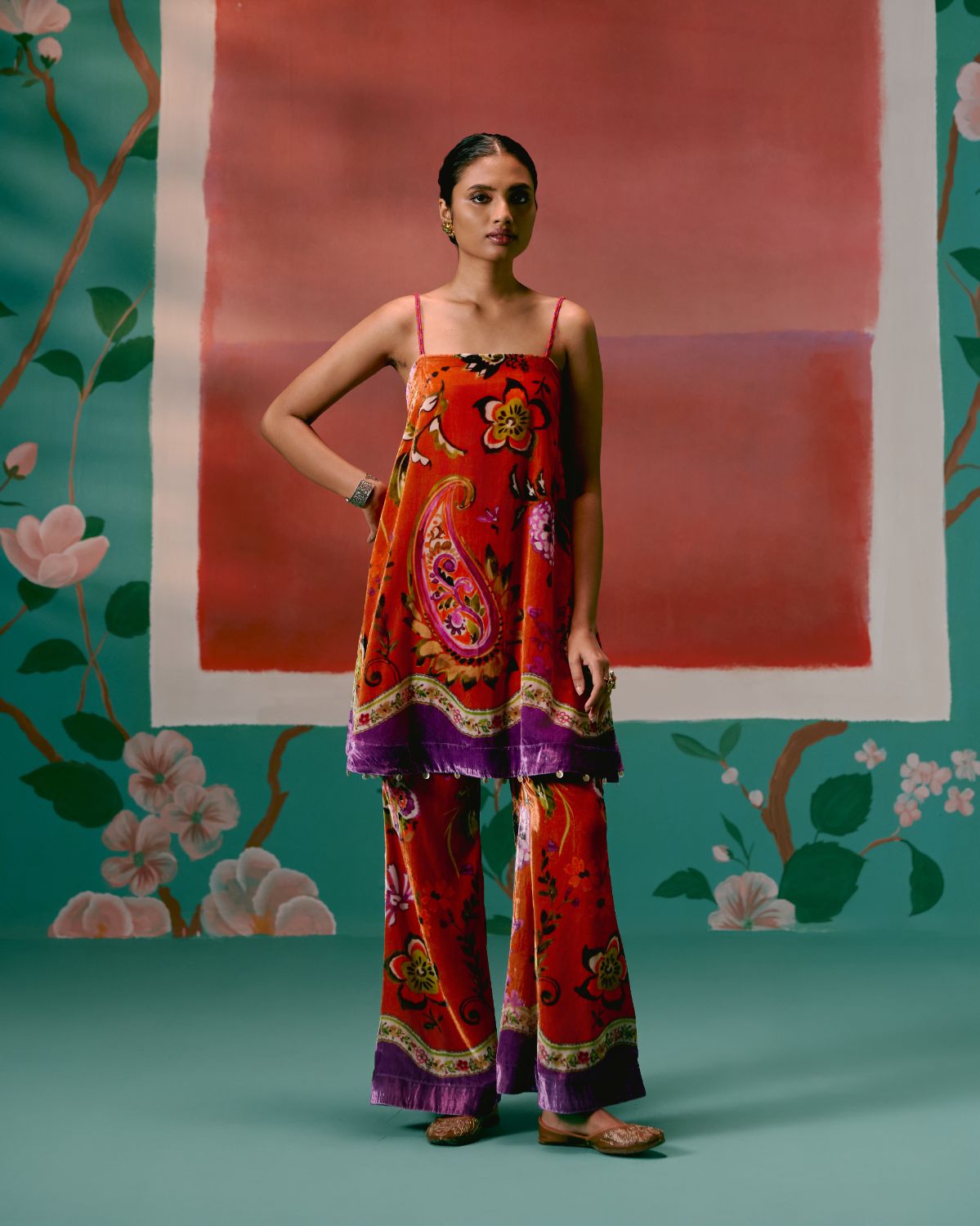 Set on a lively tangerine base with a floral print, the strappy sleeveless kurta is finished with hand-braided silk thread straps, adjustable with tassel tie-ups for a playful touch. An inbuilt bustier with a smocked back and elasticated front waist offers comfort and structure, while shell-and-metal hangings along the hemline add artisanal detail. Paired with flared bell-bottom pants and a printed organza dupatta, this set is made for statement-making celebrations.