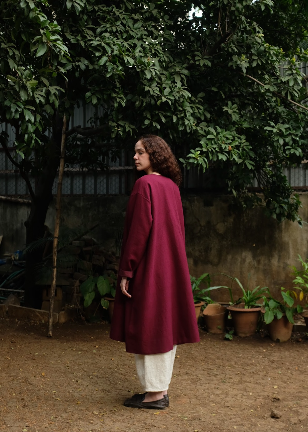 100% merino wool woven by hand in a diamond weave, specially crafted to form a warm winter layer. Long and oversized classic coat with a mulberry silk yoke, large pockets and wool buttons