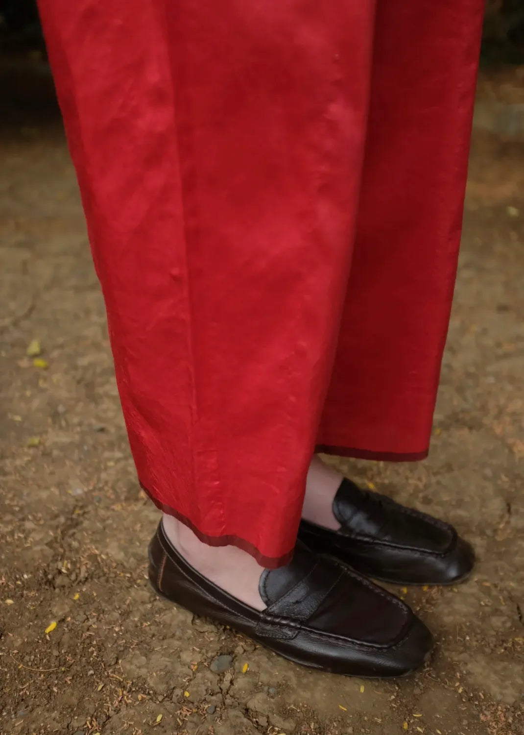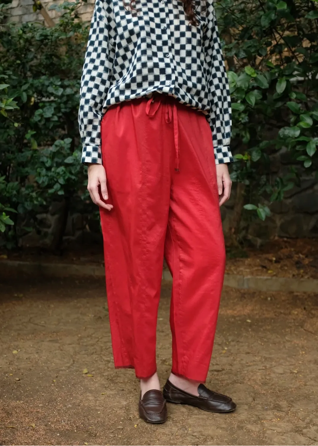 Our staple 'Brooke' pants that are simply dressy pyjamas, crafted in a new textile. Oversized but elegantly cut in a blend of handwoven mulberry silk and light - weight merino wool fastened at the waist with a drawstring for a complete comfort fit. The pants come with 2 large cross pockets.