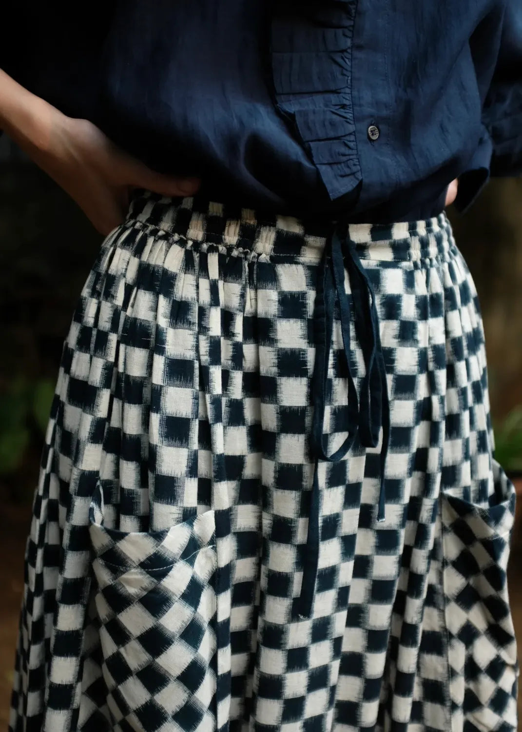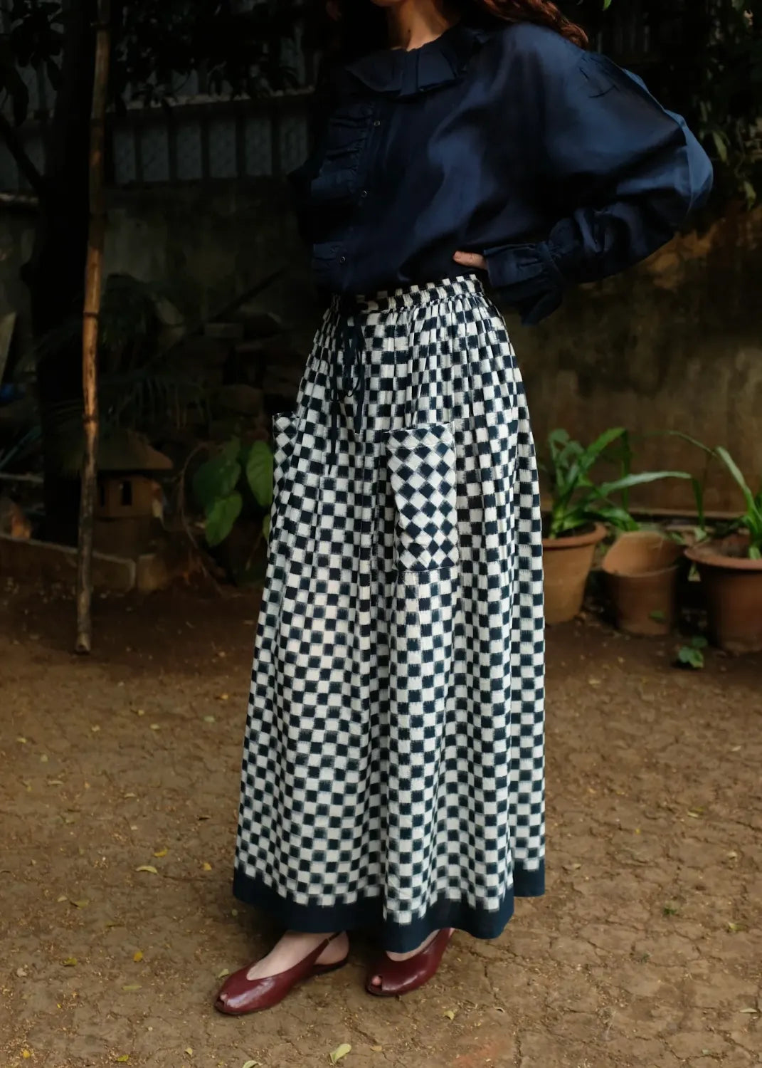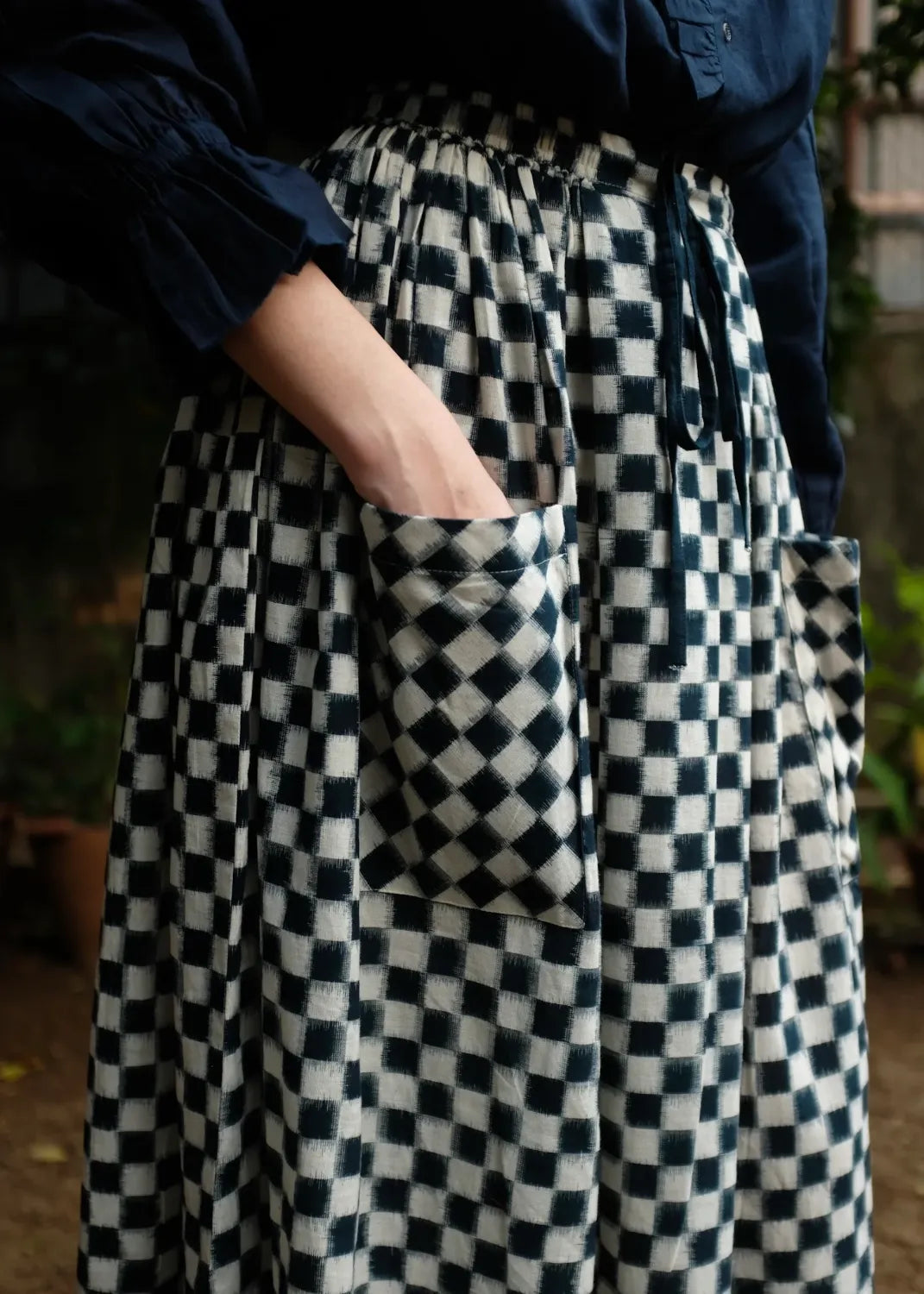 A skirt cut from handwoven Double Ikat, hand dyed using organic indigo dye. Designed with an elasticated waist and adjustable drawstrings, that hold together a bunch of textile that gathers to form our favourite skirt. Finished with functional patch pockets at the front, the piece balances craft, comfort, and quiet character.