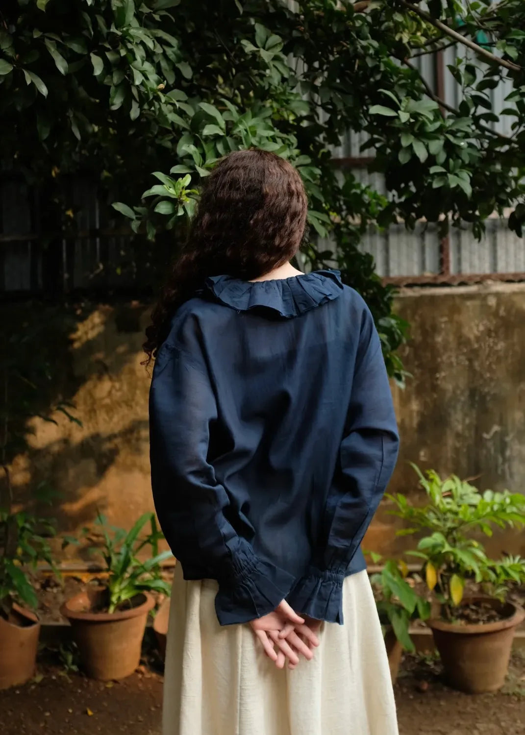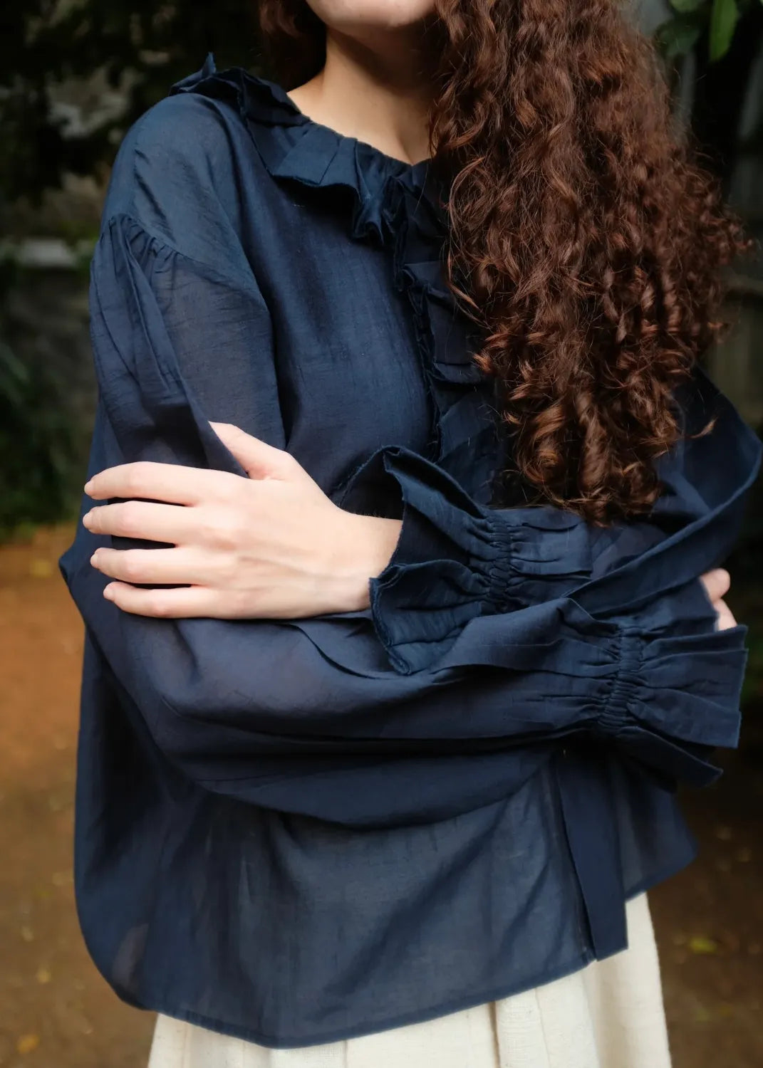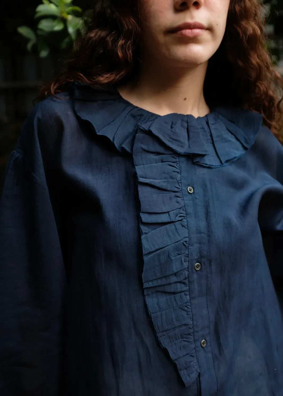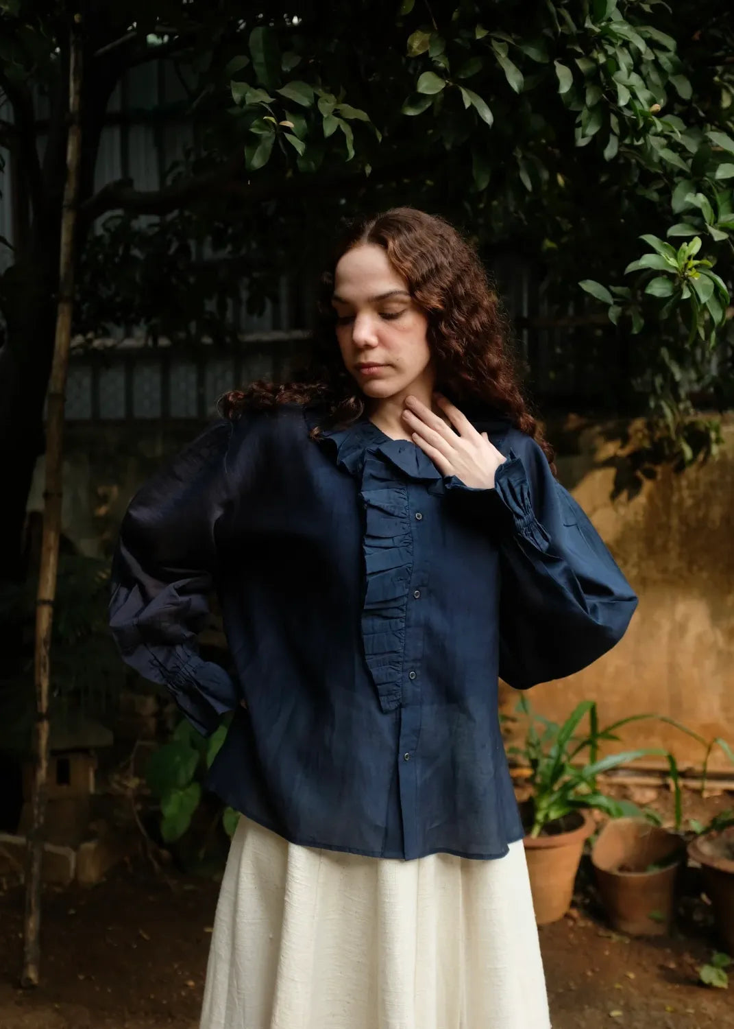 A top crafted from fine handwoven cotton silk, known for its gentle sheerness and lightness. Ruffles trace the neckline and cascade softly down to the placket, creating a sense of movement and ease. The sleeves are gently gathered and finish in elasticated gathers, lending a delicate, feminine finish to this refined silhouette.