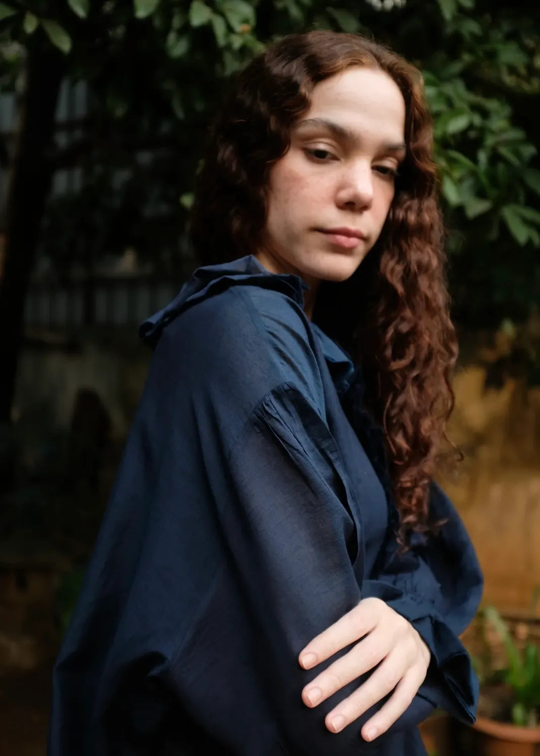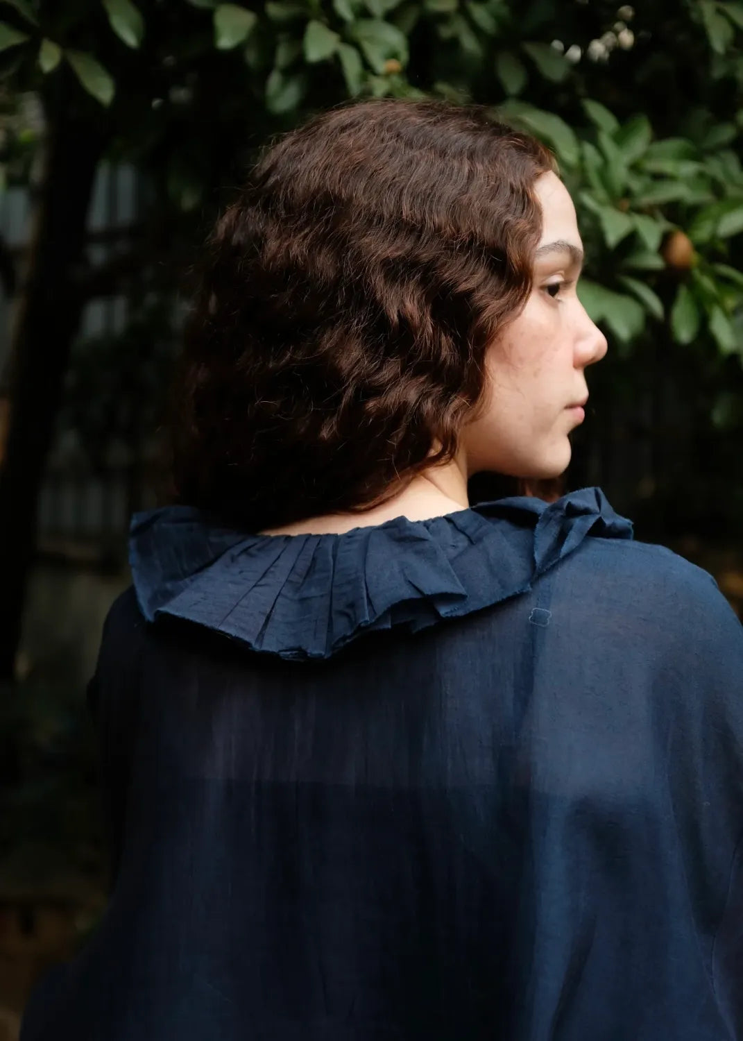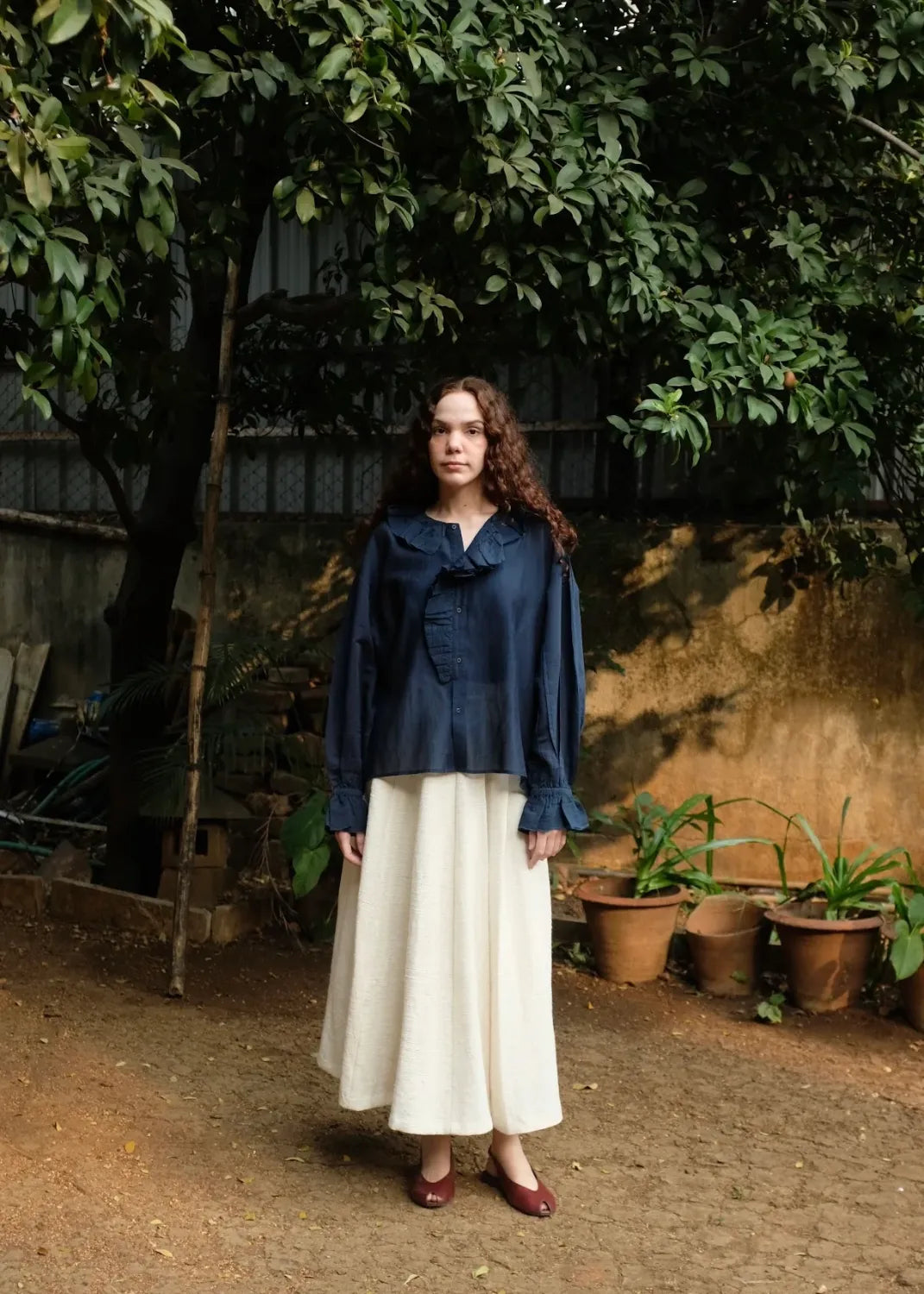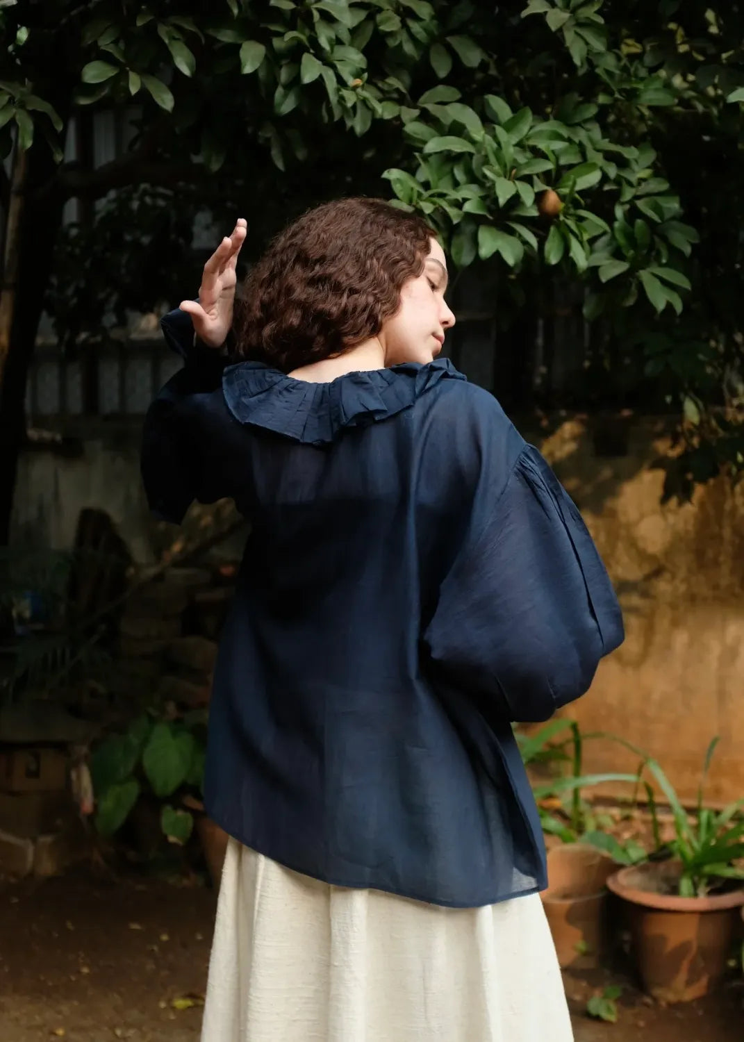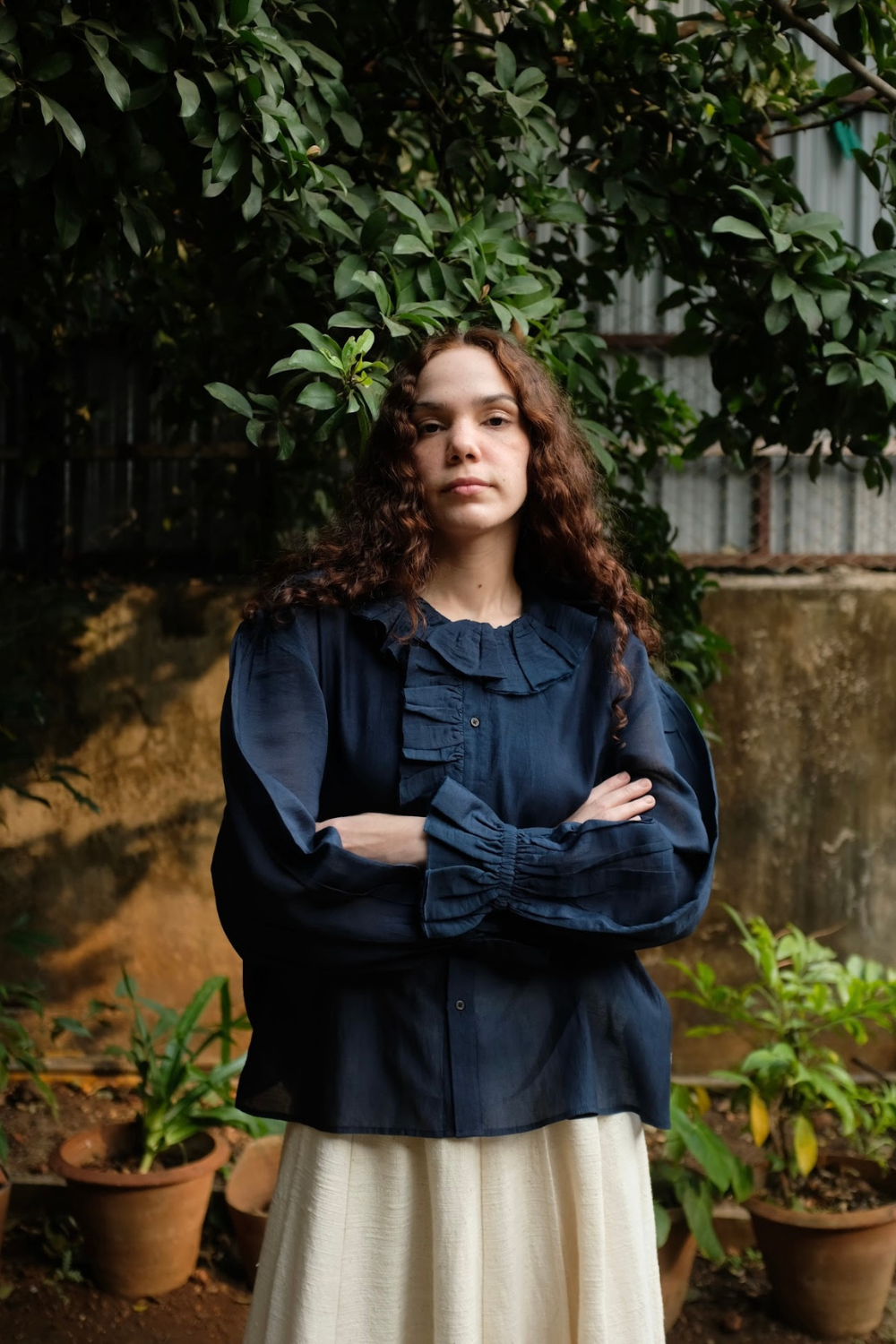 A top crafted from fine handwoven cotton silk, known for its gentle sheerness and lightness. Ruffles trace the neckline and cascade softly down to the placket, creating a sense of movement and ease. The sleeves are gently gathered and finish in elasticated gathers, lending a delicate, feminine finish to this refined silhouette.
