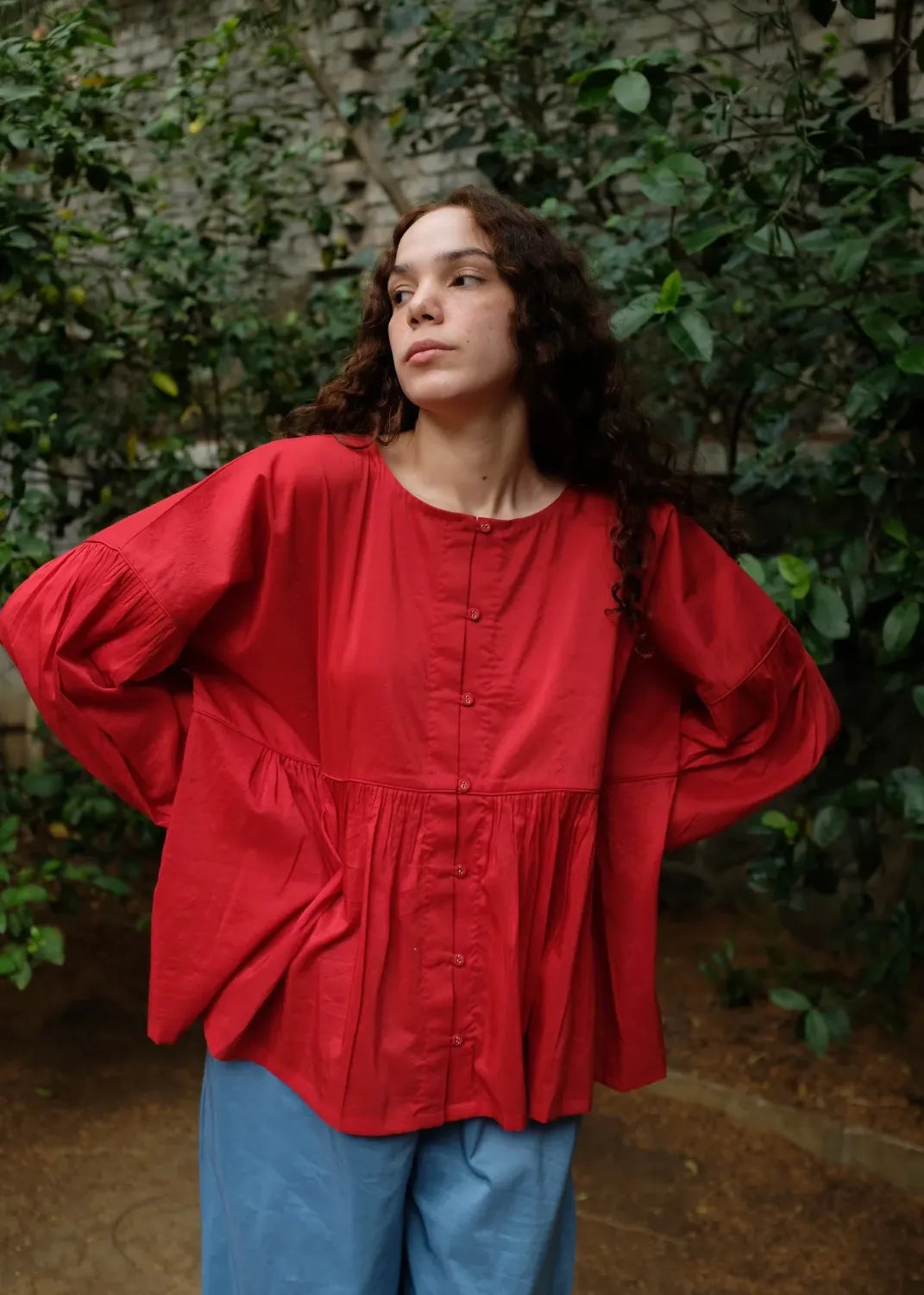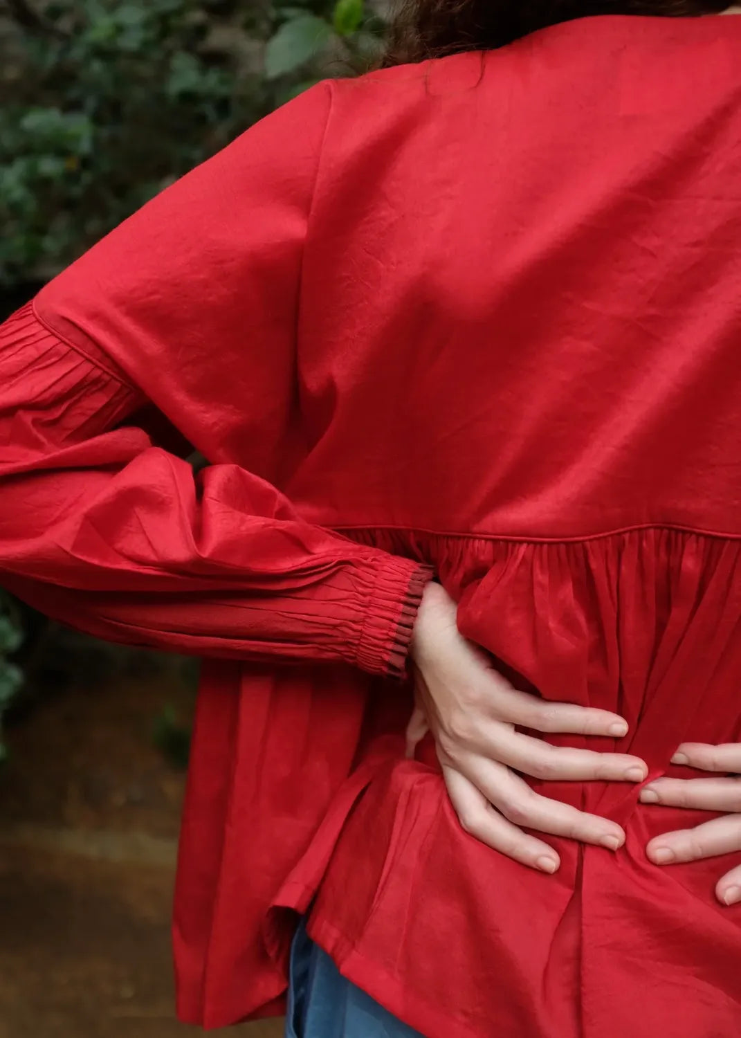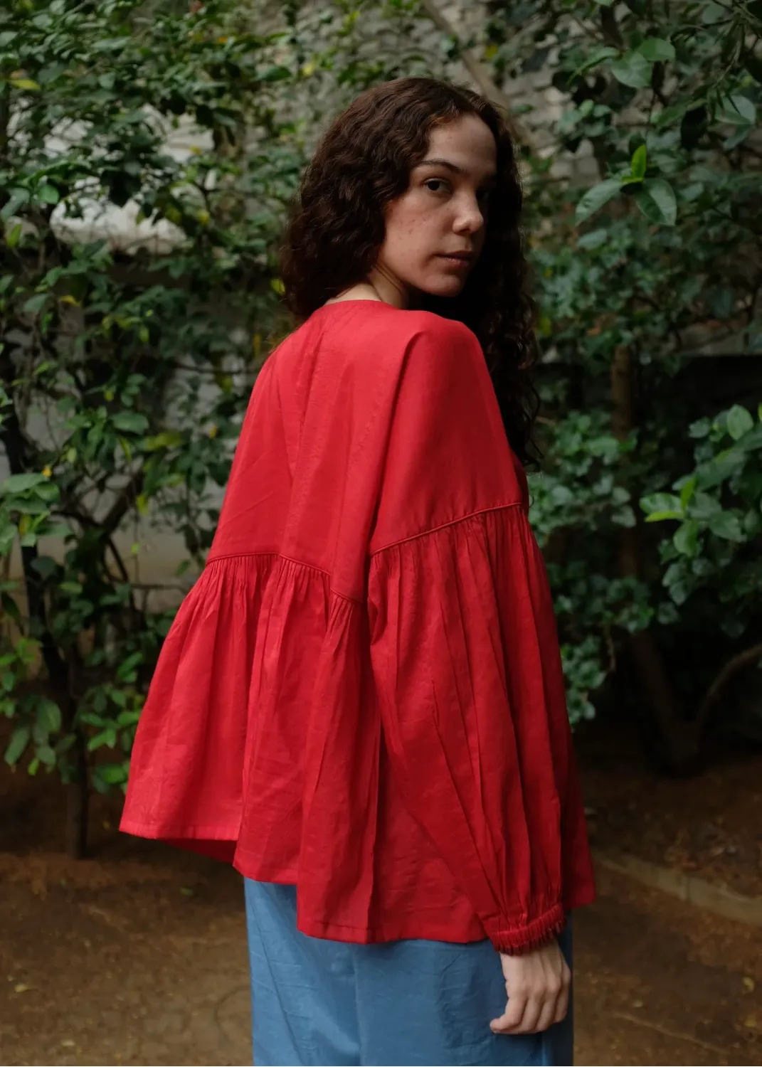 A contemporary top crafted from a blend of handwoven mulberry silk and lightweight merino wool. Clean piping defines the waist seam, releasing soft gathers that shape the form with ease. The sleeves mirror this rhythm with piped seams and fluid gathers, while an open placket with loop-and-button fastening introduces a subtle, modern edge.