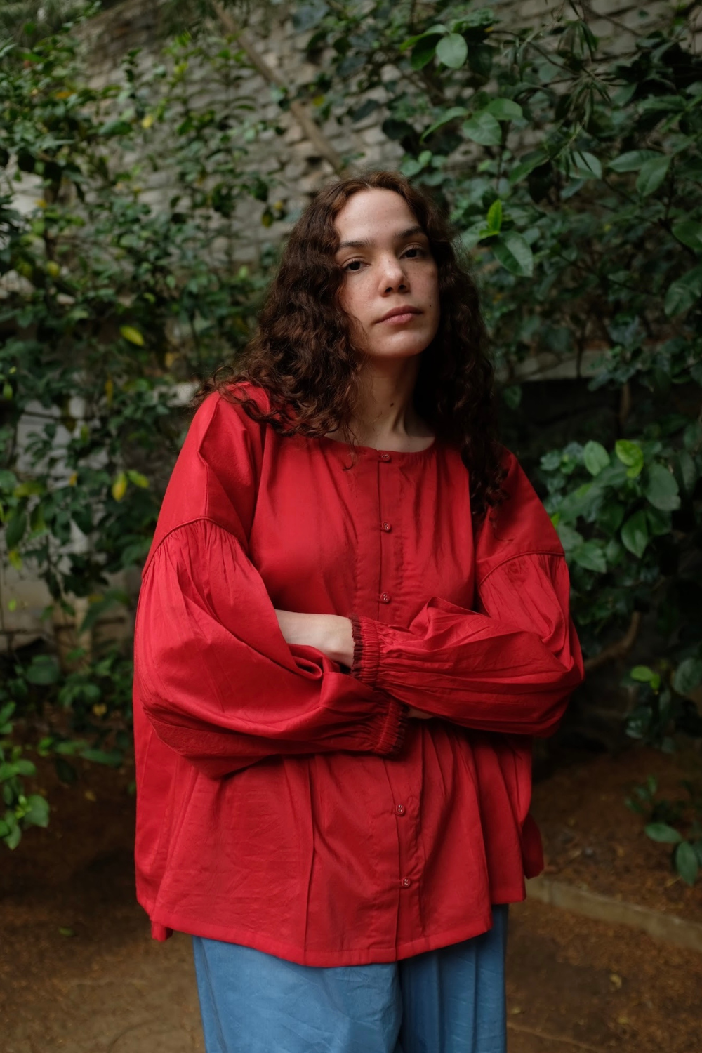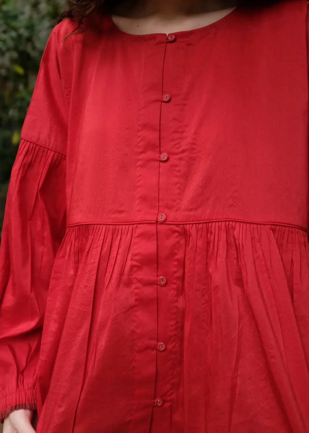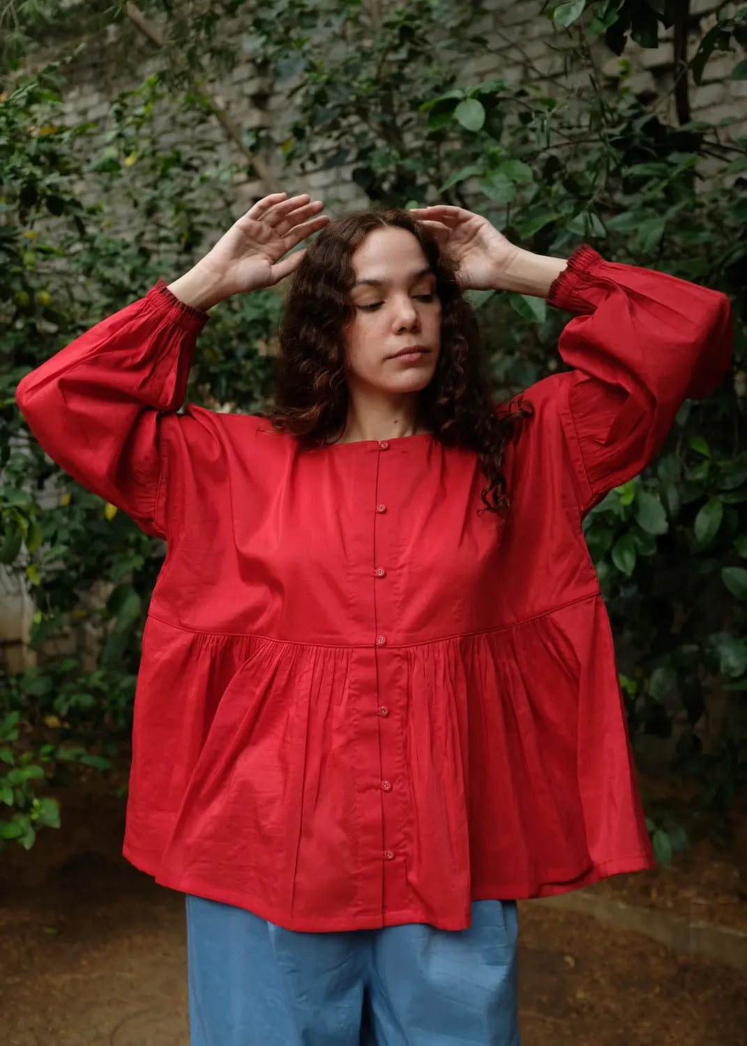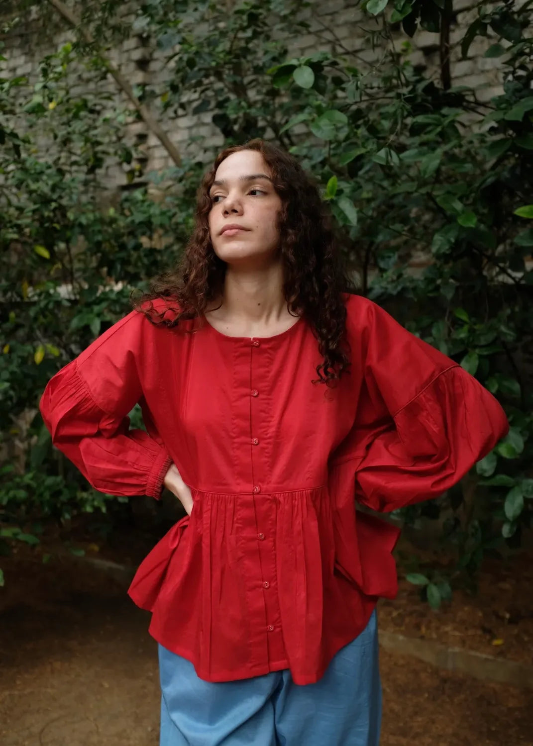 A contemporary top crafted from a blend of handwoven mulberry silk and lightweight merino wool. Clean piping defines the waist seam, releasing soft gathers that shape the form with ease. The sleeves mirror this rhythm with piped seams and fluid gathers, while an open placket with loop-and-button fastening introduces a subtle, modern edge.