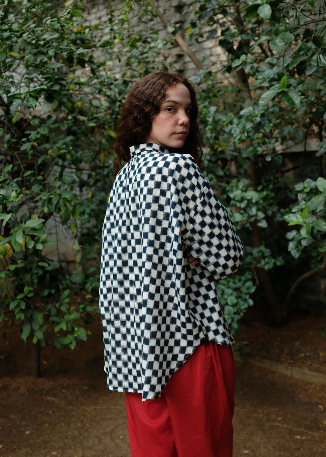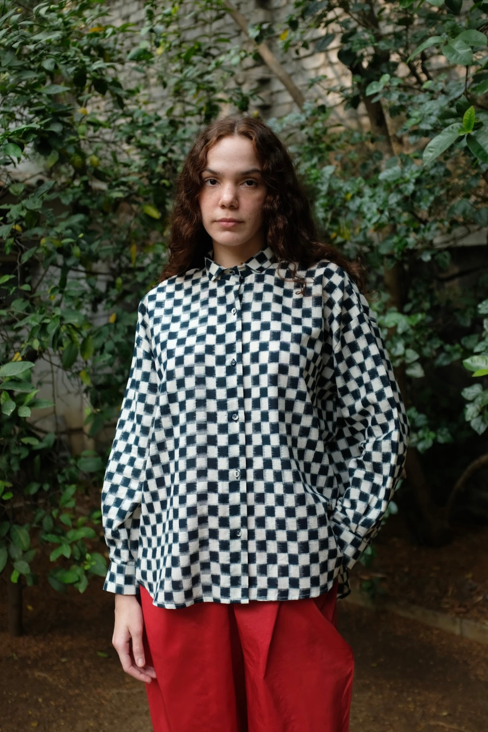 The shirt draws inspiration from the minimal aesthetics of Japenese dressing - simple but well-made. A loose-fit shirt defined by ease and thoughtful detailing, cut from a heritage Indian textile, the double Ikat cotton. Shaped with a uniquely styled petite collar, it features sleeves that finish in soft pleats and a refined cuff. Gentle gathers fall from the back neckline, lending the silhouette a breezy movement while maintaining a quiet, sophisticated presence.