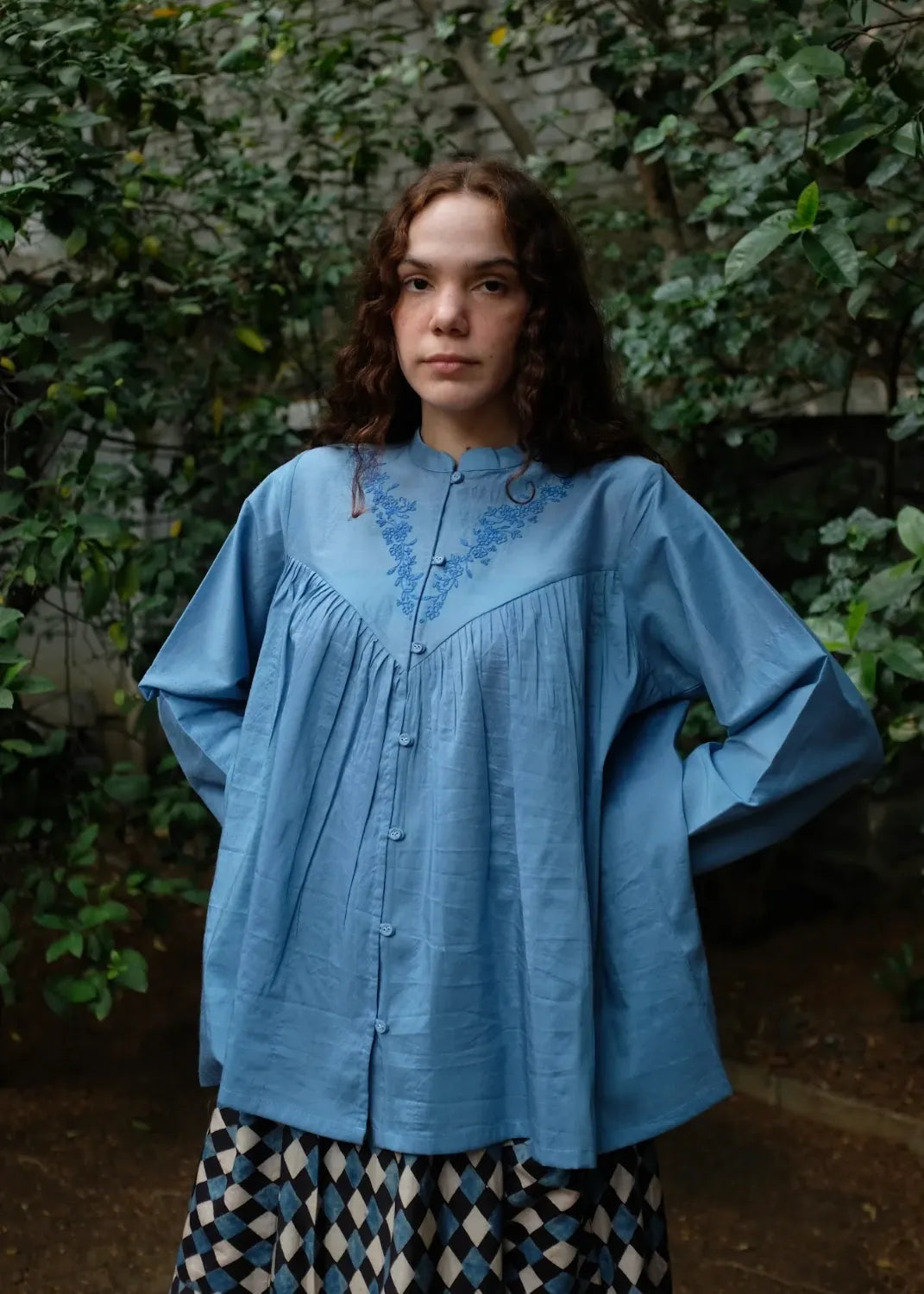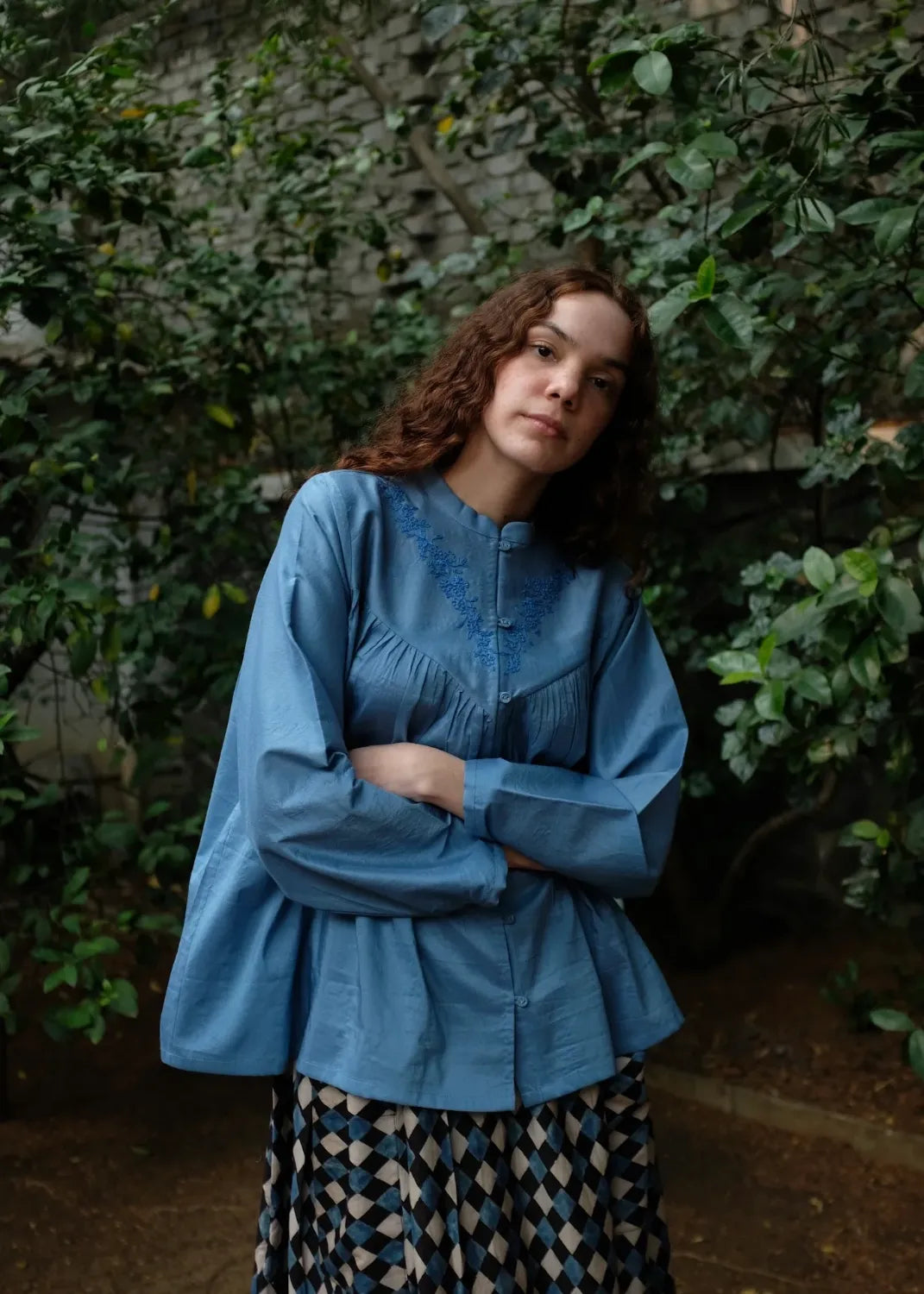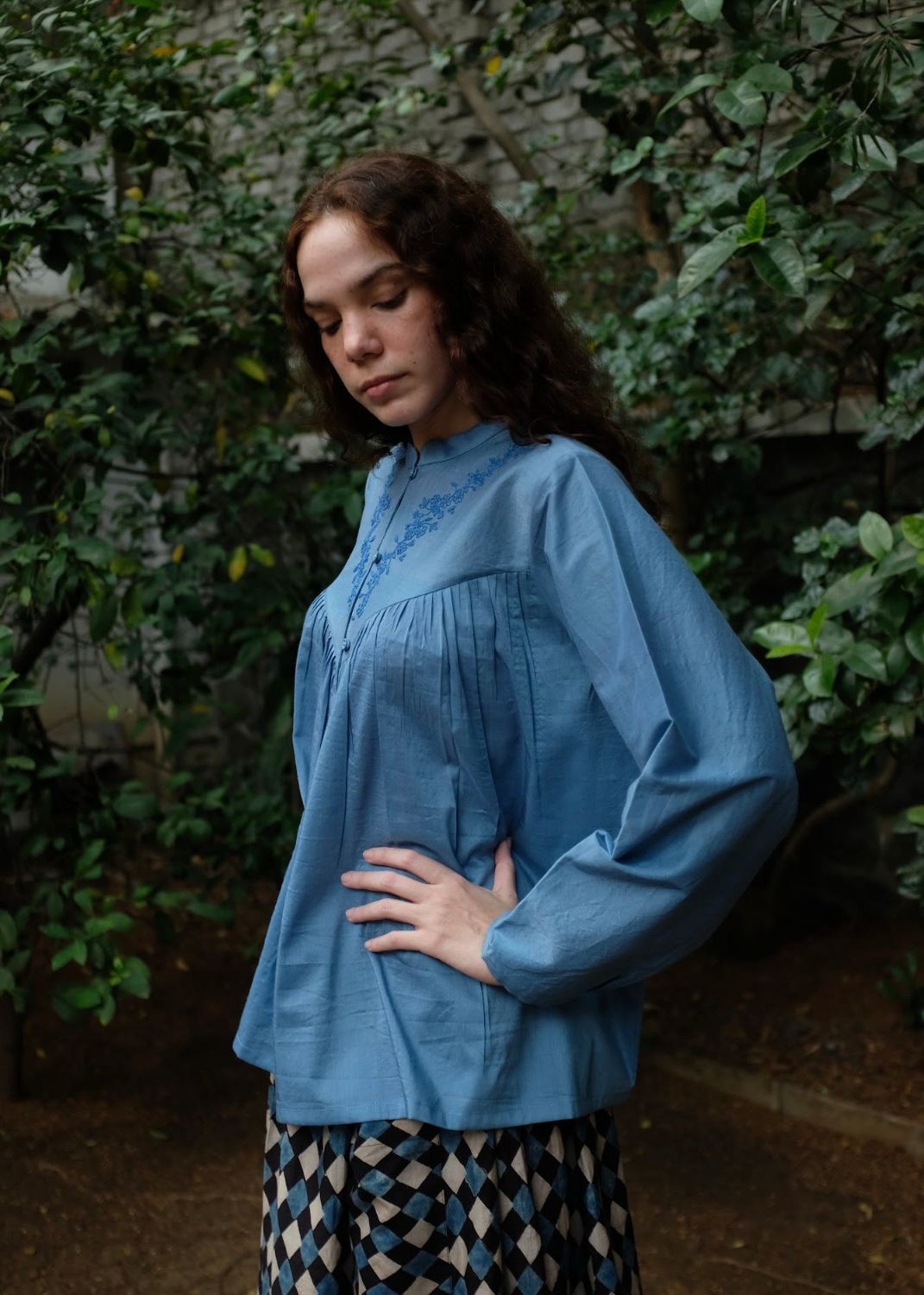 Cut from a handwoven blend of mulberry silk and light-weight merino wool, this top carries quiet richness in both feel and form. Dainty tonal embroidery rests gently on the surface, adding character. A front placket to break the monotony of gathers and straight sleeves to complete the ensemble.
