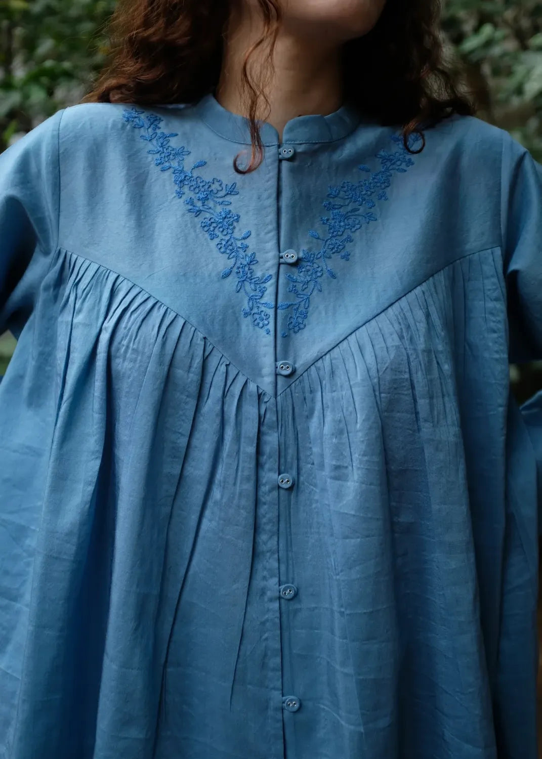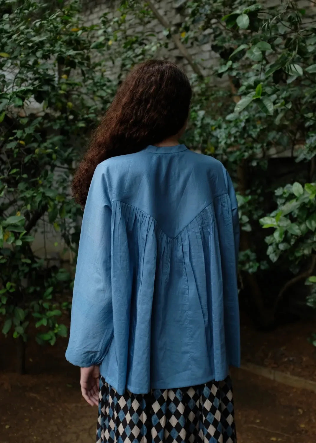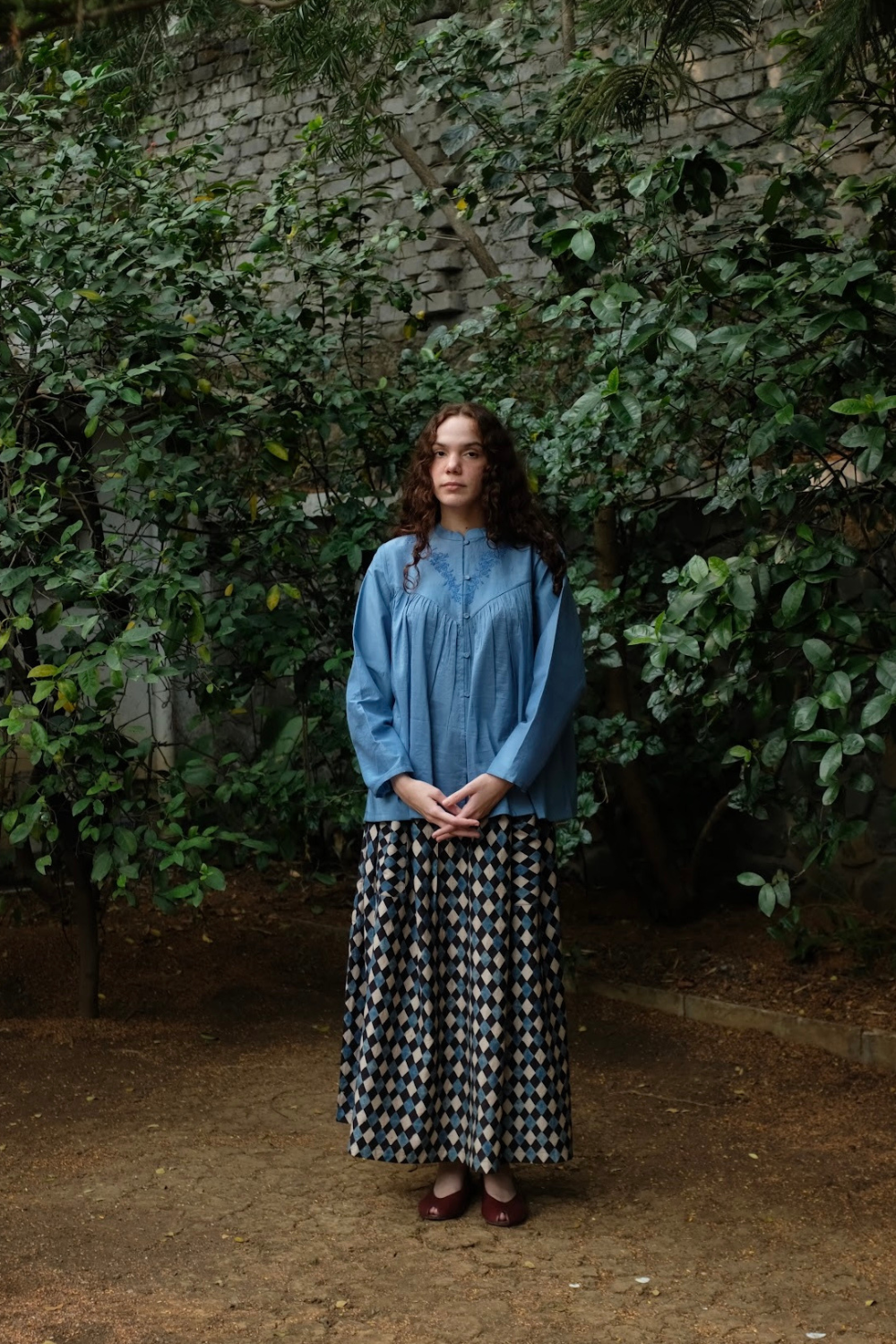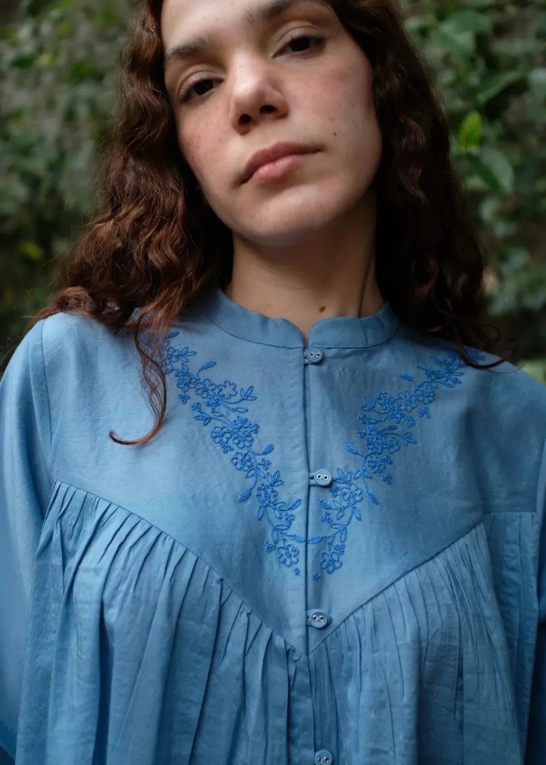 Cut from a handwoven blend of mulberry silk and light-weight merino wool, this top carries quiet richness in both feel and form. Dainty tonal embroidery rests gently on the surface, adding character. A front placket to break the monotony of gathers and straight sleeves to complete the ensemble.