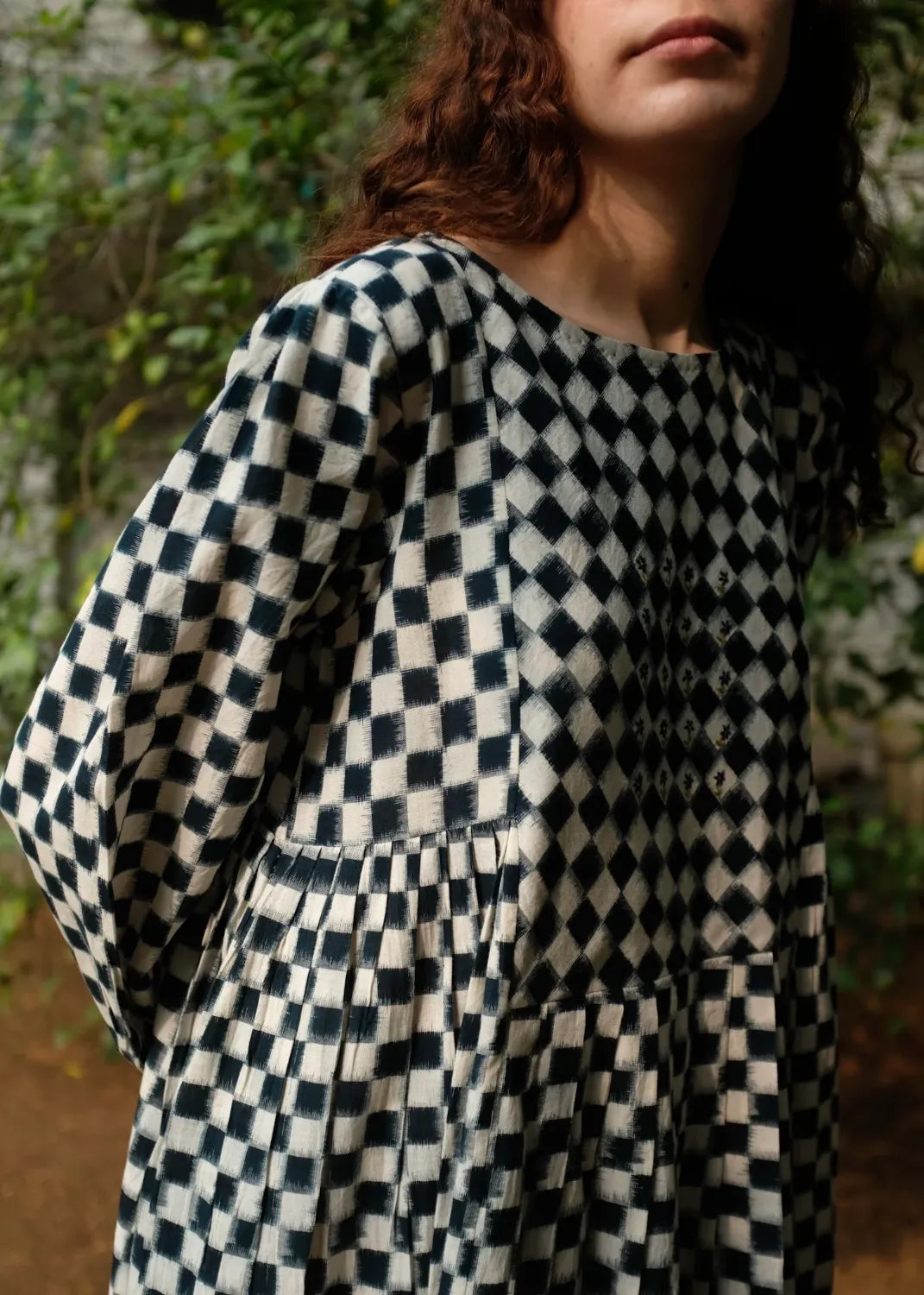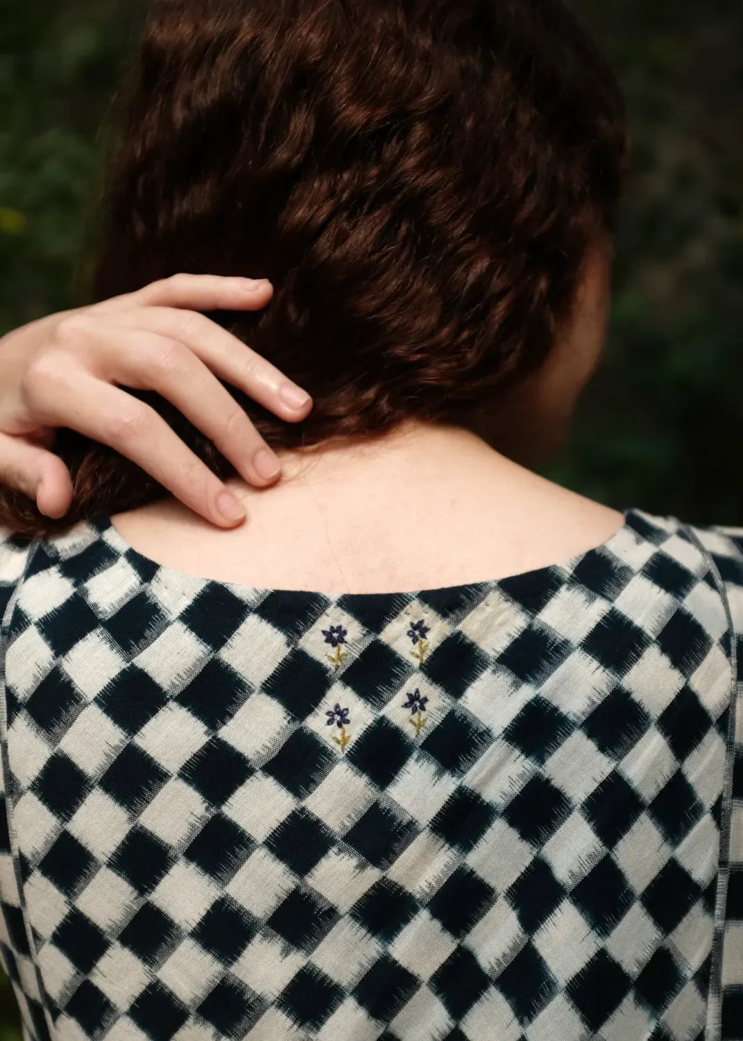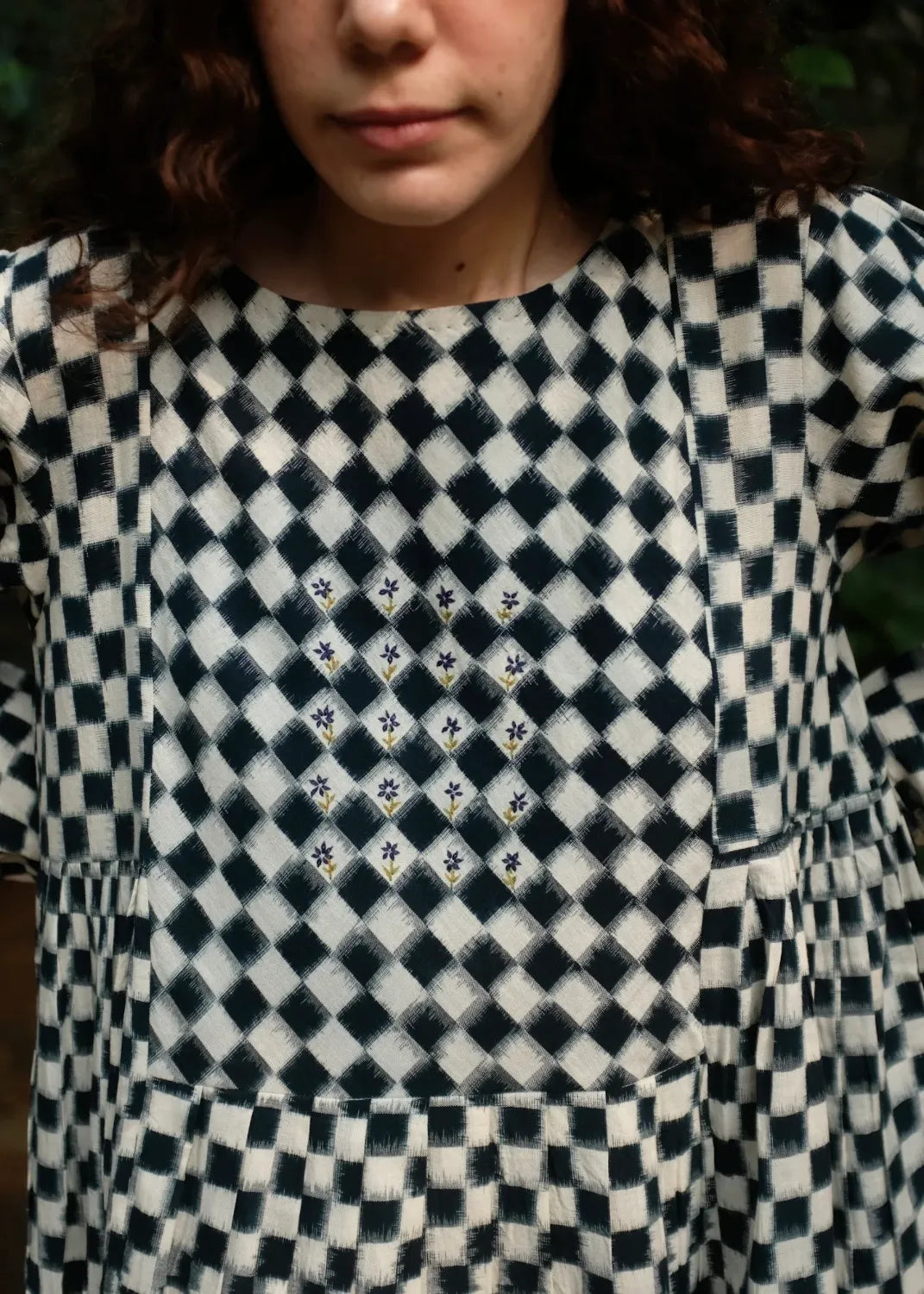 Our classic silhouette is back again with a subtle twist, of knife pleats instead of the usual gathers cut from the softest medium-weight handwoven double Ikat dyed using organic Indigo dye. It is adorned with chic floral embroidery done by hand at the yoke and a small portion of the back.