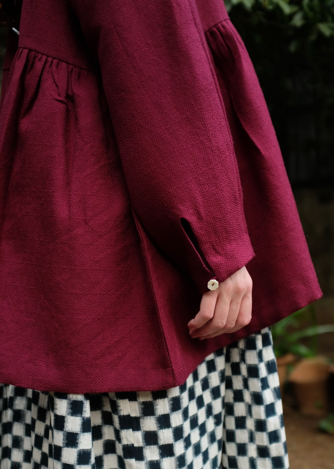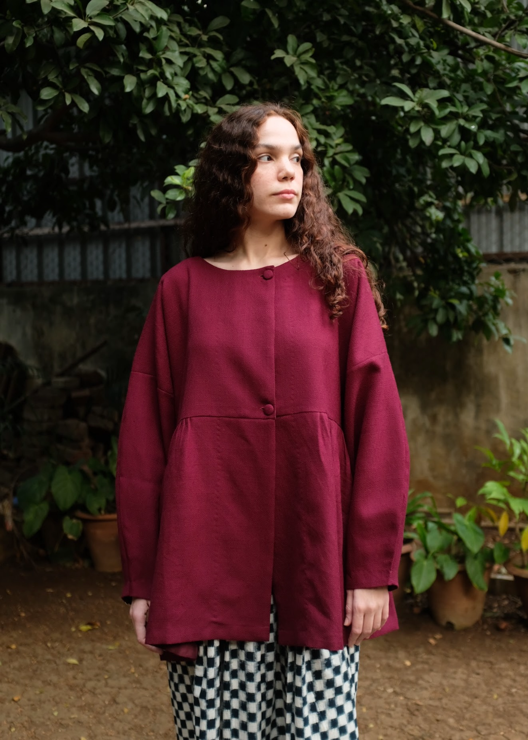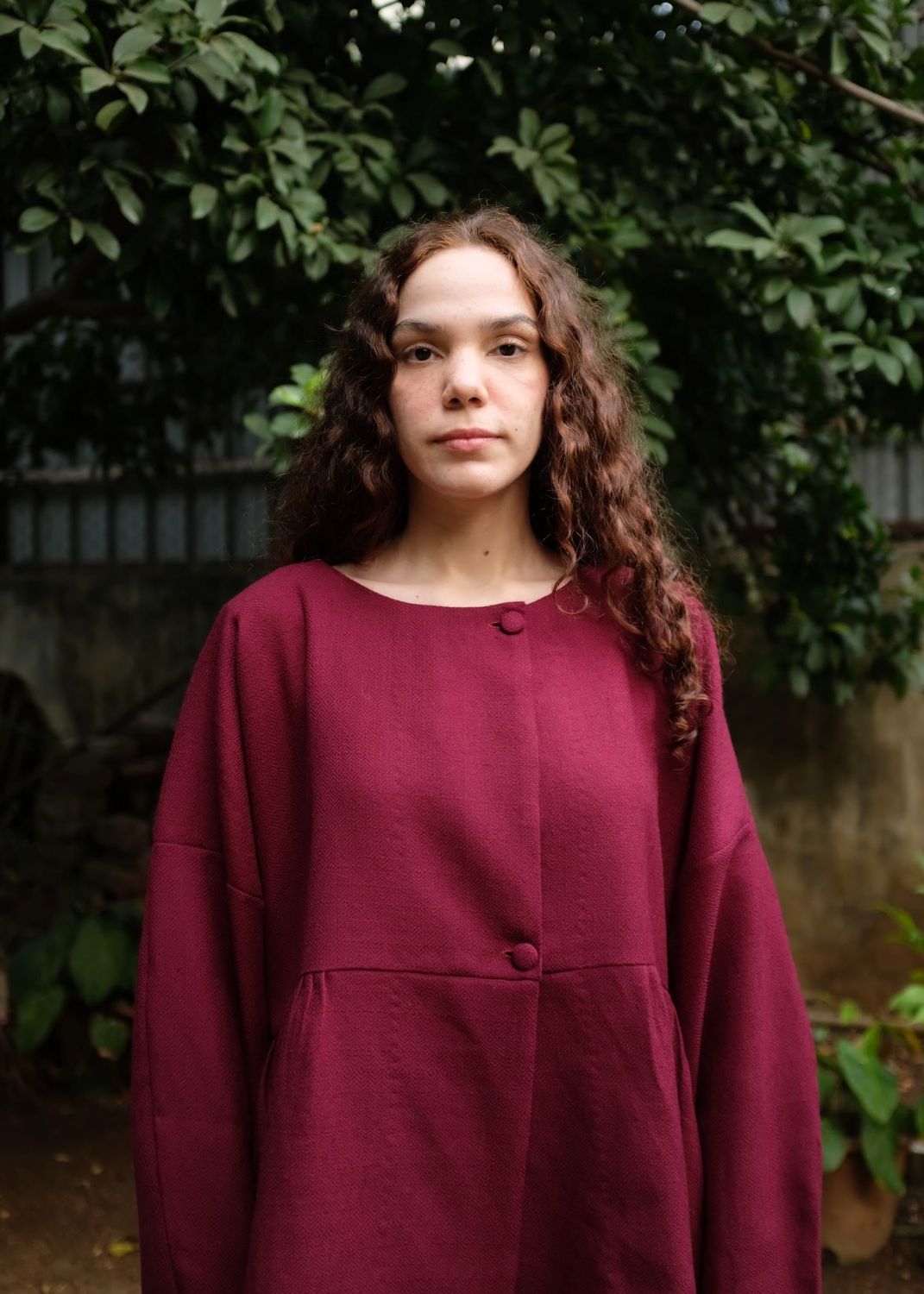 A handwoven merino wool coat with gentle side gathers that create a soft, feminine silhouette. Featuring an open placket, clean round neckline, and sleeves finished with delicate loop fastenings and floral shell buttons, the piece highlights the natural warmth of merino wool and the quiet elegance of handwoven craft.