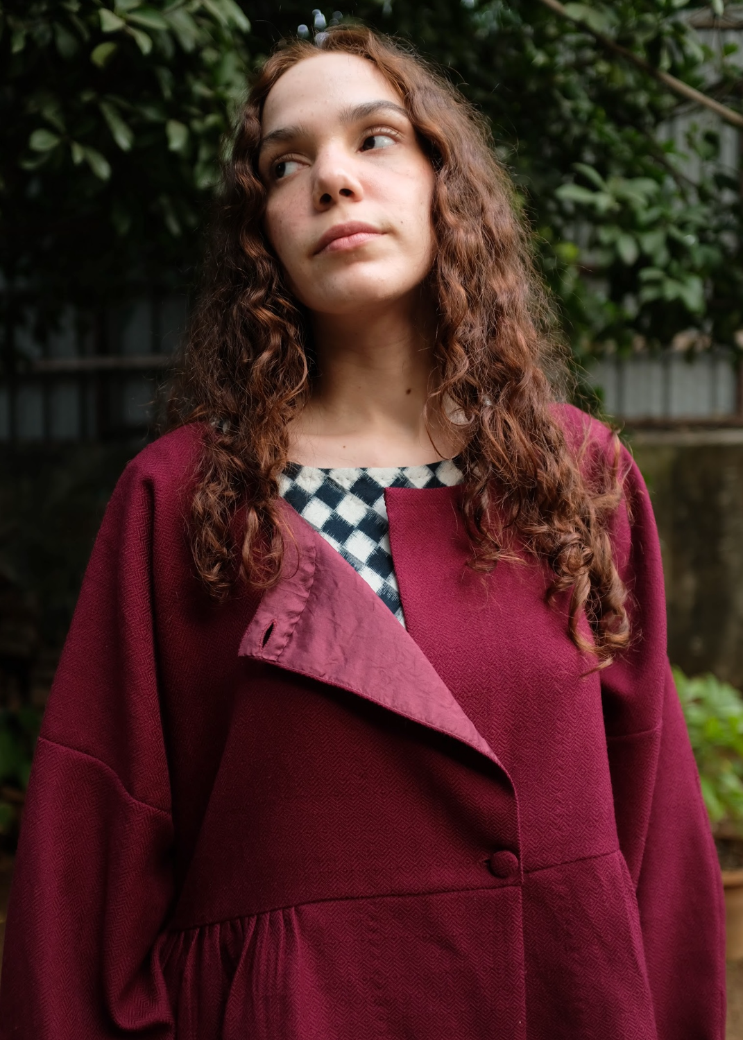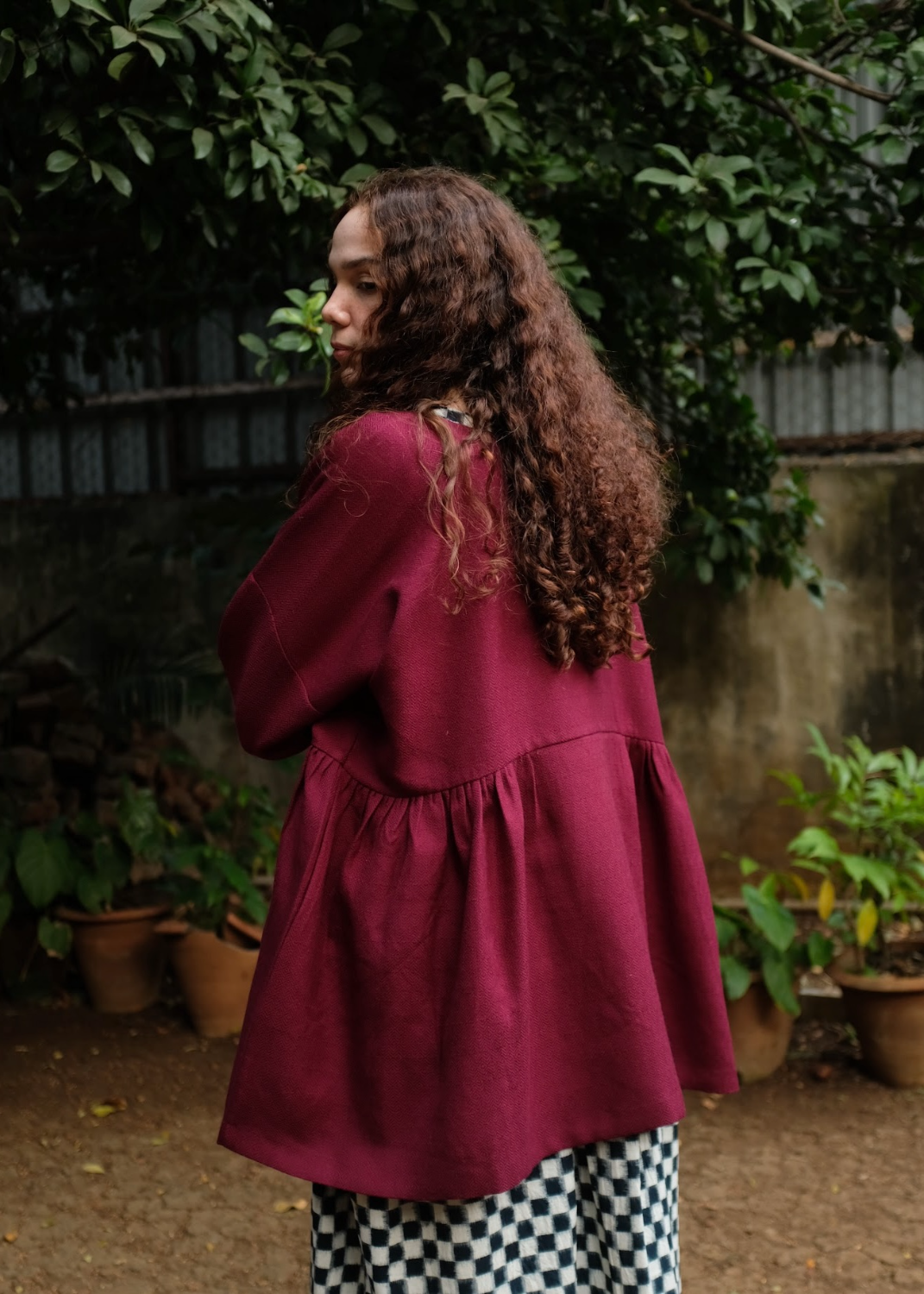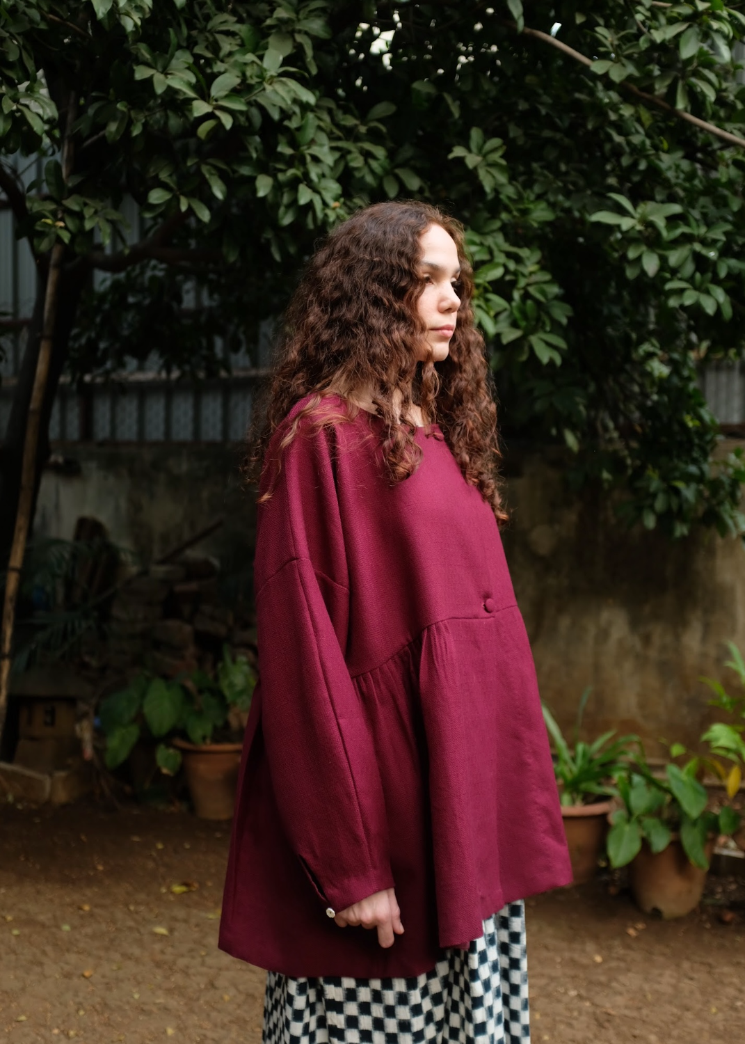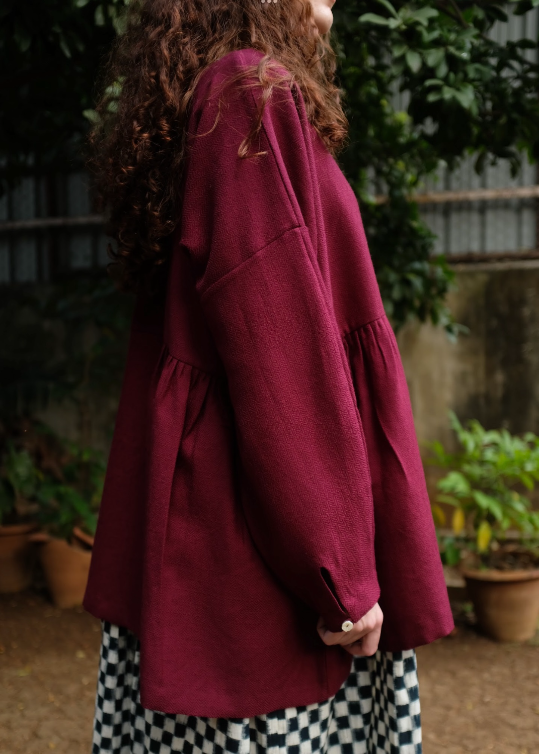 A handwoven merino wool coat with gentle side gathers that create a soft, feminine silhouette. Featuring an open placket, clean round neckline, and sleeves finished with delicate loop fastenings and floral shell buttons, the piece highlights the natural warmth of merino wool and the quiet elegance of handwoven craft.