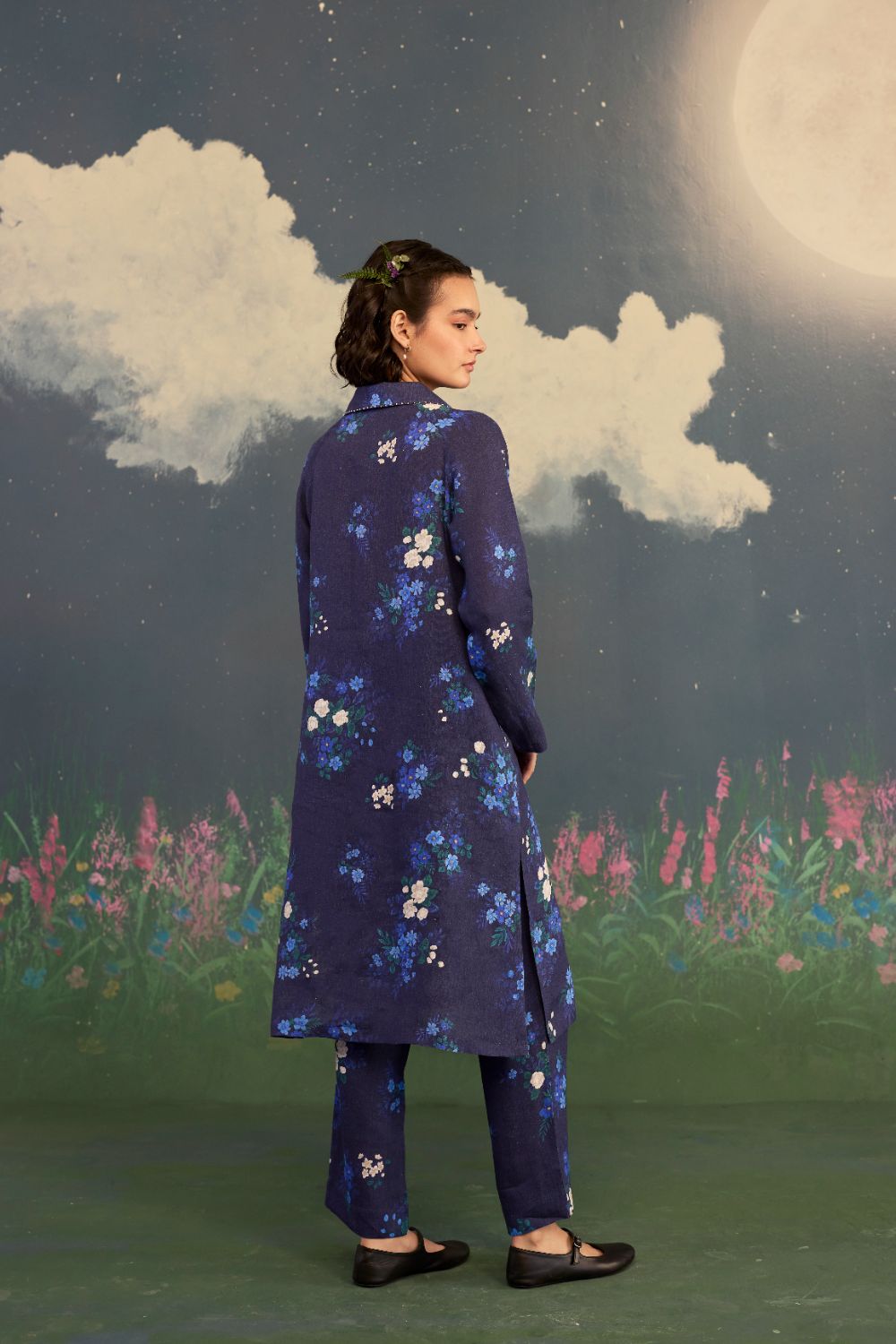 Product Type: Kurta Sets A fascinating midnight blue set in linen, is inspired by the Morning Glory, a flower known for its poetic bloom at daybreak. It celebrates renewal, grace, and the gentle unfolding of a new beginning. The deep backdrop acts like a night sky just before sunrise—intensifying the flower’s pastel radiance and allowing each bloom to glow with quiet luminosity. A relaxed fit, the long shirt drapes fluidly, while the tailored yet easy pant completes the set, creating a balance of structure and softness that feels modern yet timeless. Hand-finishing gives it an individuality and pockets add an essential convenience. Shirt length 42 inches. Pant length 36 inches.