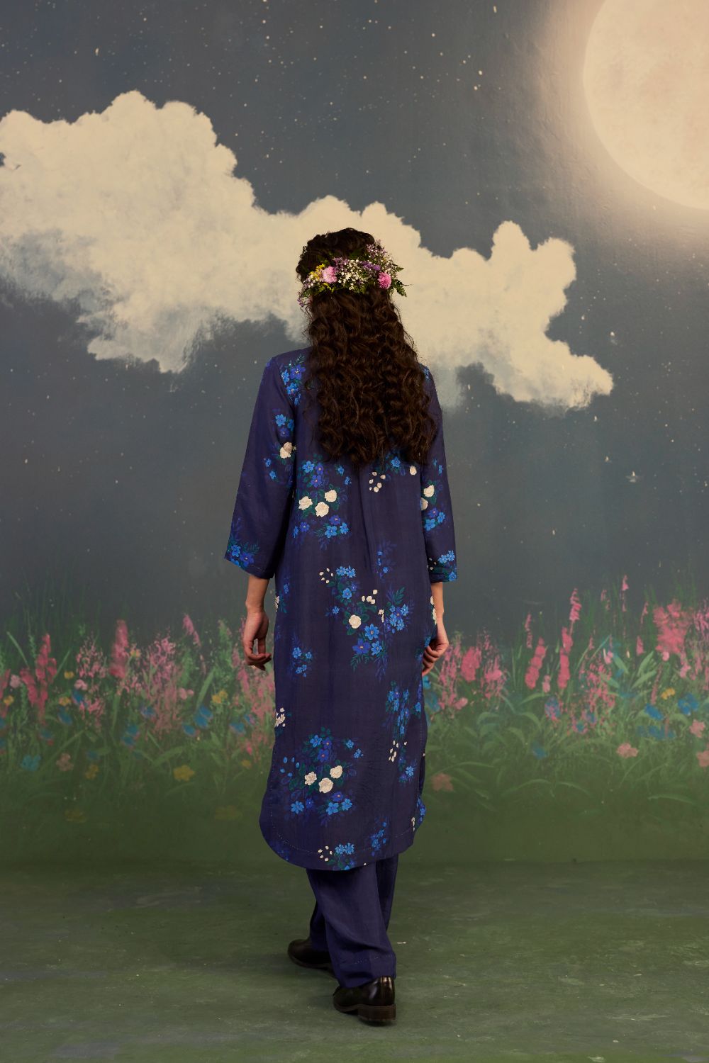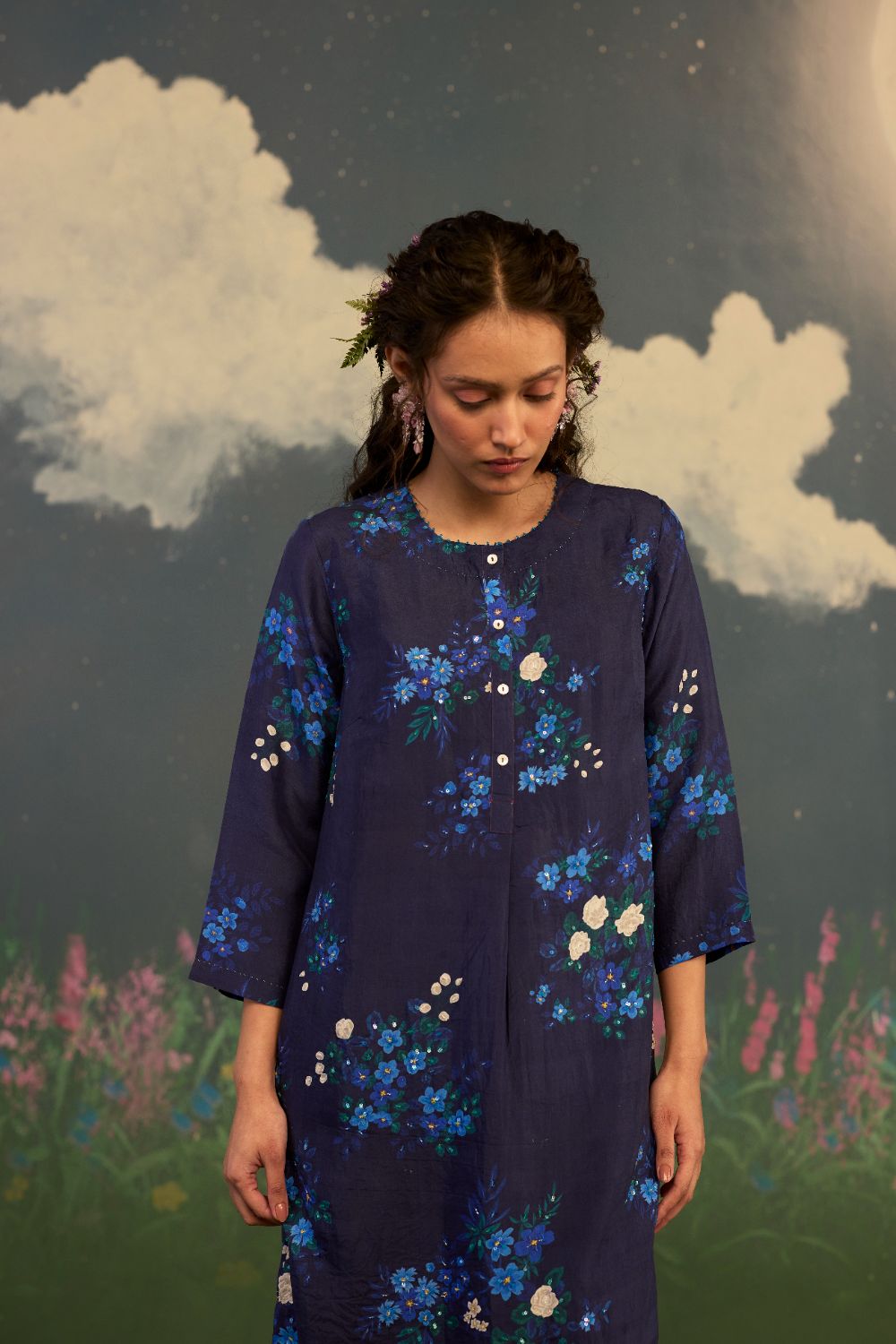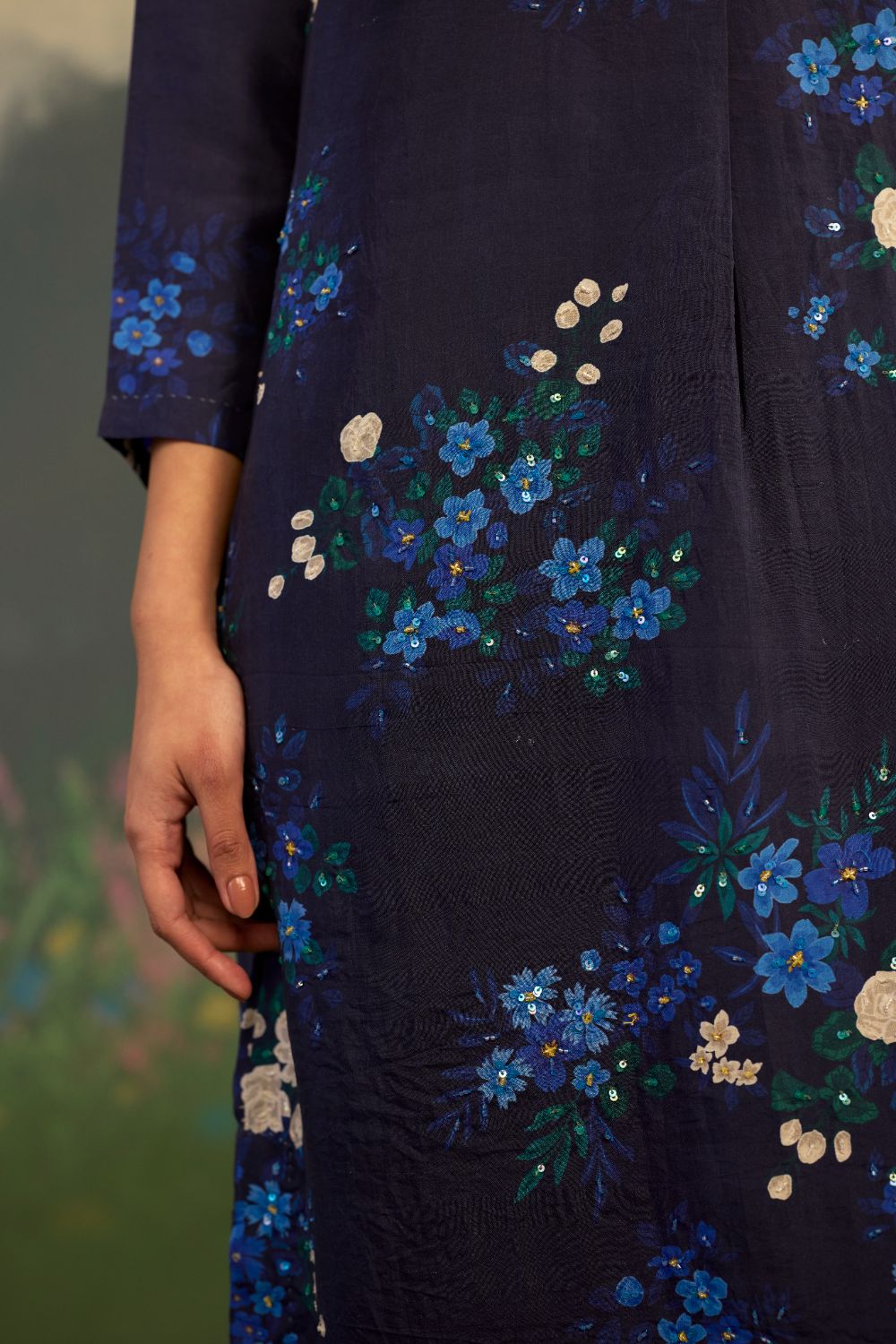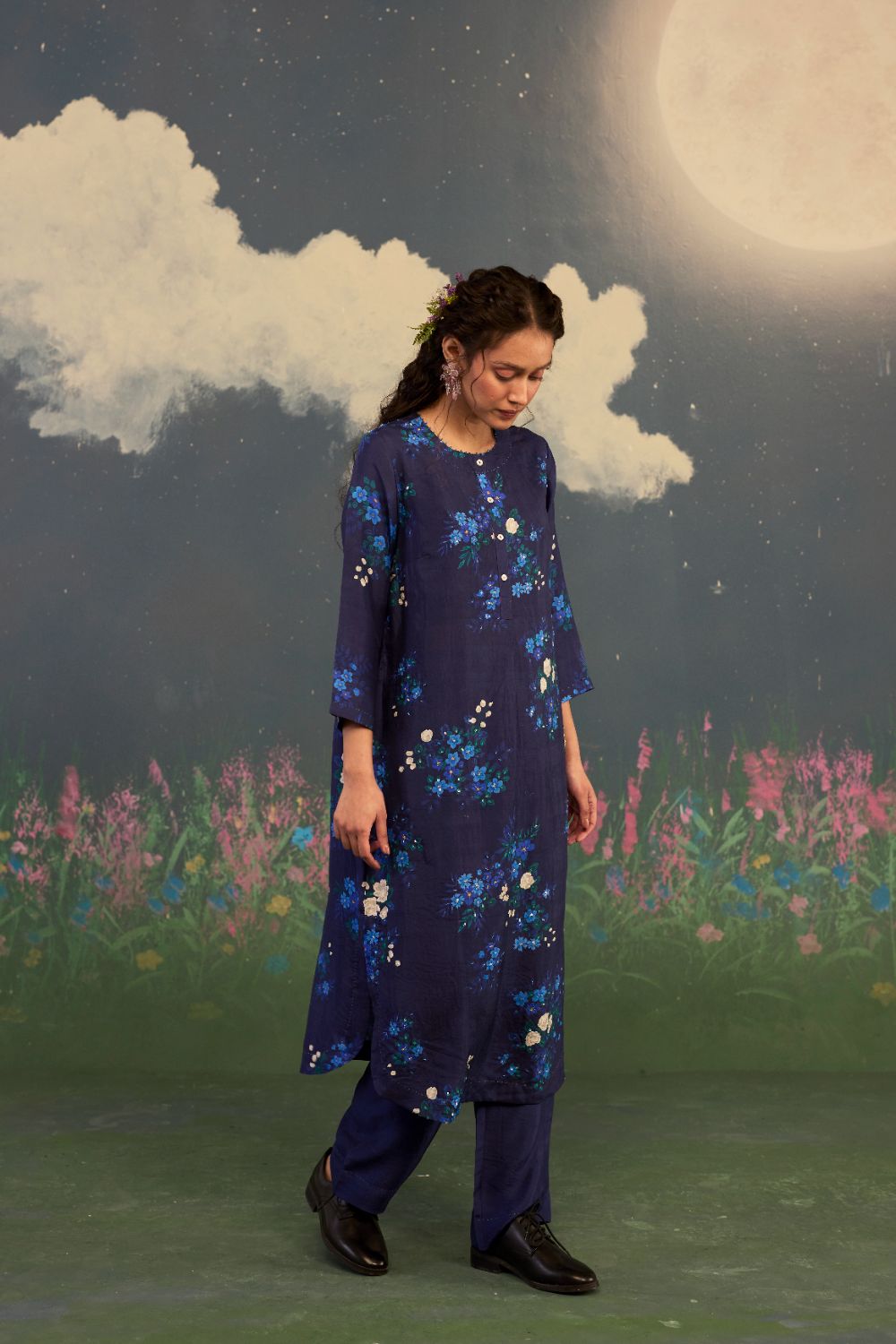Product Type: Kurta Sets A fascinating midnight blue long kurta set in handwoven mulberry silk with an intricate hand-embroidery on kurta, is inspired by the Morning Glory. A flower known for its poetic bloom at daybreak. It celebrates renewal, grace, and the gentle unfolding of a new beginning. The deep backdrop acts like a night sky just before sunrise. Intricate hand embroidery on the kurta front intensifies the flower’s pastel radiance and allowing each bloom to glow with quiet luminosity. Glass beads on neckline, hand hemming and hand-stitched edges adds a distinct individuality. The silhouette embraces a relaxed fit, flowing effortlessly to ensure comfort without compromise. Its ease of movement is complemented by tailored refinement. Pockets for convenience. Model is 5 feet 6 inches tall and wearing a size small. Top length is 42 inches. Pant Length is 36 inches.