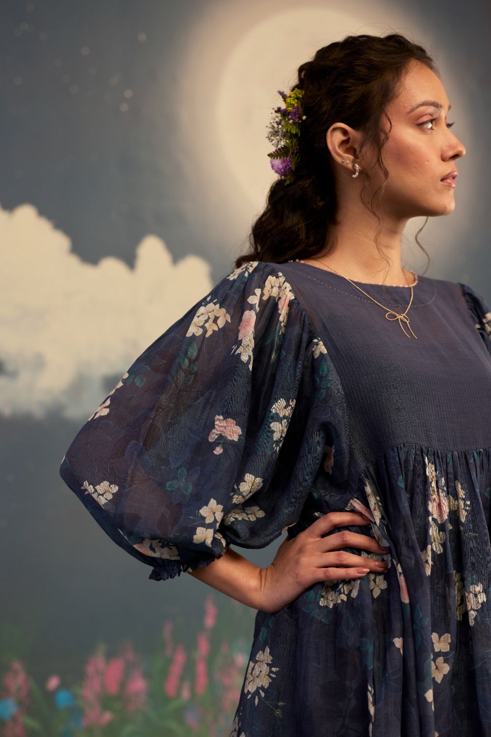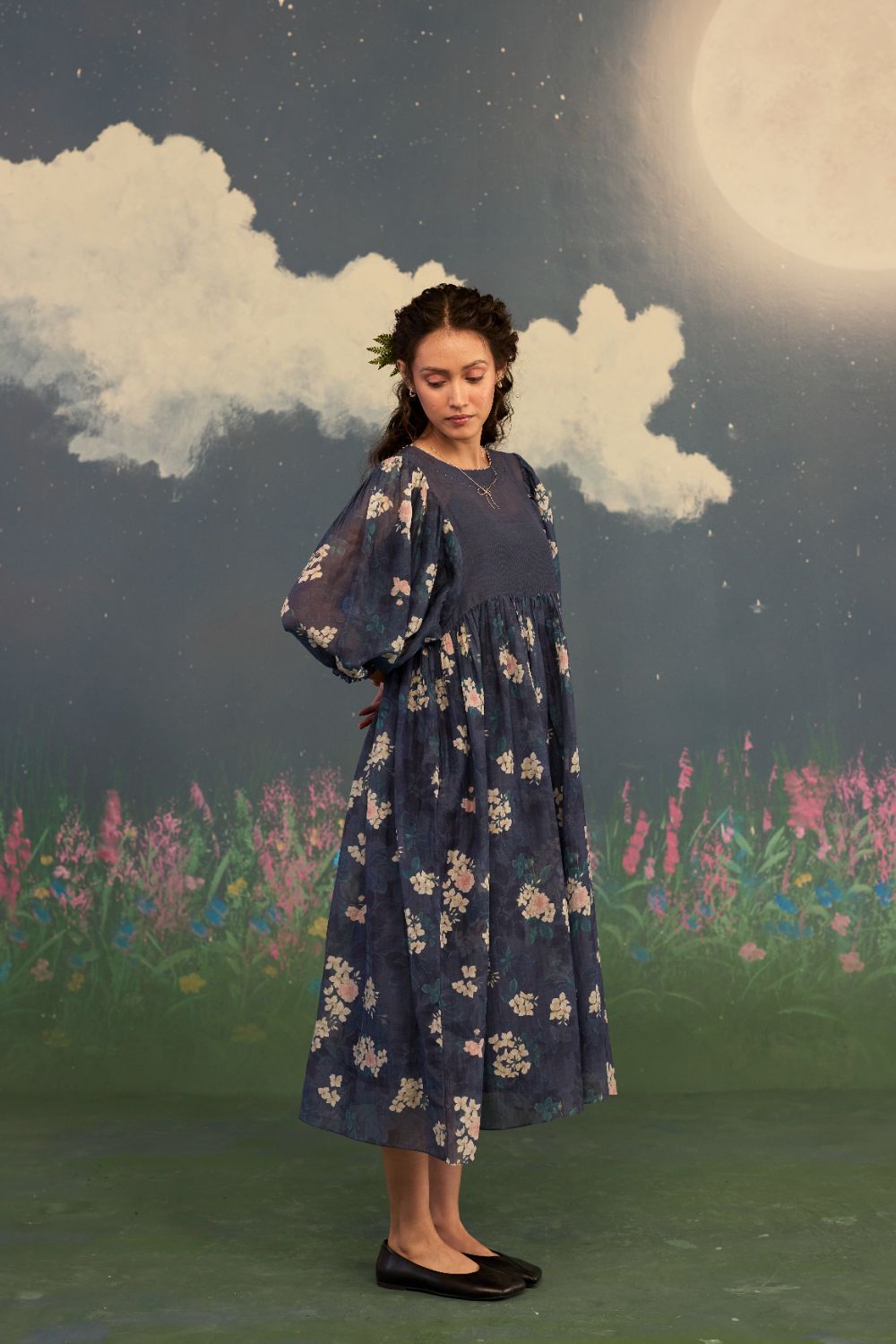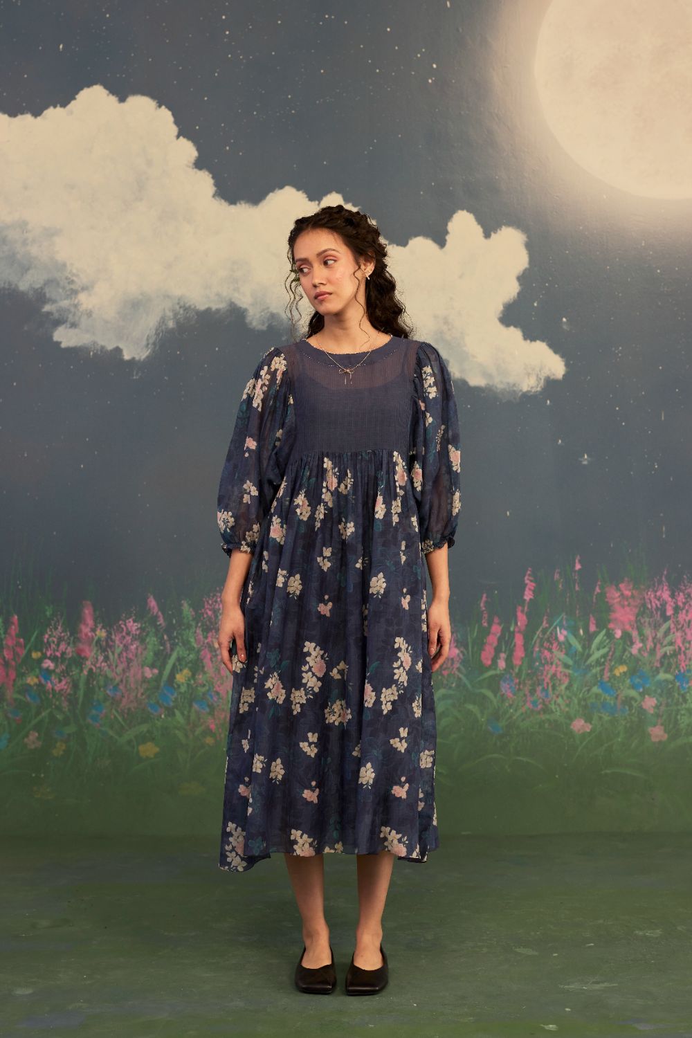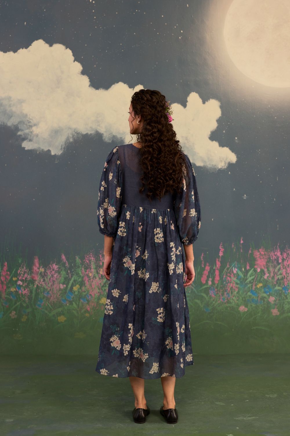 Product Type: Dress The most timeless and poetic Roses on a twilight black handwoven silk and cotton remain a timeless masterpiece. It carries an unmistakable sense of romance, femininity, and refined beauty. The dark base acts as a luxurious canvas, allowing the pastel-colored roses to appear luminous and delicately detailed. The print feels both modern and classic—quietly striking, effortlessly elegant, and unmistakably refined. Relaxed fit and ethereal drape make this an everyday wear from luncheons to celebratory evenings. The model is 5 feet 6 inches tall and wearing size small. Dress length is 42 inches.