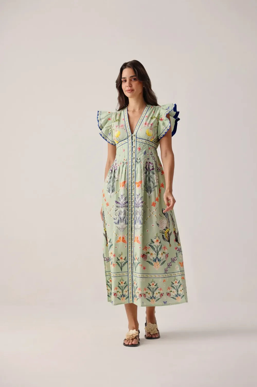Signature maxi dress silhouette with Soft ruffle sleeves and gentle flare