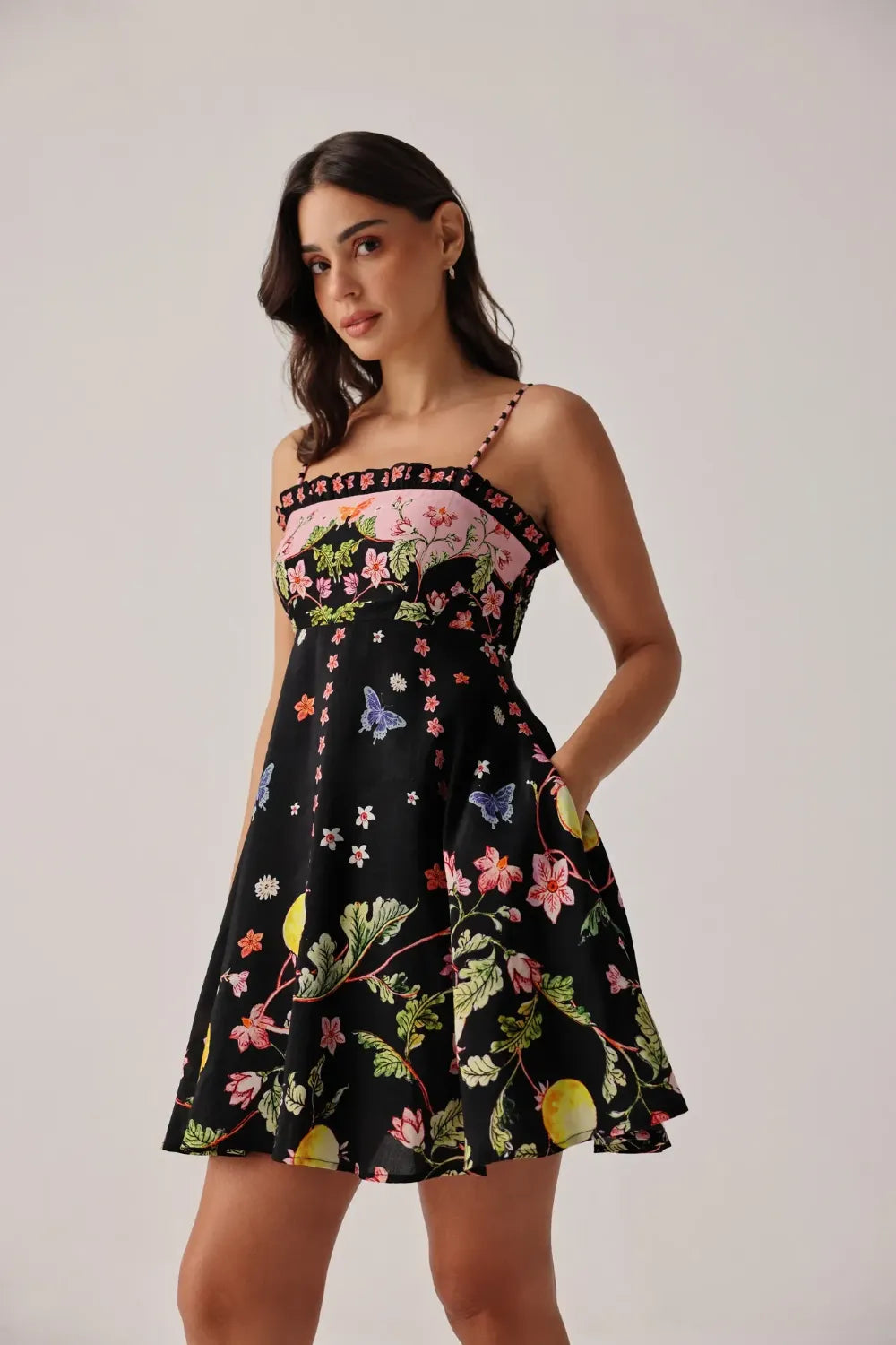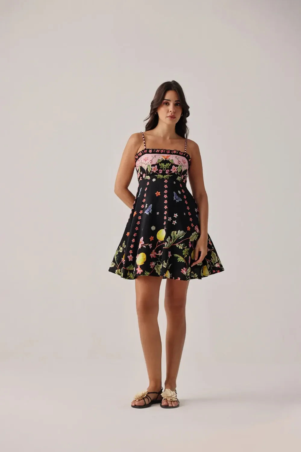 Fine-strap mini dress silhouette with fitted bustier and soft flared hem