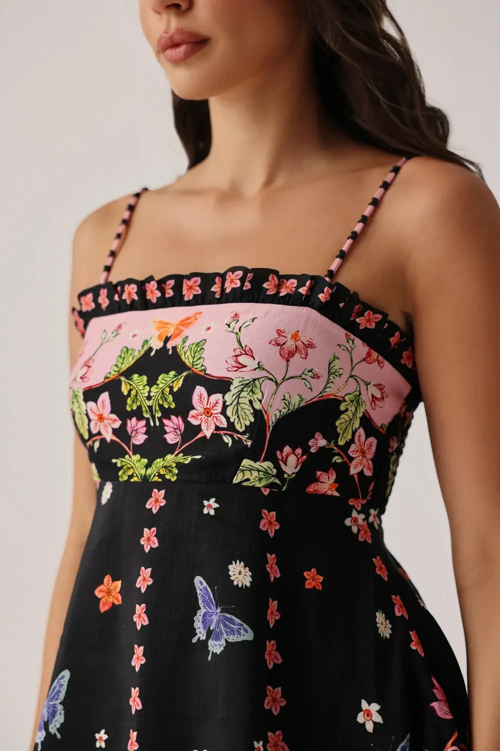 Adjustable straps with ruffle detailing along the neckline