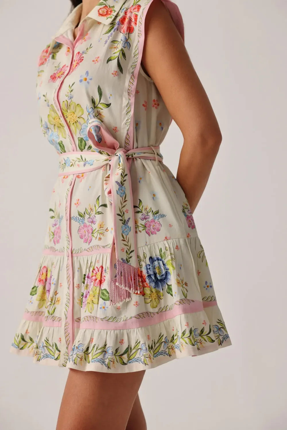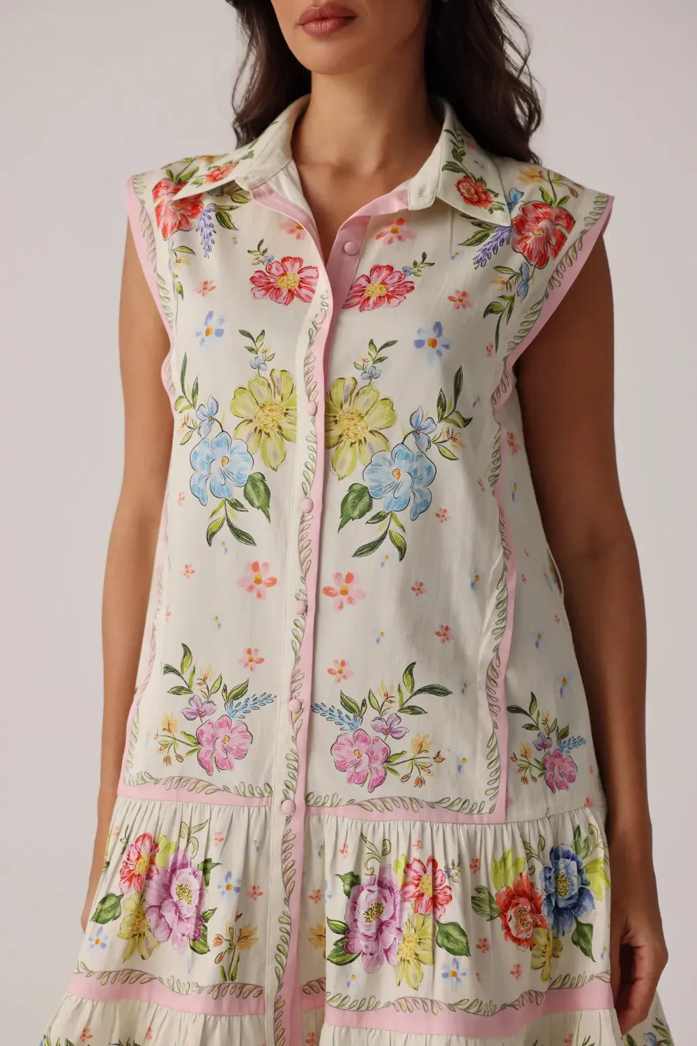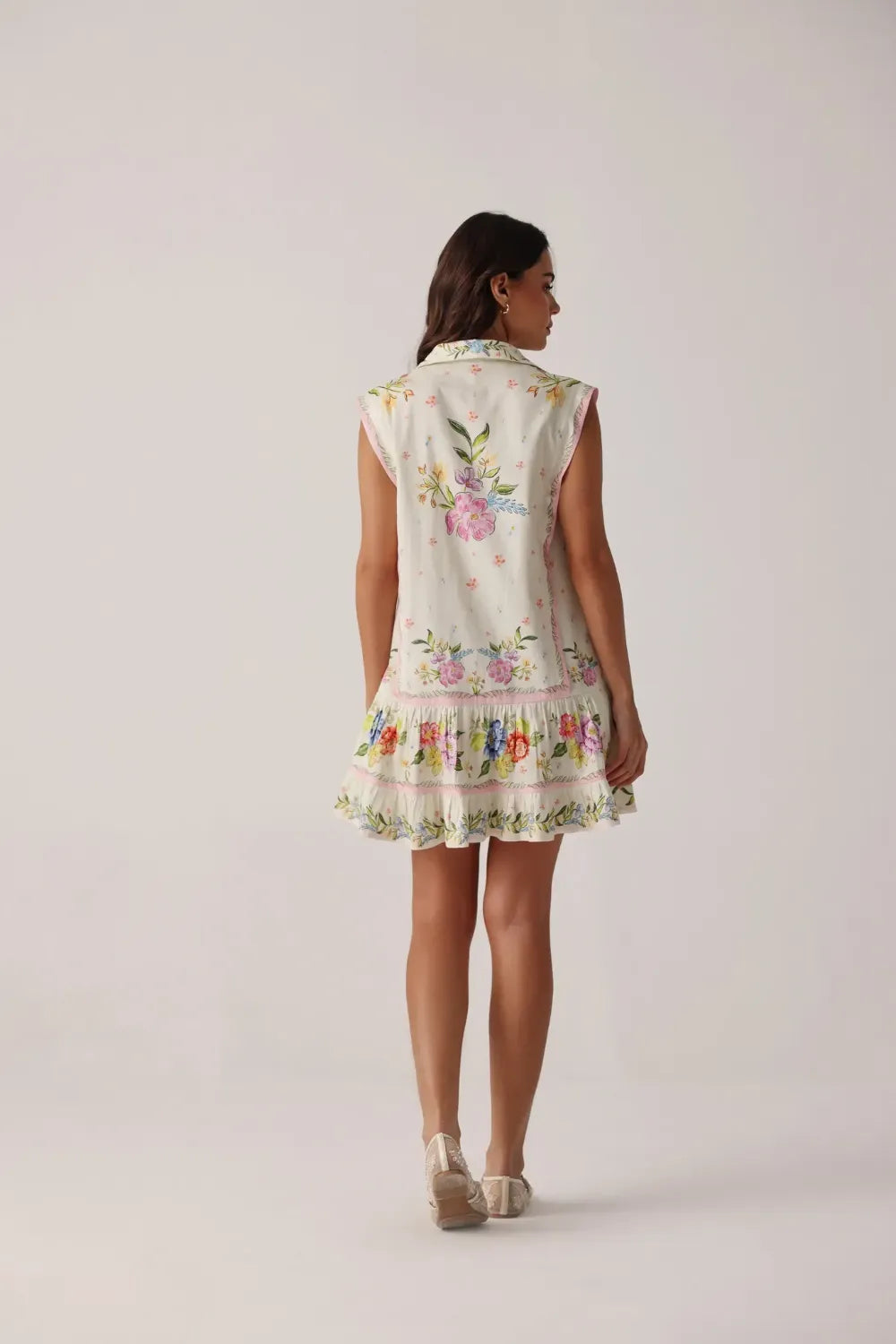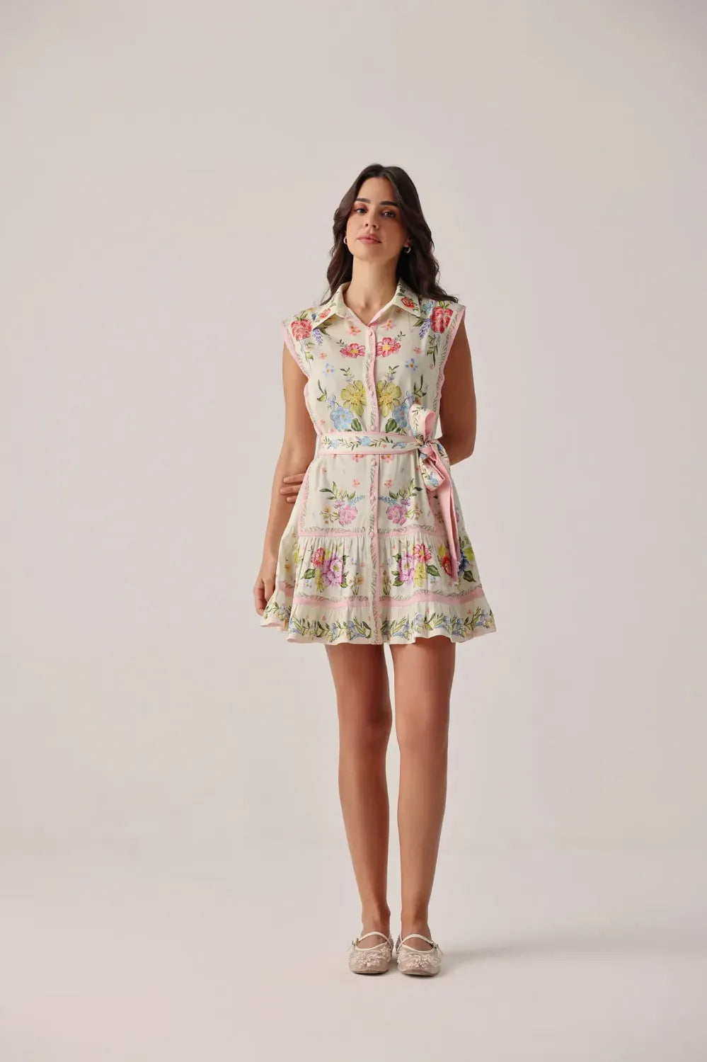 Sleeveless mini shirtdress silhouette with a relaxed fit