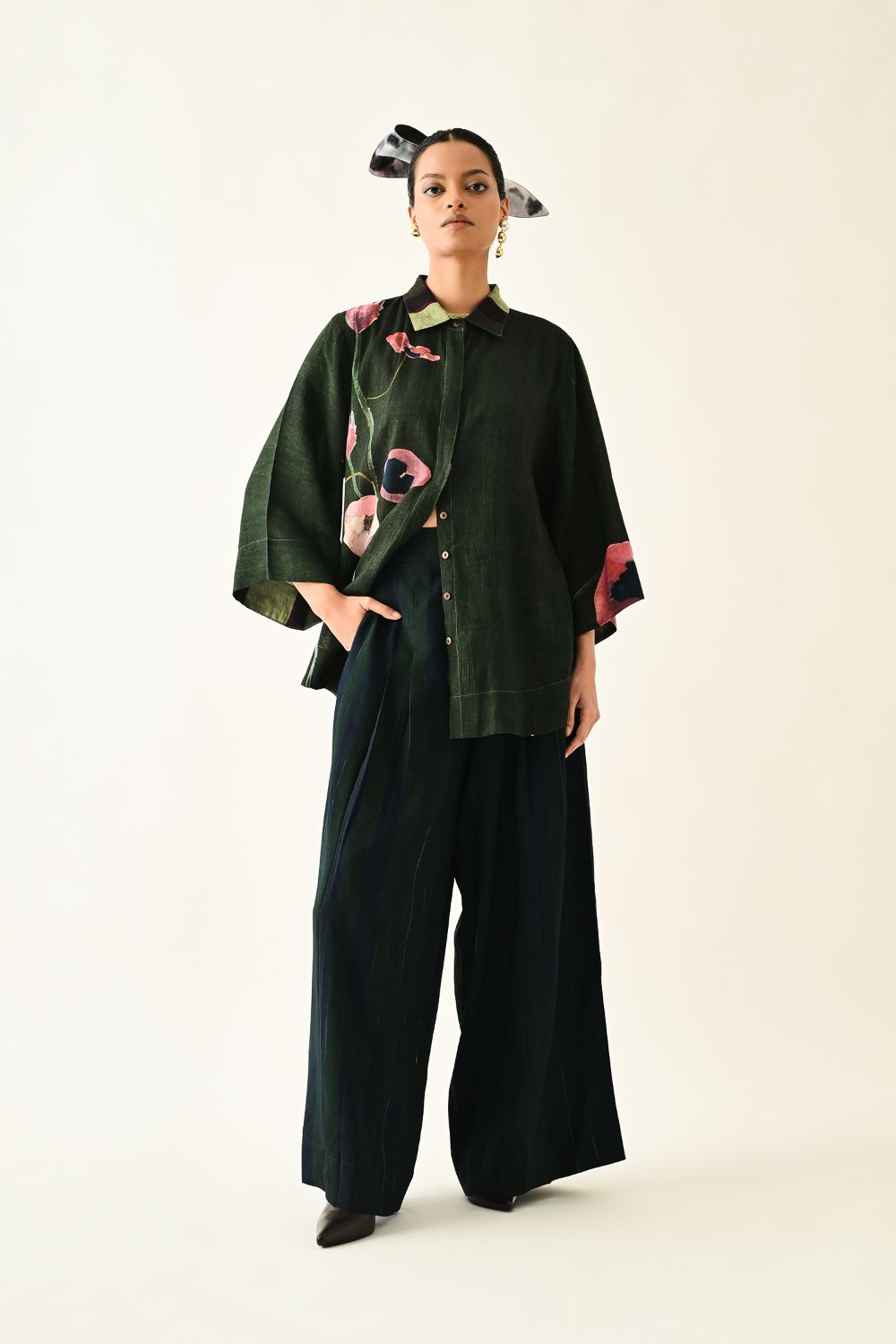 Top: Anti-Fit, Hand-painted abstract expressionist digitally transferred print, Shirt collar, front hidden placket. Print placements will vary—single Piece. Model is wearing XS/S