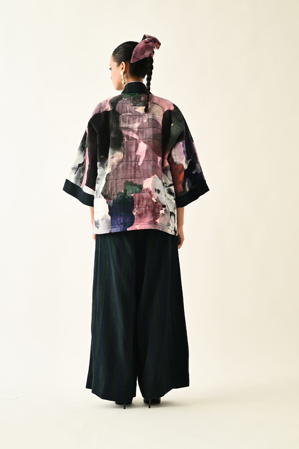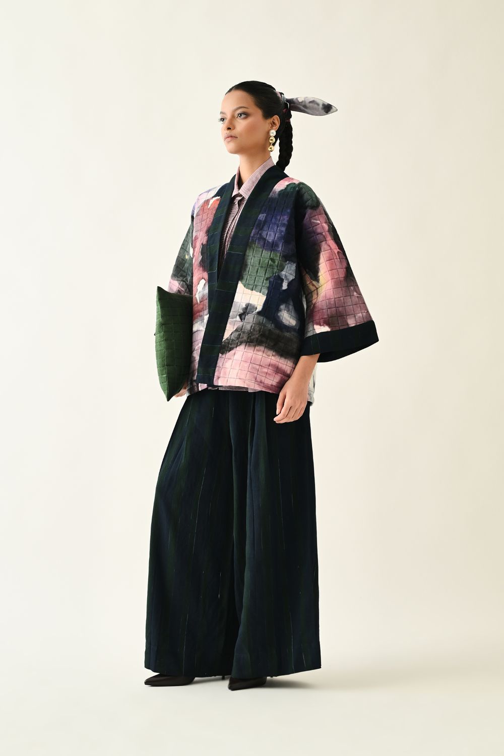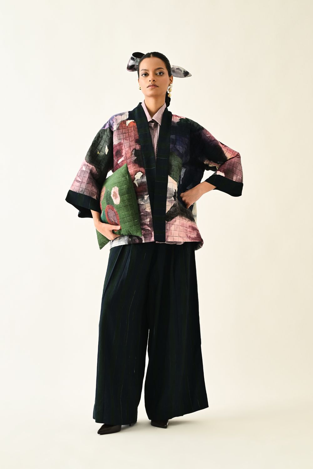Jacket: A handcrafted quilted jacket featuring a vibrant floral hand-painted pattern on a textured grid base. Designed with a relaxed, open-front silhouette and a contrasting striped lapel.