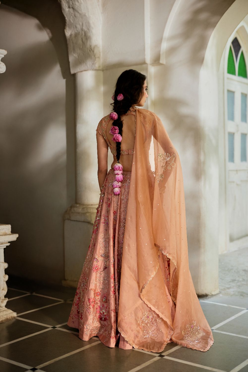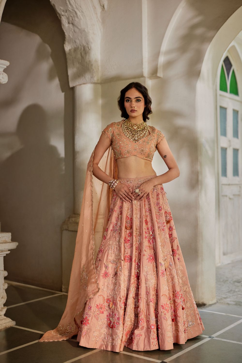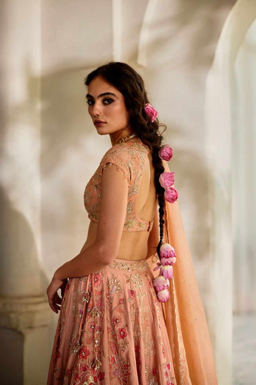 A poetic blend of craft and couture, this peach printed lehenga is lavishly hand-embroidered and finished with artisanal tasselled detailing. The solid blouse features meticulous couchni embroidery, adding depth and heritage to the silhouette. An ethereal, hand-embroidered organza dupatta completes the look—a perfect addition to your wedding wardrobe.