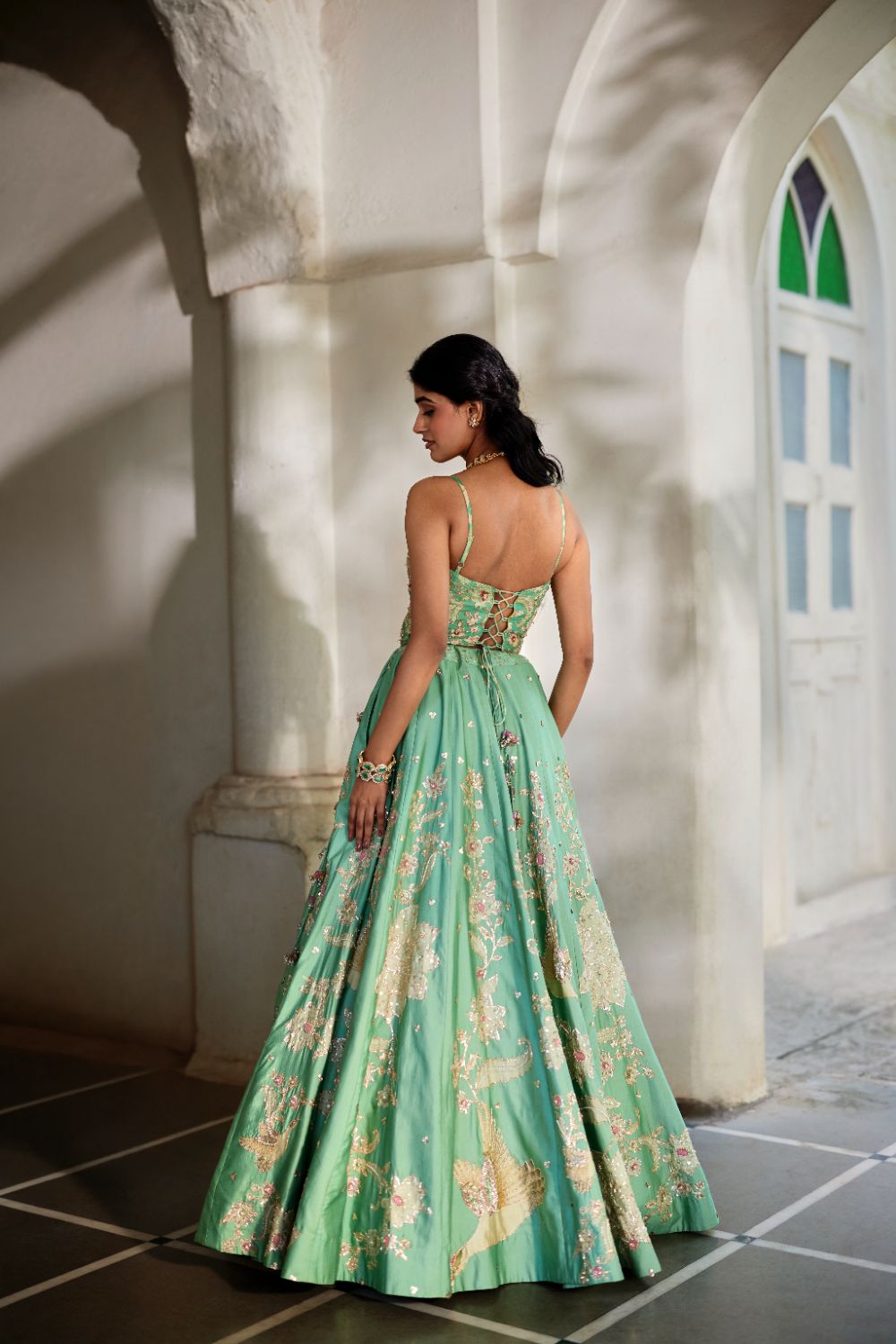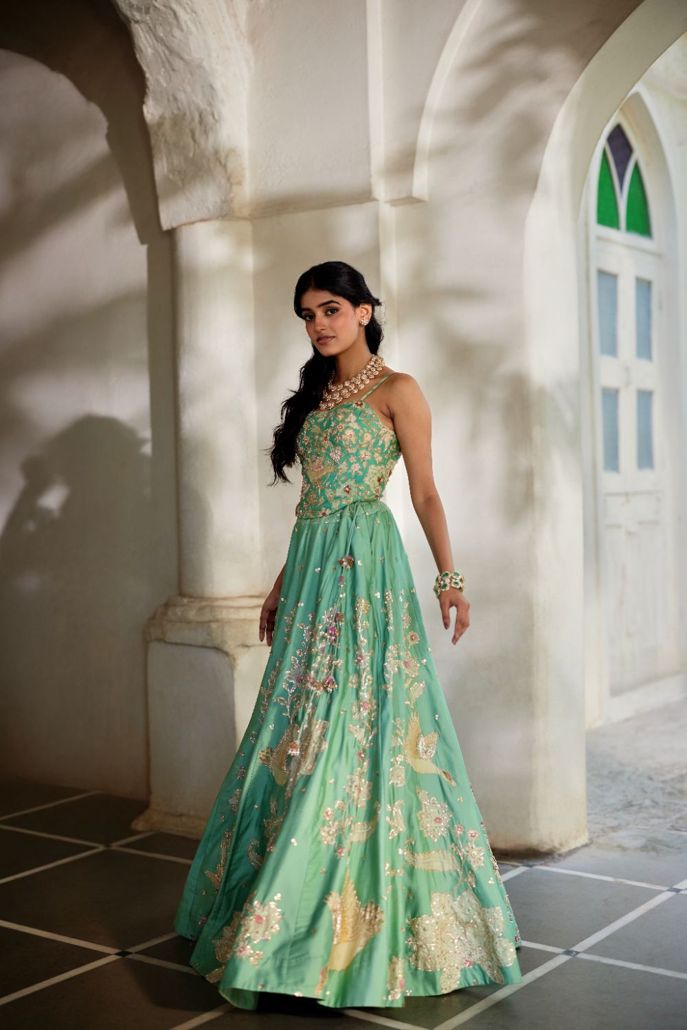 Every collection begins long before the garment is stitched: months of research into India’s rich craft traditions, followed by the painstaking creation of detailed illustrations. These artworks are then scanned, enhanced with jewel-toned palettes and touches of rich gold, and finally translated onto fabric. The result is a visual language so distinct that their name has become synonymous with print, colour, and the kind of glamour that still feels feather-light.