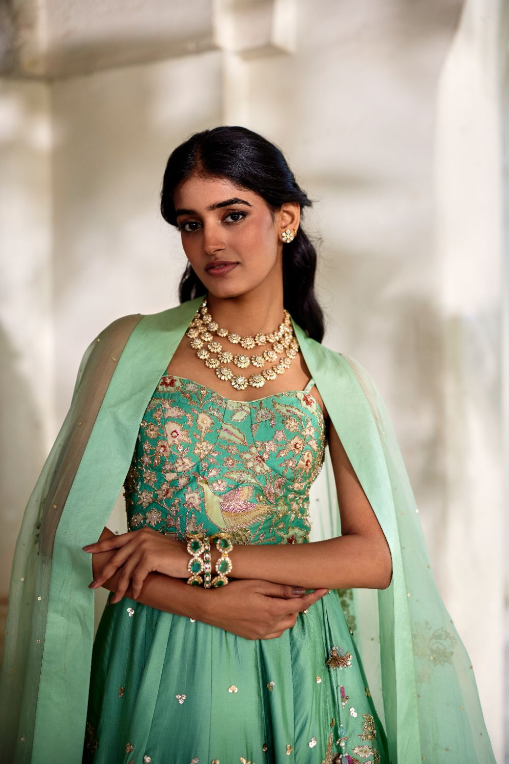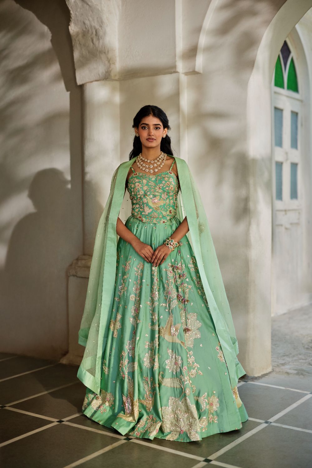 A silk lehenga featuring delicate floral prints enhanced with intricate aari, zardozi, and sequin hand-embroidery. Paired with a corset-fit blouse adorned with exquisite handwork, and a sheer organza triangular cape embellished with fine hand-embroidered accents.