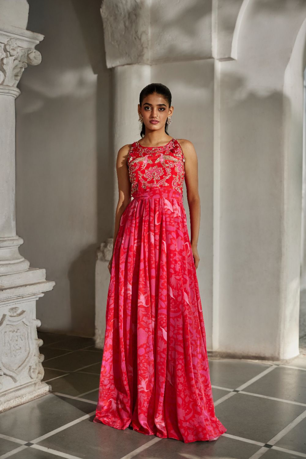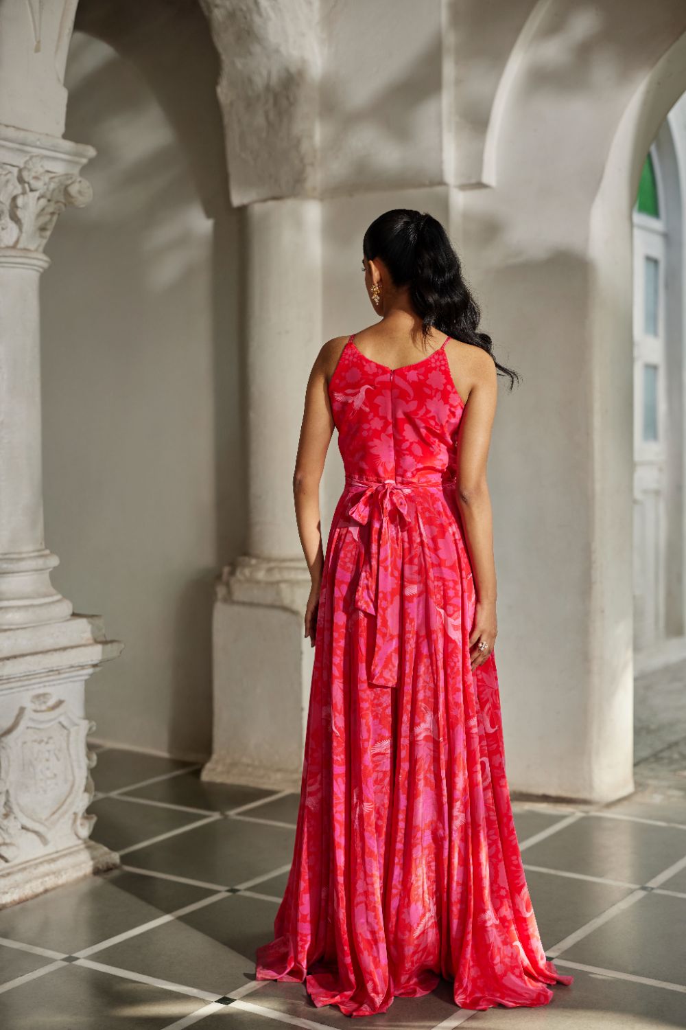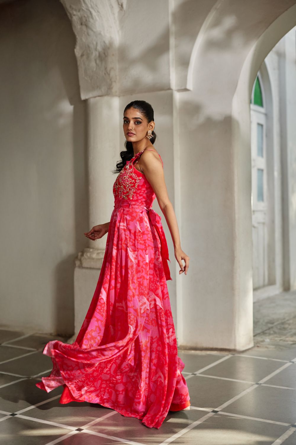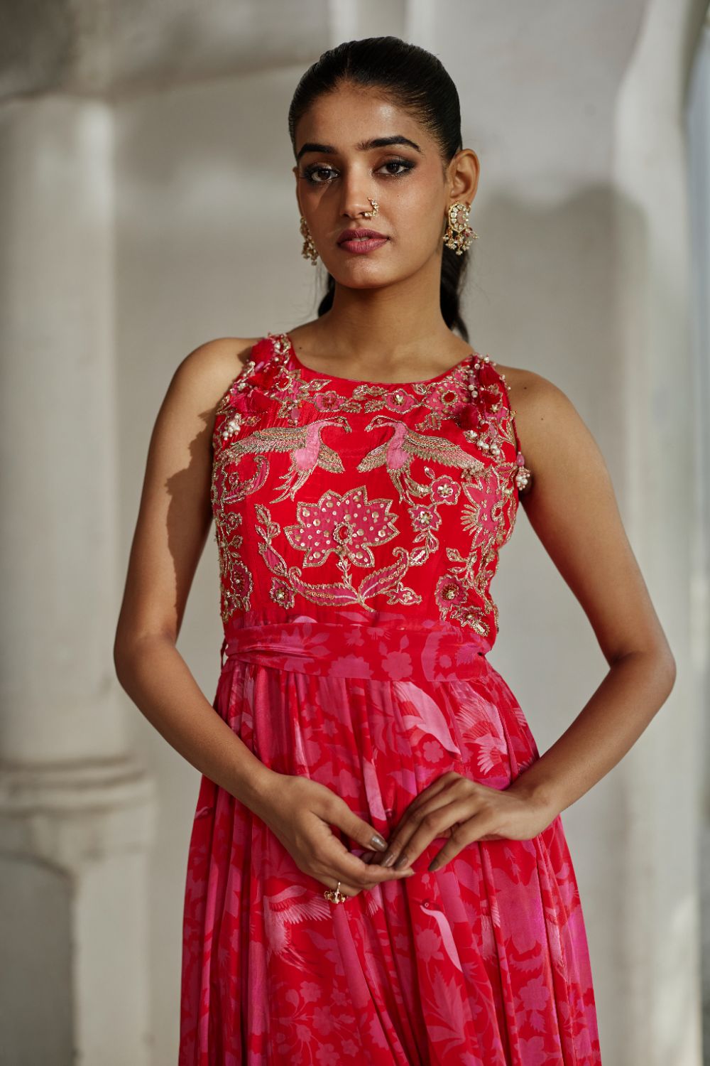 A striking red jumpsuit with a pink mono print, featuring a pair of birds in their enchanting habitat. The hand-embroidered yoke adds delicate craftsmanship, while the free-flowing silhouette in luxurious crepe fabric ensures comfort and elegance. Perfect for making a graceful statement at festive or semi-formal occasions.