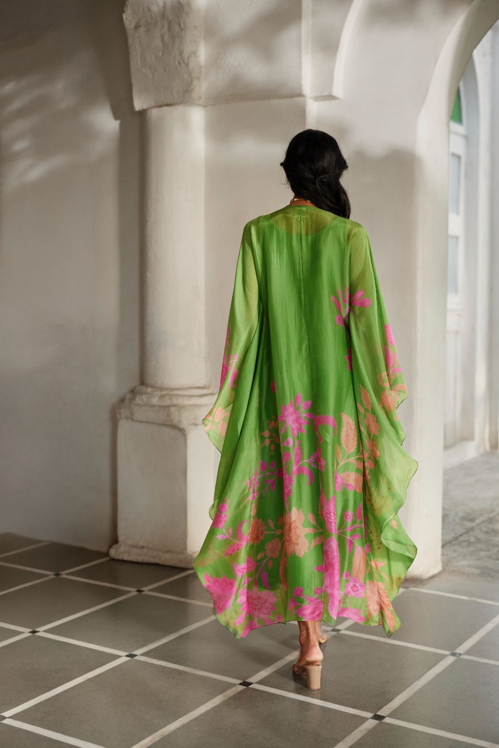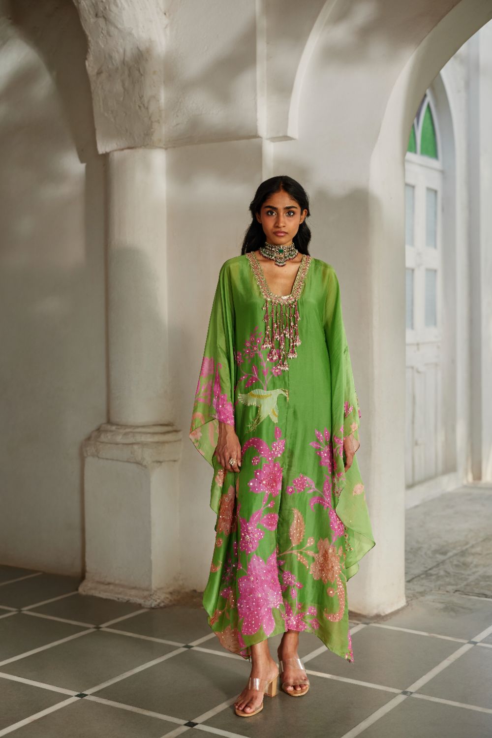 A breezy green floral printed kaftan adorned with delicate all-over embroidery for an effortless yet luxurious appeal. The heavily embroidered neckline adds a bold artisanal touch, while hand-tucked tassels bring movement and charm. Perfect for brunches, poolside parties, garden soirees, and casual festive gatherings.