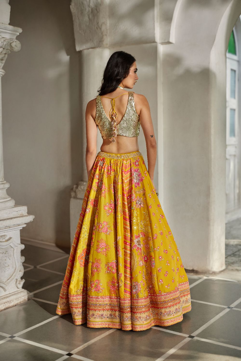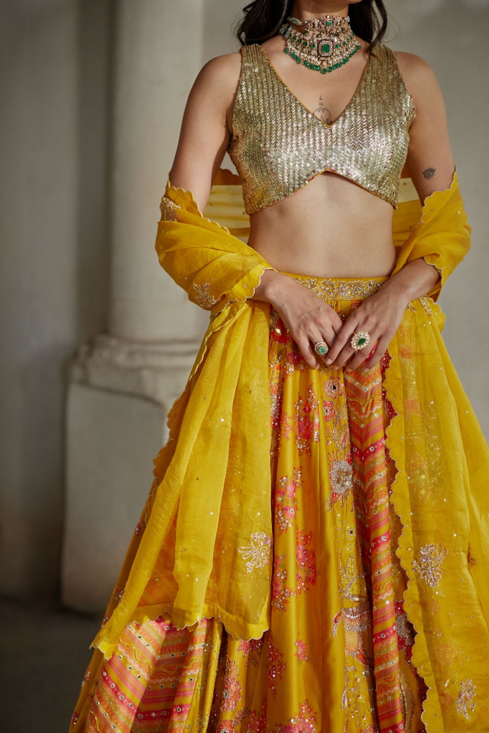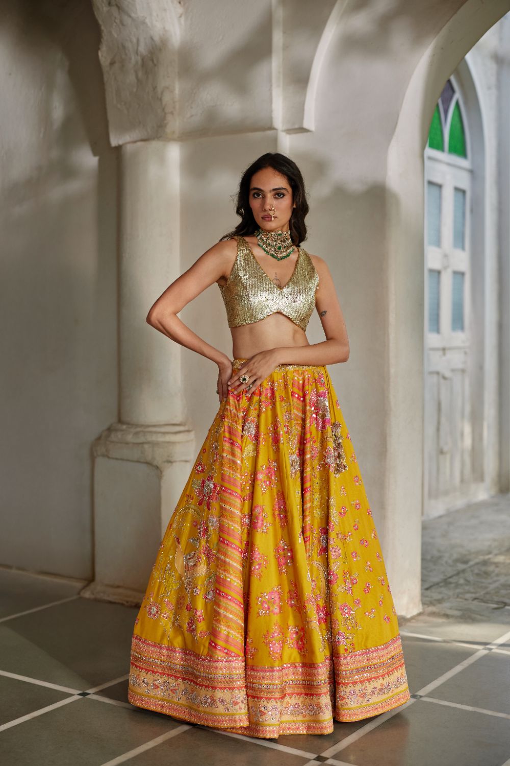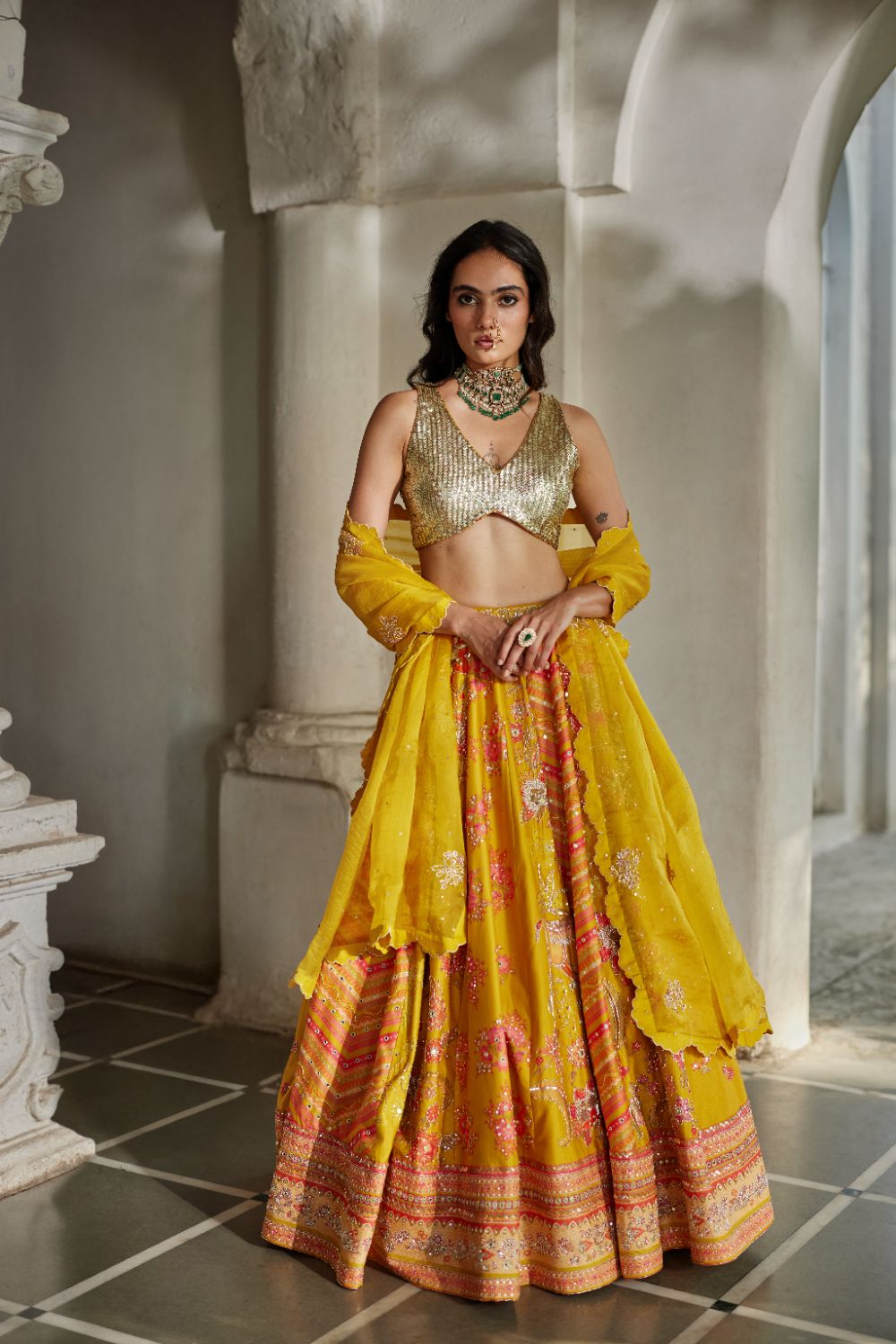 A yellow multi-tone lehenga showcasing ornamental signature floral prints that celebrate exquisite craftsmanship. Paired with an intricately hand-embroidered blouse and a delicate scallop-edged dupatta, also adorned with fine hand embroidery.