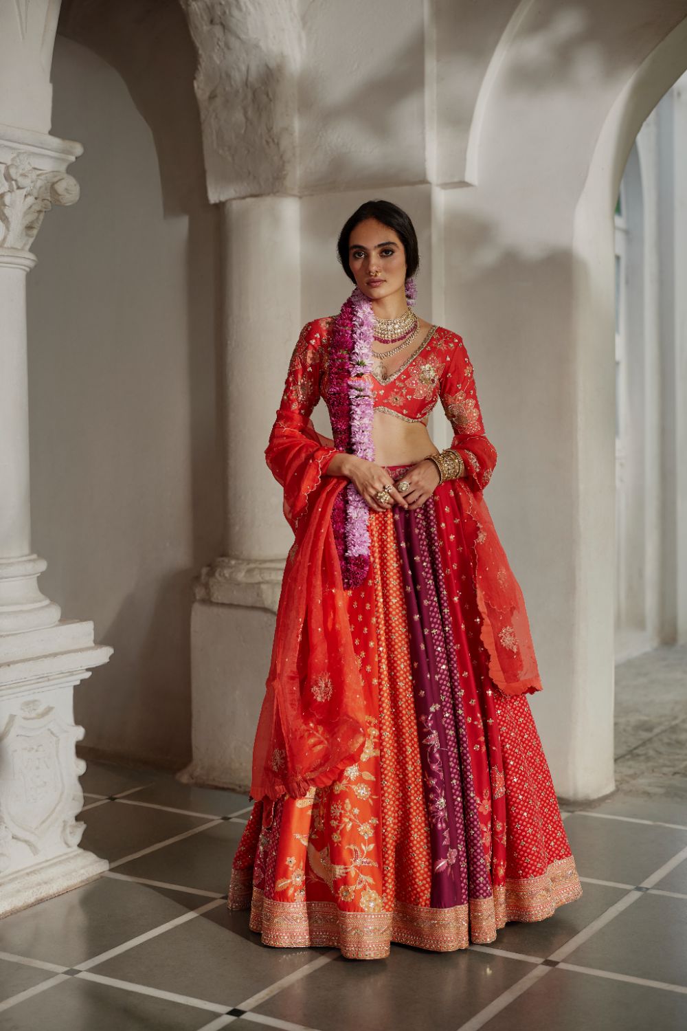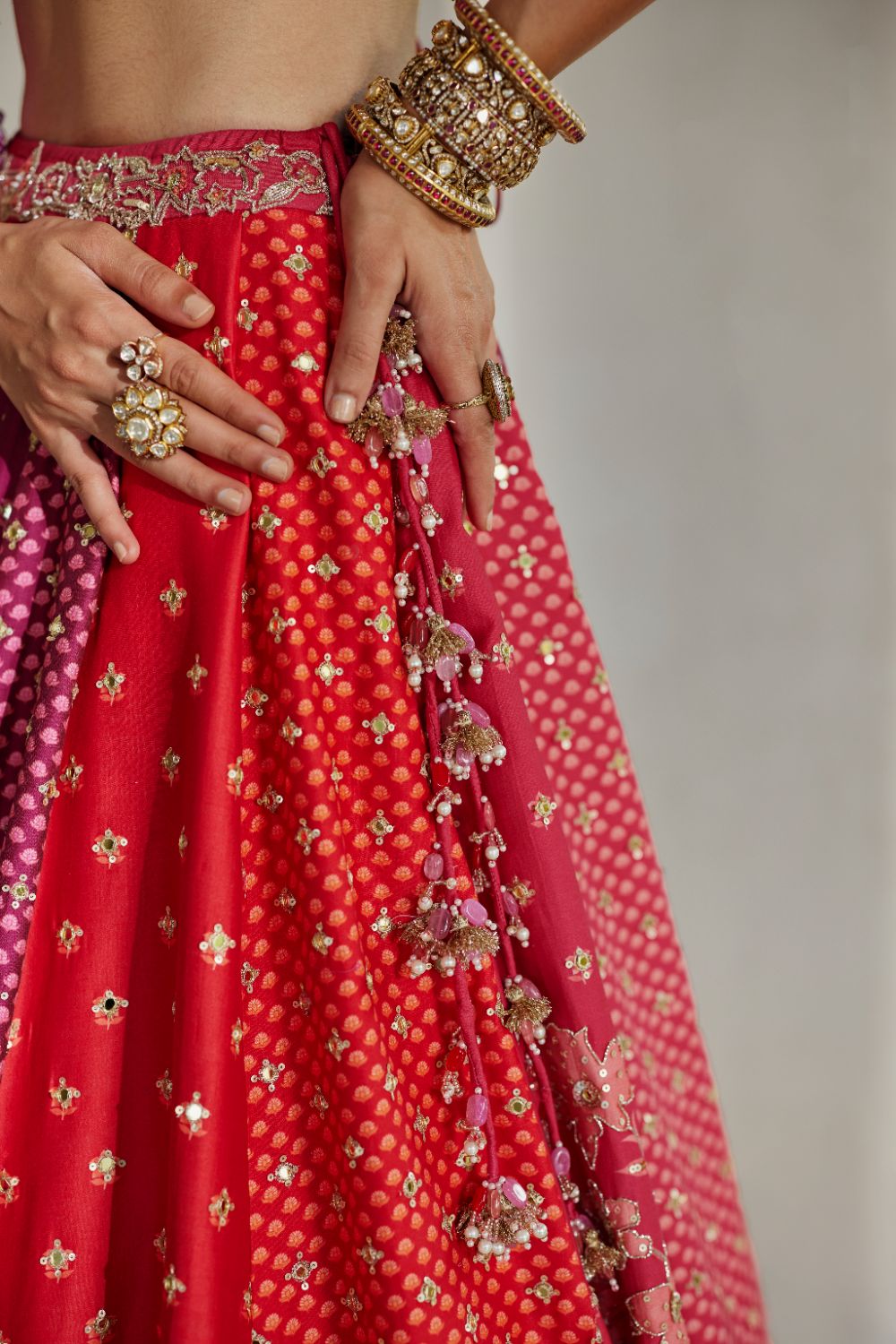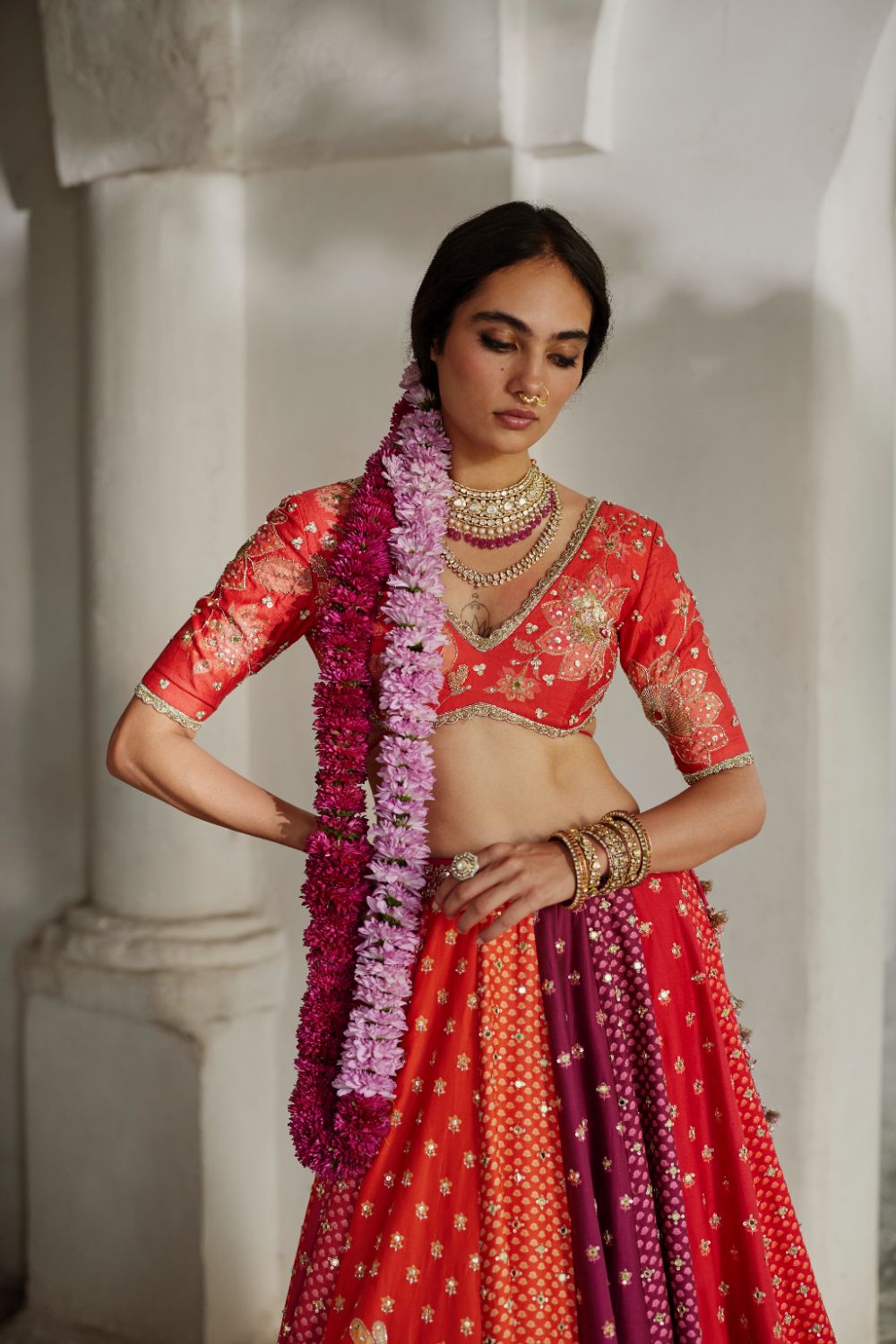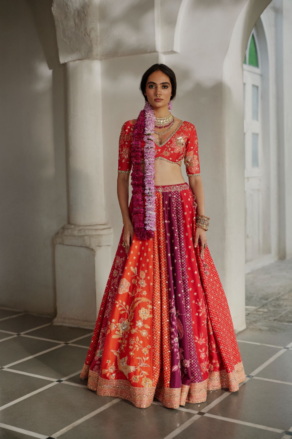 A vibrant lehenga set drenched in striking, festive hues, crafted from an exquisite blend of butis and floral prints. The lehenga features rich hand-embellishment with sequins, cutdana, zari, and resham work,capturing the spirit of grandeur. It is paired with a signature-cut statement blouse adorned with delicate hand embroidery, and completed with a scallop-edged net dupatta embellished with scattered buttis.