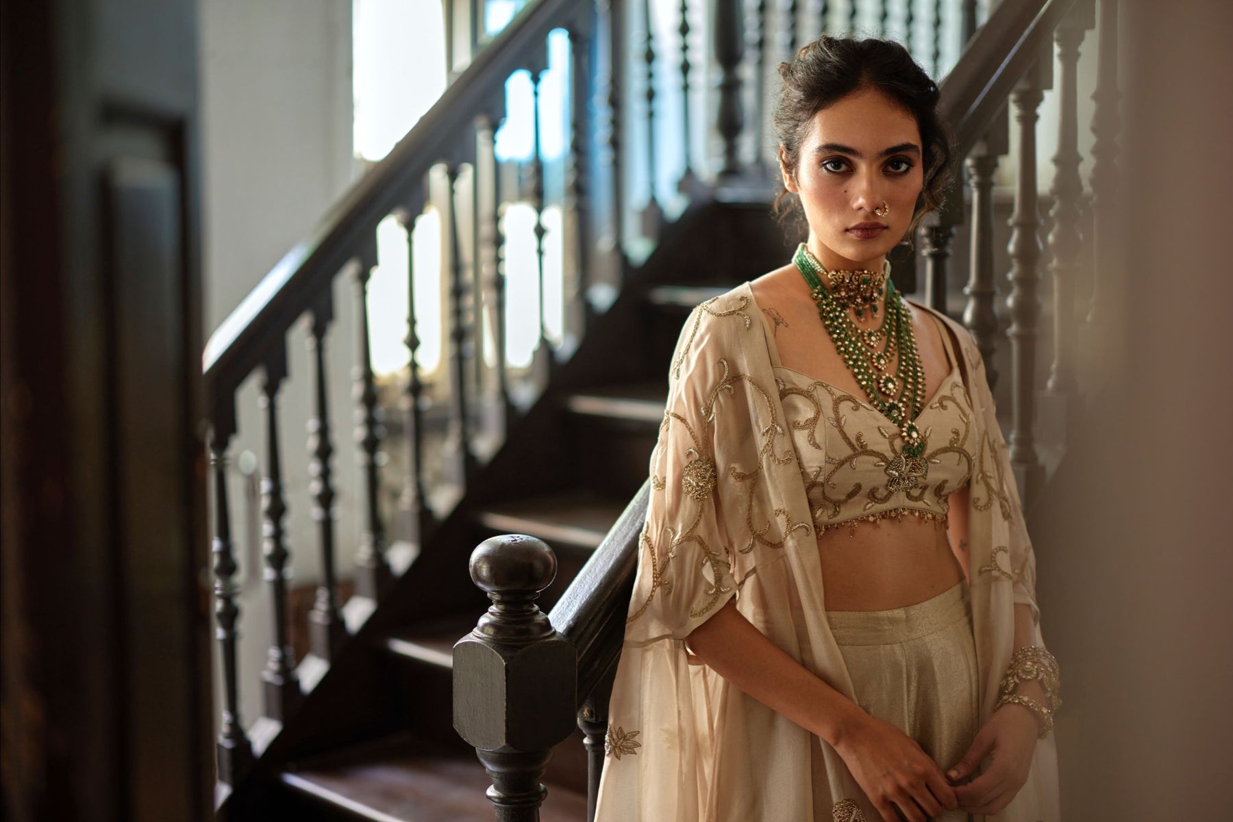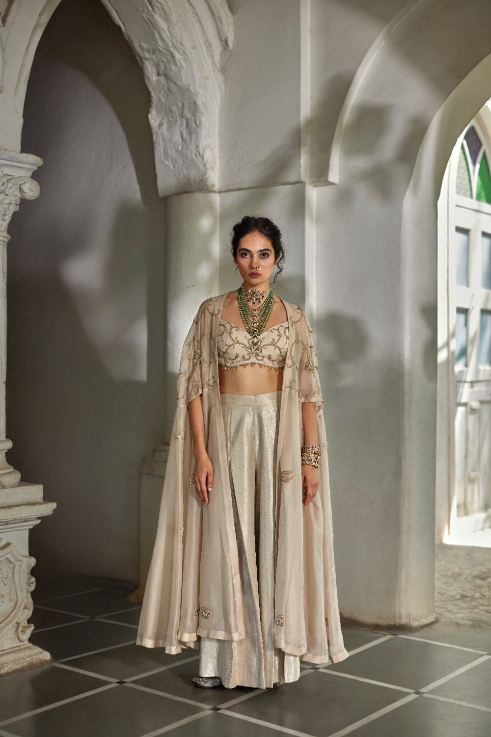 Create a statement of elegance ,this three-piece ensemble features a blouse adorned with intricate couchni embroidery with delicate waist hangings,paired with luxurious jamavar palazzos that exude regal charm. Completing the look is a pure organza cape, beautifully detailed with couchni and zardosi work that mirrors the blouse, creating a harmonious blend of tradition and contemporary sophistication.