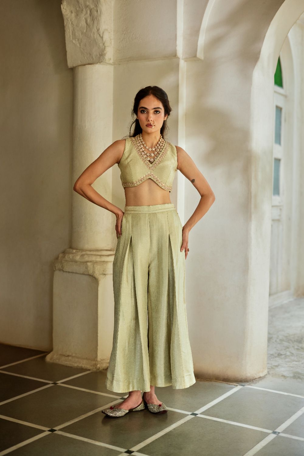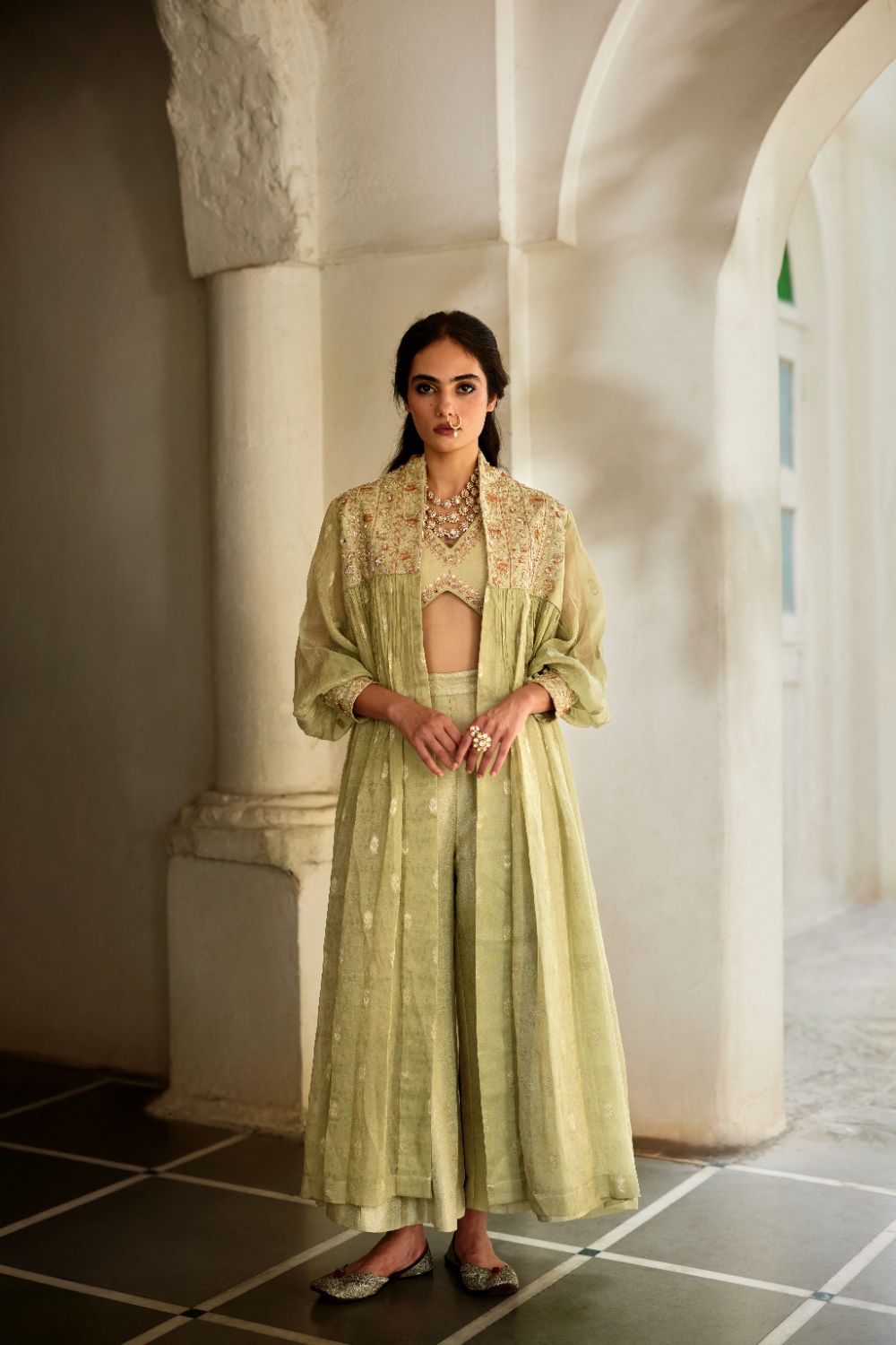 An elegant jamavar ensemble featuring a blouse and palazzo crafted from luxurious jamavar, with the blouse beautifully hand-embroidered for a refined finish. The look is elevated with a hand-woven tissue buti jacket, designed with an intricately embroidered jamavar yoke and cuffs. A rich blend of heritage textiles and artisanal detailing, perfect for festive occasions and sophisticated celebrations.
