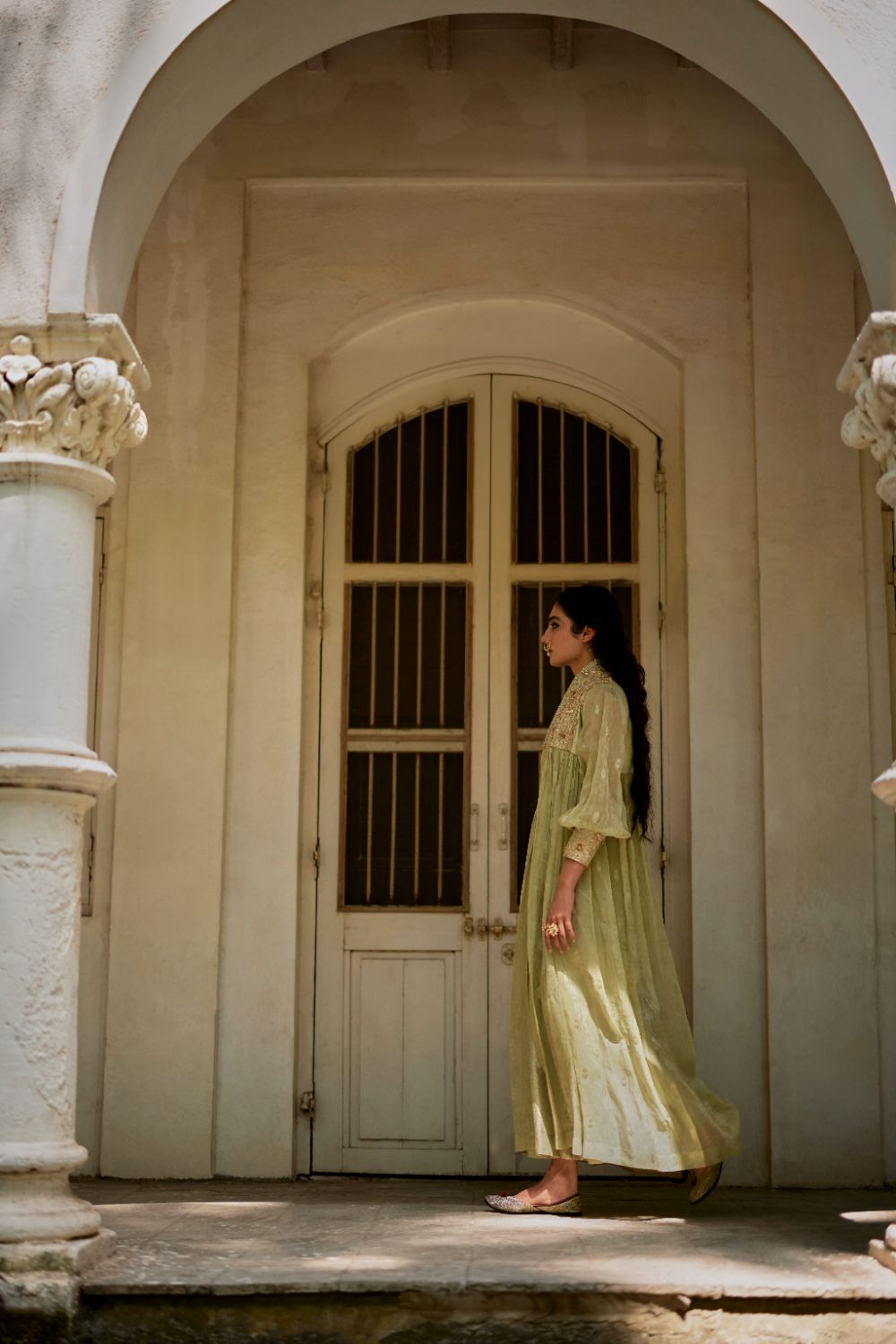 Every collection begins long before the garment is stitched: months of research into India’s rich craft traditions, followed by the painstaking creation of detailed illustrations. These artworks are then scanned, enhanced with jewel-toned palettes and touches of rich gold, and finally translated onto fabric. The result is a visual language so distinct that their name has become synonymous with print, colour, and the kind of glamour that still feels feather-light.