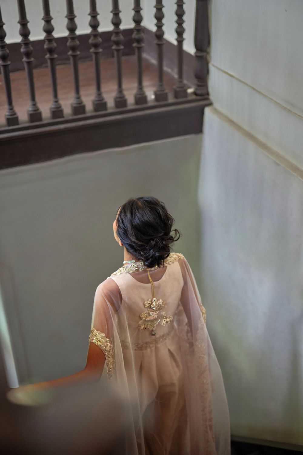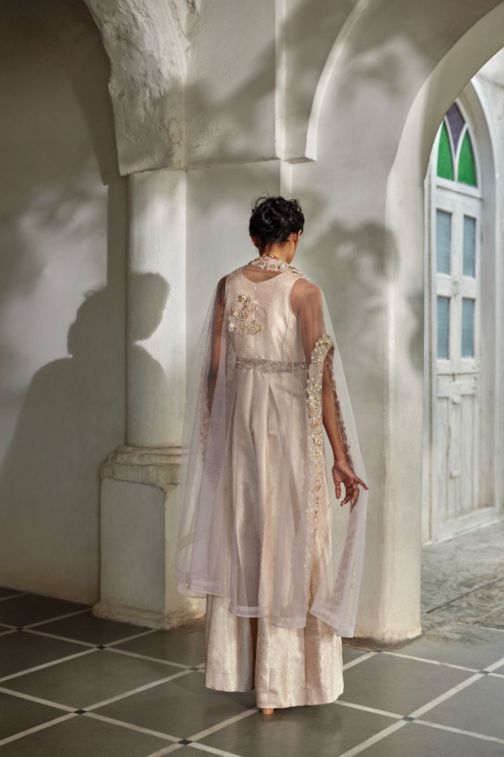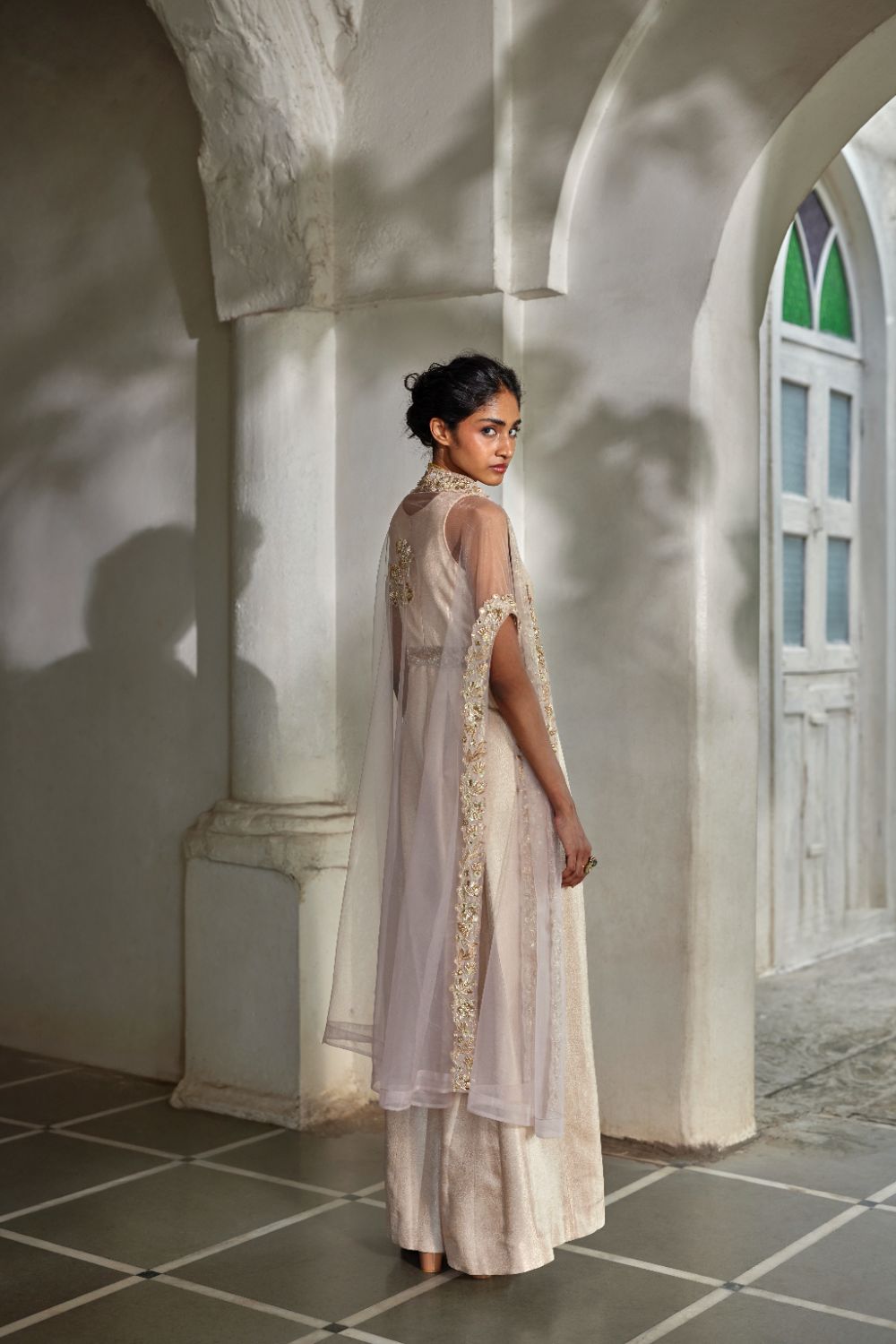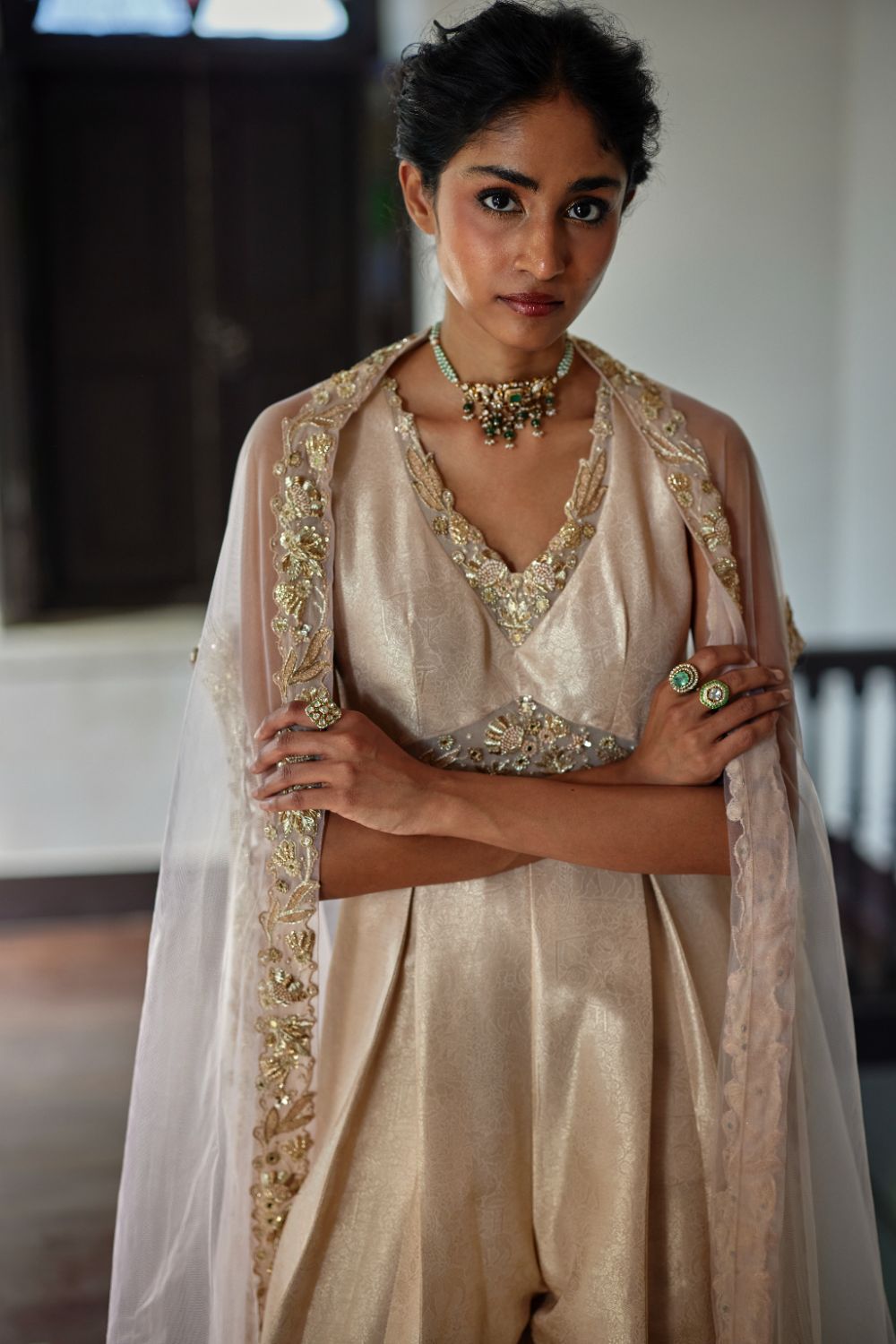 An exquisite jumpsuit ensemble in a soft dead rose tone, featuring intricate embroidery on the net waist and neckline. Paired with a hand-embroidered cape, this look beautifully blends modern sophistication with timeless elegance.