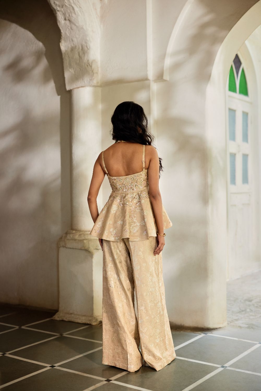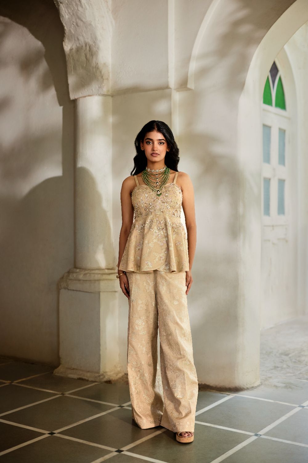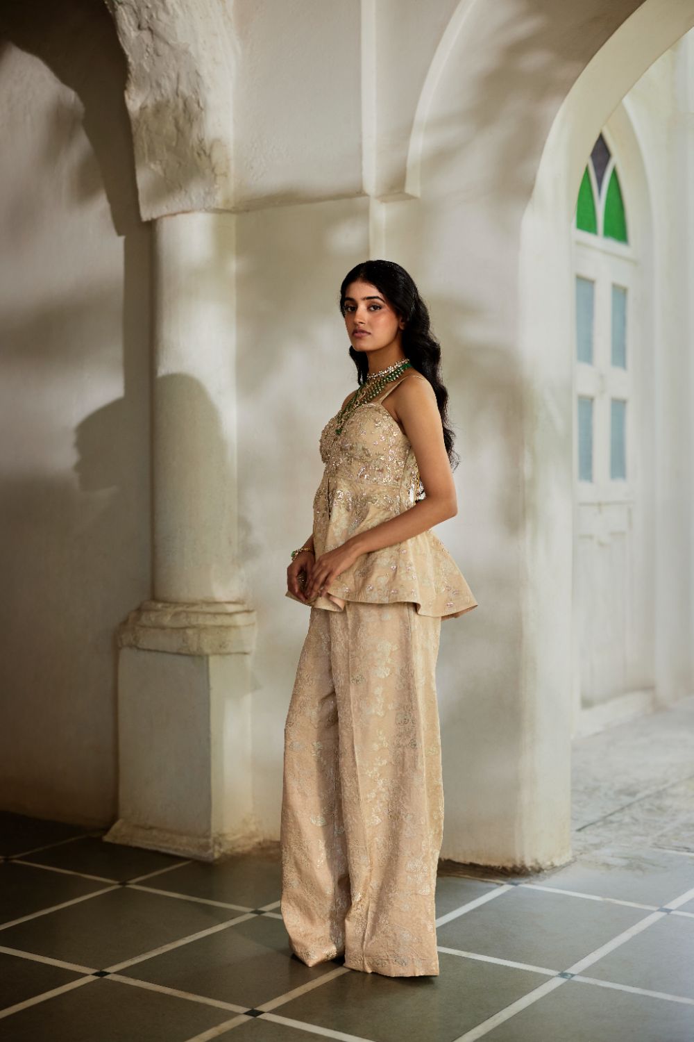 A graceful statement outfit in a jaquard, a peplum adorned with intricate hand embroidery paired with pants , perfect for festive gatherings and upscale celebrations.