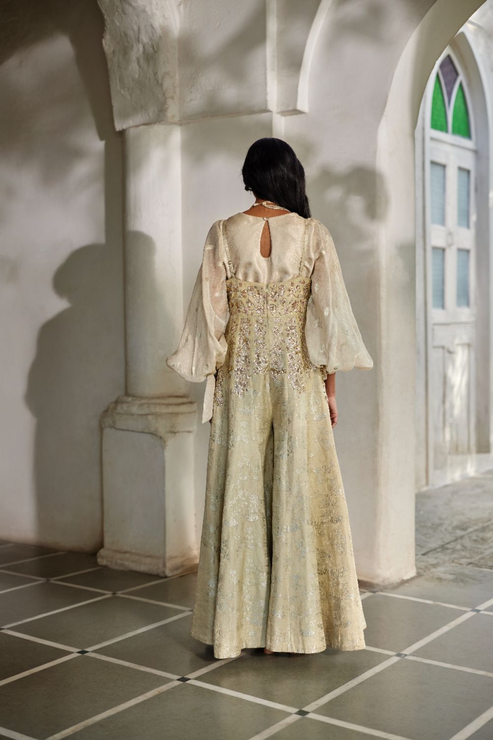 This silver jacquard jumpsuit showcases a sleek sleeveless silhouette for a contemporary, sophisticated look. The front yoke features intricate zardozi embroidery, cascading elegantly below to enhance the ensemble’s refined charm.
