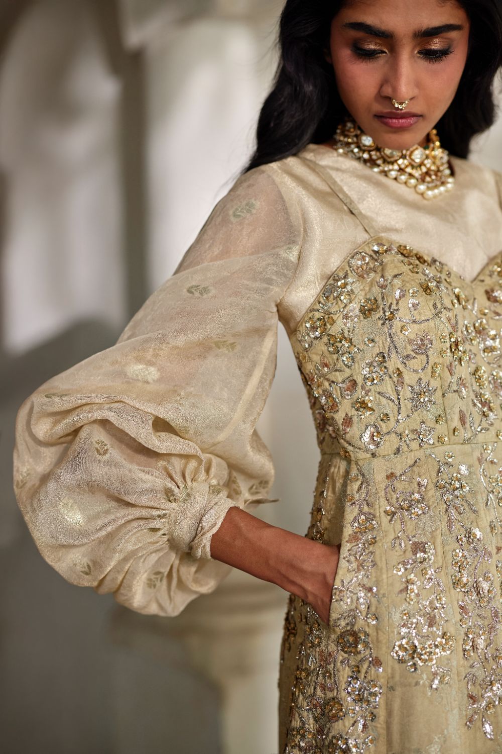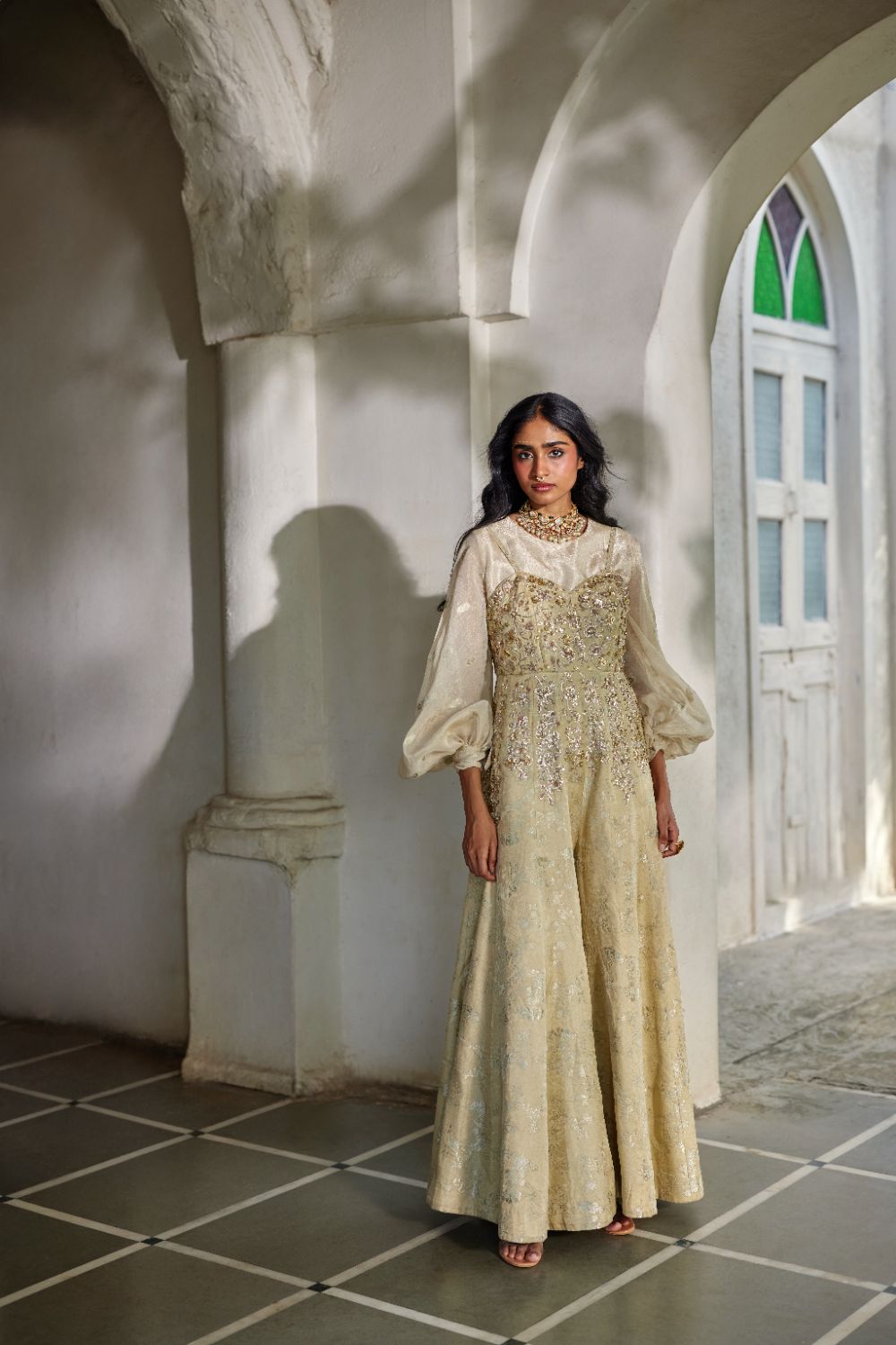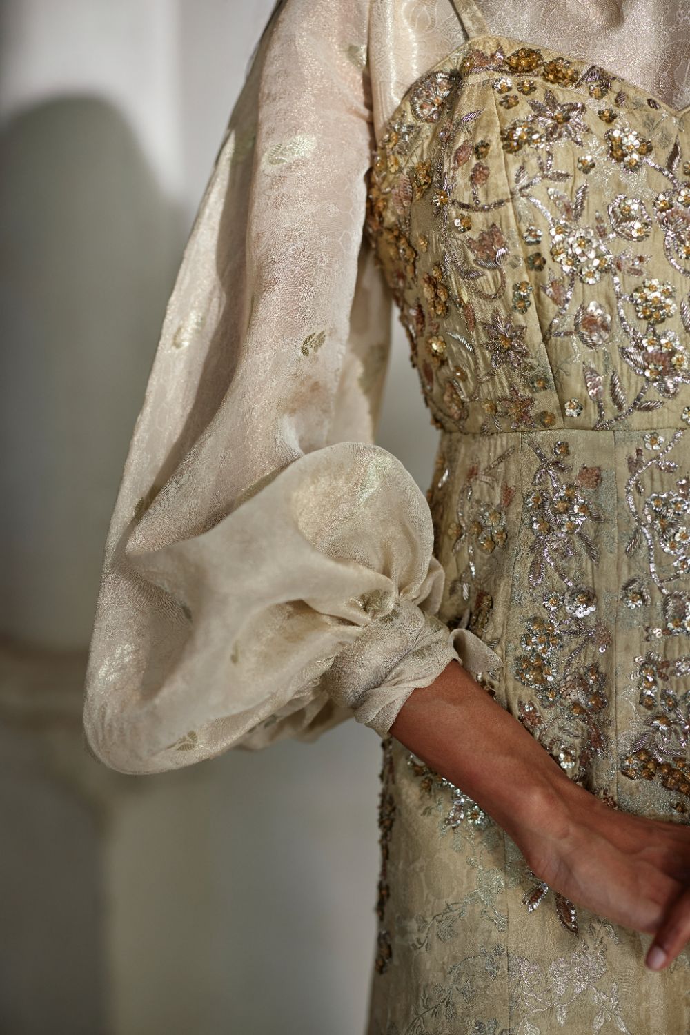 Every collection begins long before the garment is stitched: months of research into India’s rich craft traditions, followed by the painstaking creation of detailed illustrations. These artworks are then scanned, enhanced with jewel-toned palettes and touches of rich gold, and finally translated onto fabric. The result is a visual language so distinct that their name has become synonymous with print, colour, and the kind of glamour that still feels feather-light.