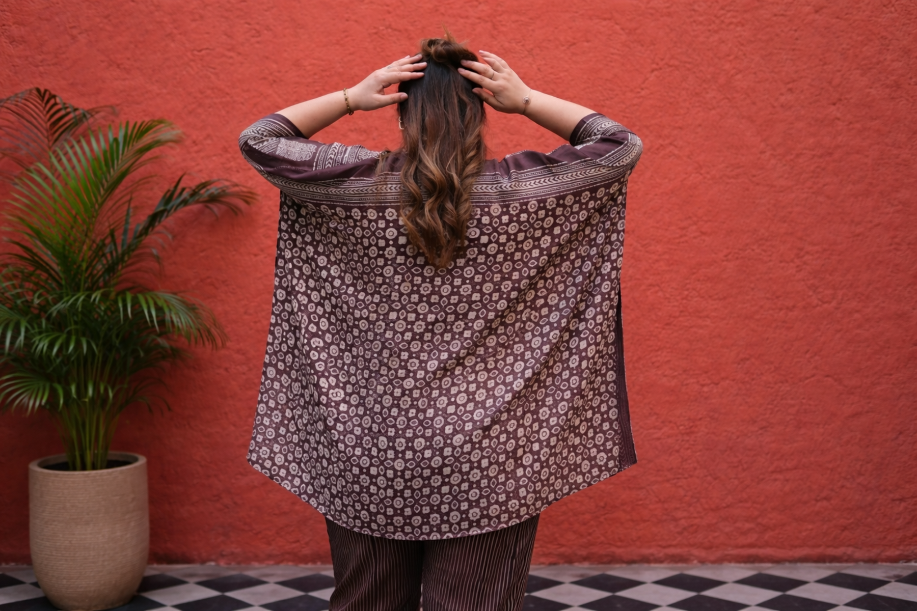 A breezy loose-fit button-down top featuring traditional Ajrakh motifs in earthy brown tones, styled with matching striped pants for a coordinated, effortless look.Model height is 5'5" and is wearing a size L–XL.