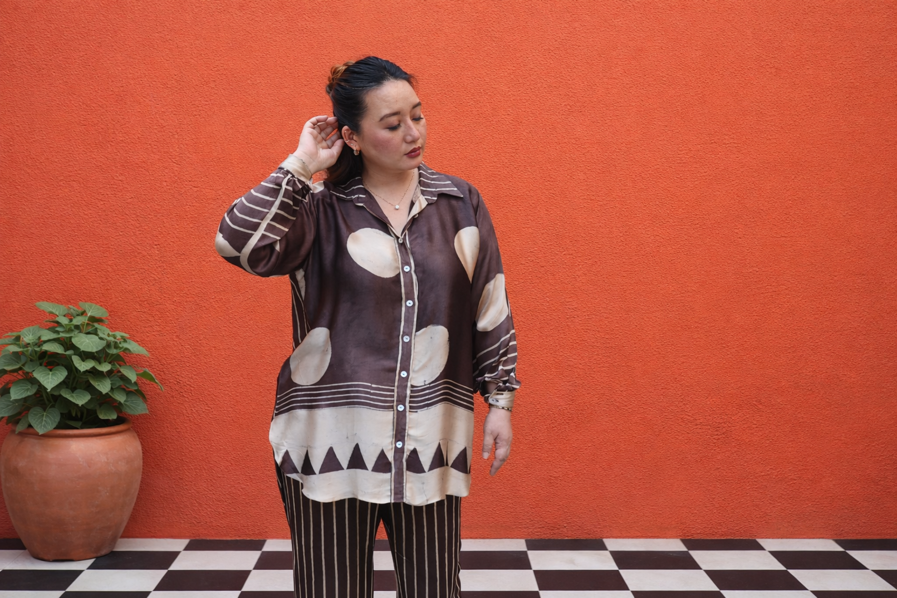A fluid, free-flowing Hi Low top with statement sleeves, showcasing earthy brown and beige stripes accented with geometric circular motifs. Styled with relaxed, wide-legged pants for a contemporary silhouette and effortless comfort. Model height is 5'5" and is wearing a size L–XL.